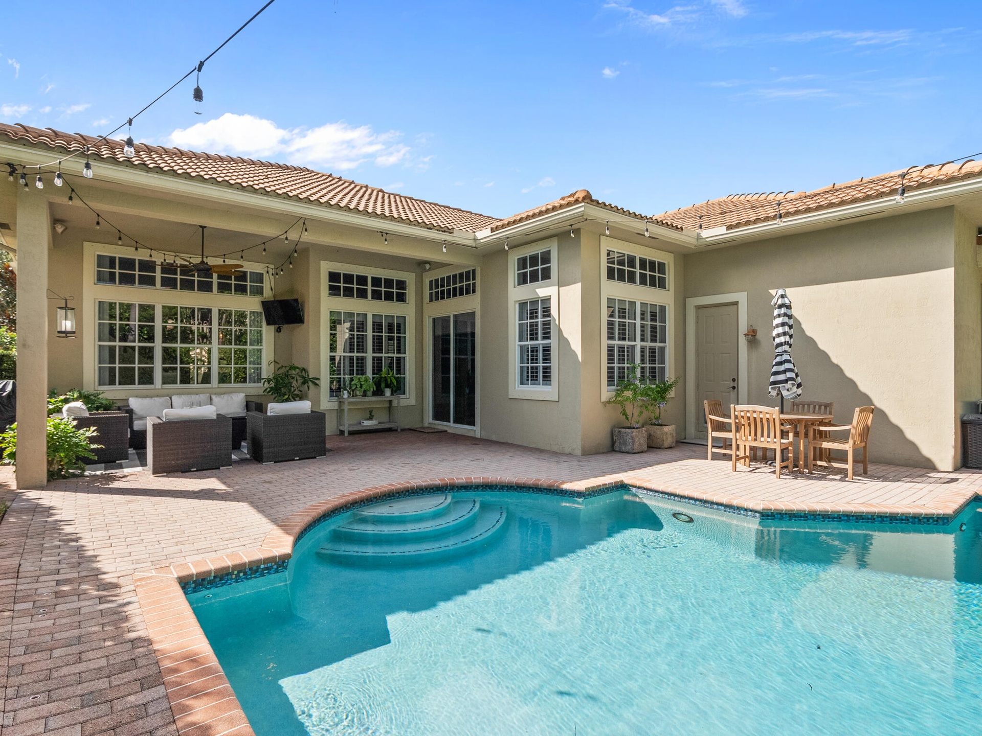 Welcome to your South Florida paradise retreat WITH A BRAND NEW ROOF. This beautifully maintained 5-bedroom 4.5 bathrooms pool home with a den and a loft offer over 3,500 sq. ft. of elegant living. Enter through etched double doors to soaring volume ceilings with crown molding, modern lighting, wrought iron staircase with tile and wood floors. The traditional floor plan features a formal living and dining room perfect for a family gatherings. Gourmet kitchen with tall wood cabinets , granite counters, stainless steel appliances, double wall ovens and a wine refrigerator. A eat in breakfast area which opens to the family room, giving seamless access to the covered patio and pool. The luxurious first-floor owner's suite boasts a spa-like bath and a giant walk-in closet with built-ins. Two additional bedrooms and a den are also on the main level, while upstairs offers two more bedrooms and a large loft/play area. Step outside to the lushly landscaped private backyard, ideal for entertaining with a covered patio and a sparkling freeform turquoise pool with spa. There is also an open paver patio for sunbathing or additional seating areas, a cabana bath, and a fully fenced yard. Located in the highly sought-after Paseos community with tree-lined streets, pool, playground, tennis courts, clubhouse, and green spaces, this home puts you in the heart of Jupiter—minutes from pristine beaches, world-clas