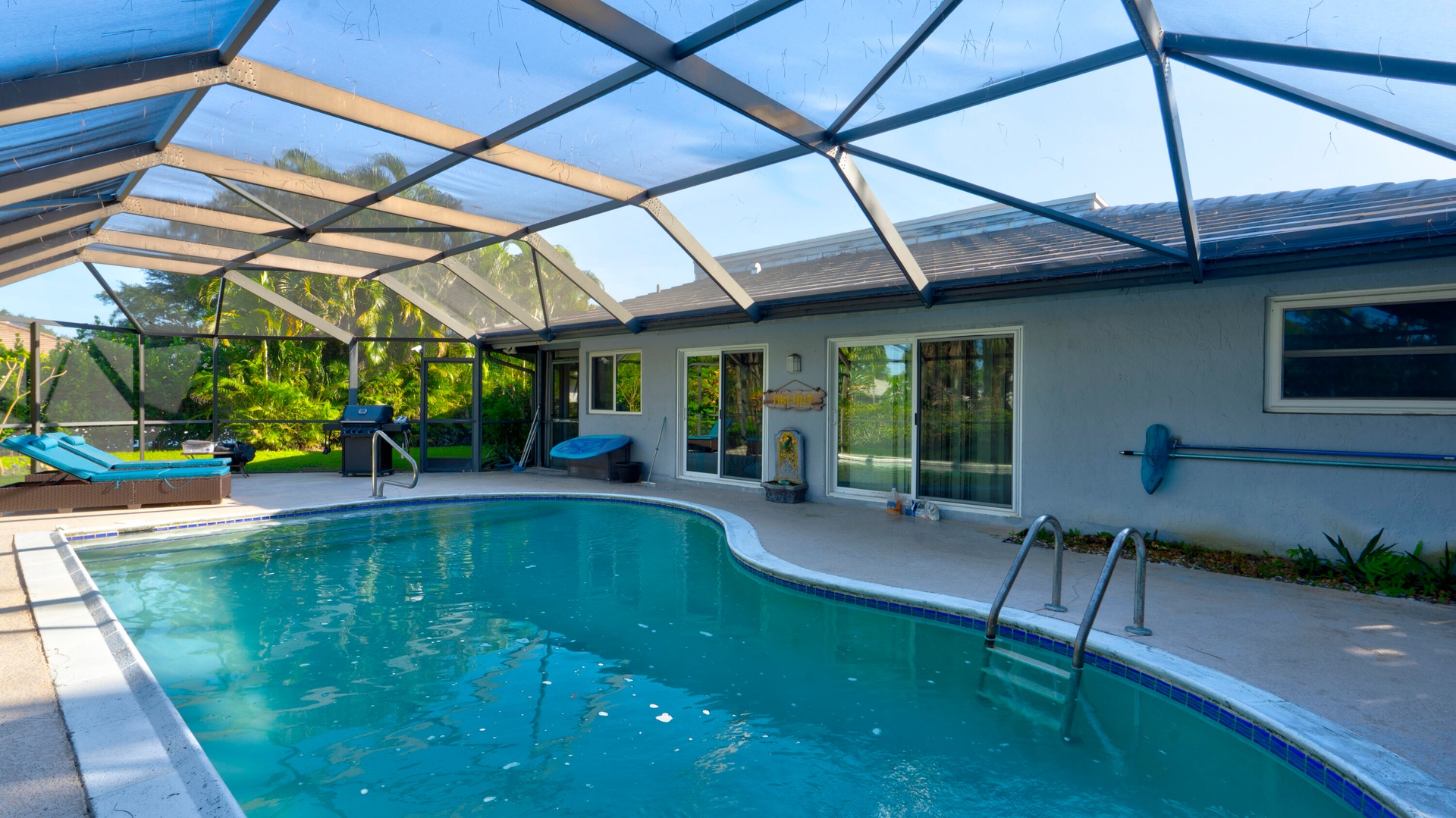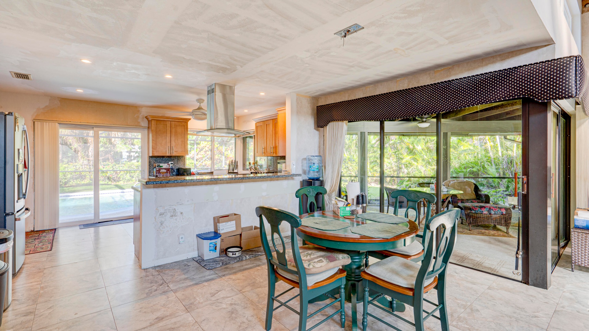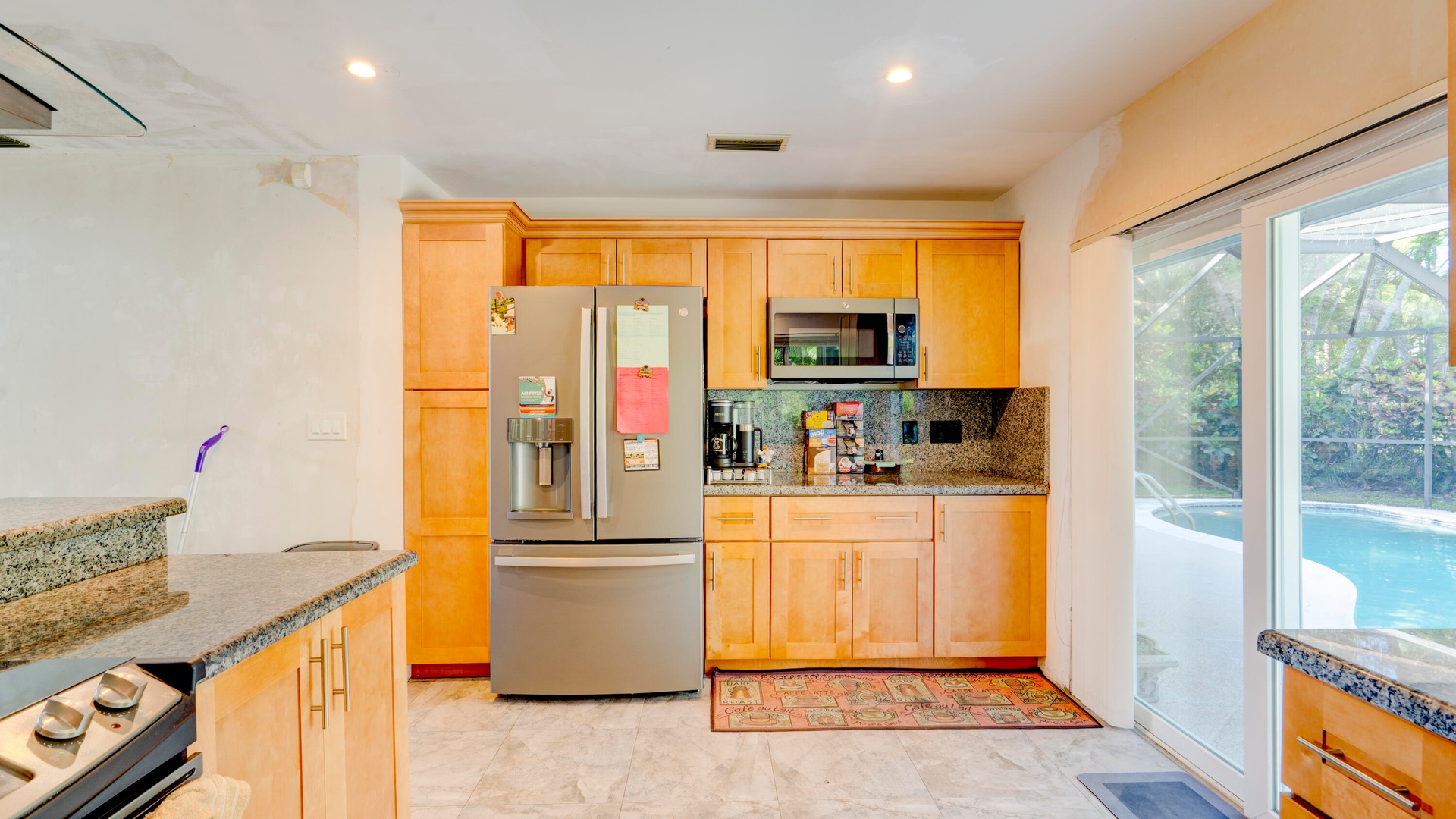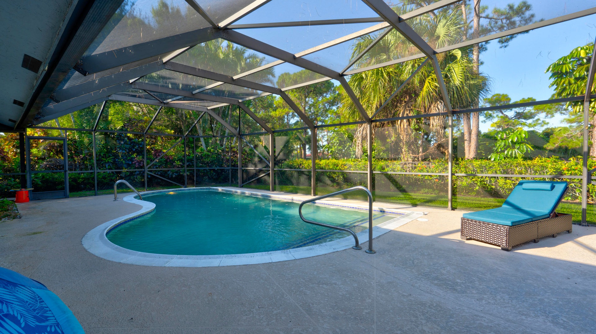 The living areas flow effortlessly to the outdoors through sliding glass doors that open to the pool and patio. A lanai with screened pool enclosure creates the perfect setting for all-weather barbecues, entertaining, or simply relaxing poolside. Beyond the pool, the backyard borders a peaceful bird sanctuary, where the sounds of chirping birds and a variety of local wildlife bring nature to your doorstep. Recent renovations add tremendous value and peace of mind. In 2025, a new refrigerator was installed (still under warranty). Major updates in 2023 include a brand-new kitchen, new roof, gutters, tile flooring (with additional tiles available for finishing the bathrooms), impact windows by Storm Tight in all windows with exception of the patio and dining room sliders which are protected by the lania and the surrounding roladens. In 2021 both HVAC and water heater was installed and The pool was resurfaced in 2020, pool heater added in 2023, ensuring years of enjoyment ahead. This thoughtfully updated home combines modern conveniences with seamless indoor-outdoor living, and an opportunity to still make this your very own masterpiece, like an open canvass where your imaginantion is then the only limitation! This serene natural backdrop is a rare opportunity within the prestigious Seagate Golf Club at the Hamlet community.