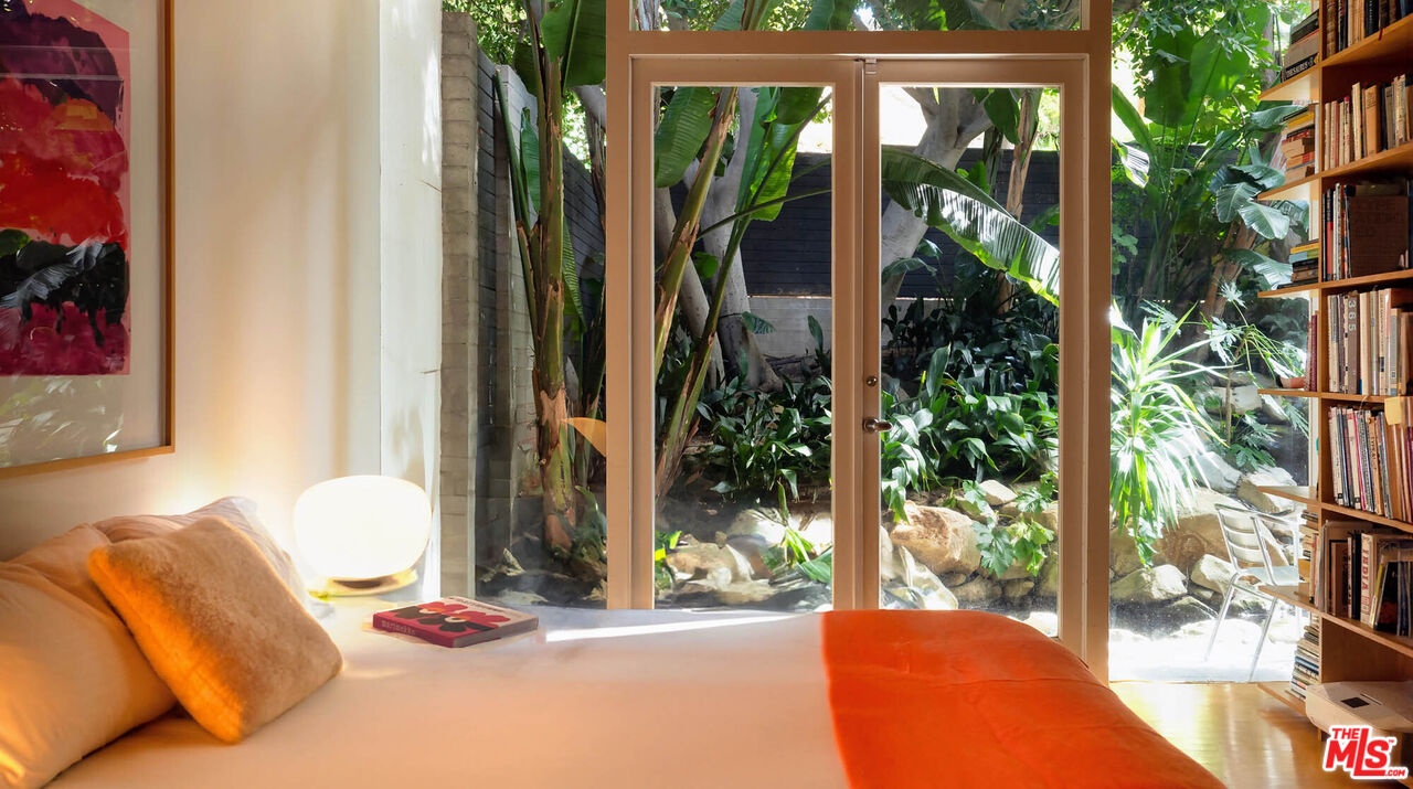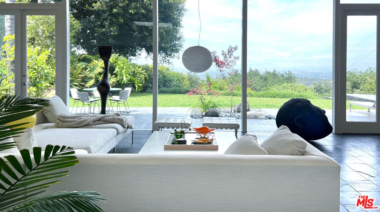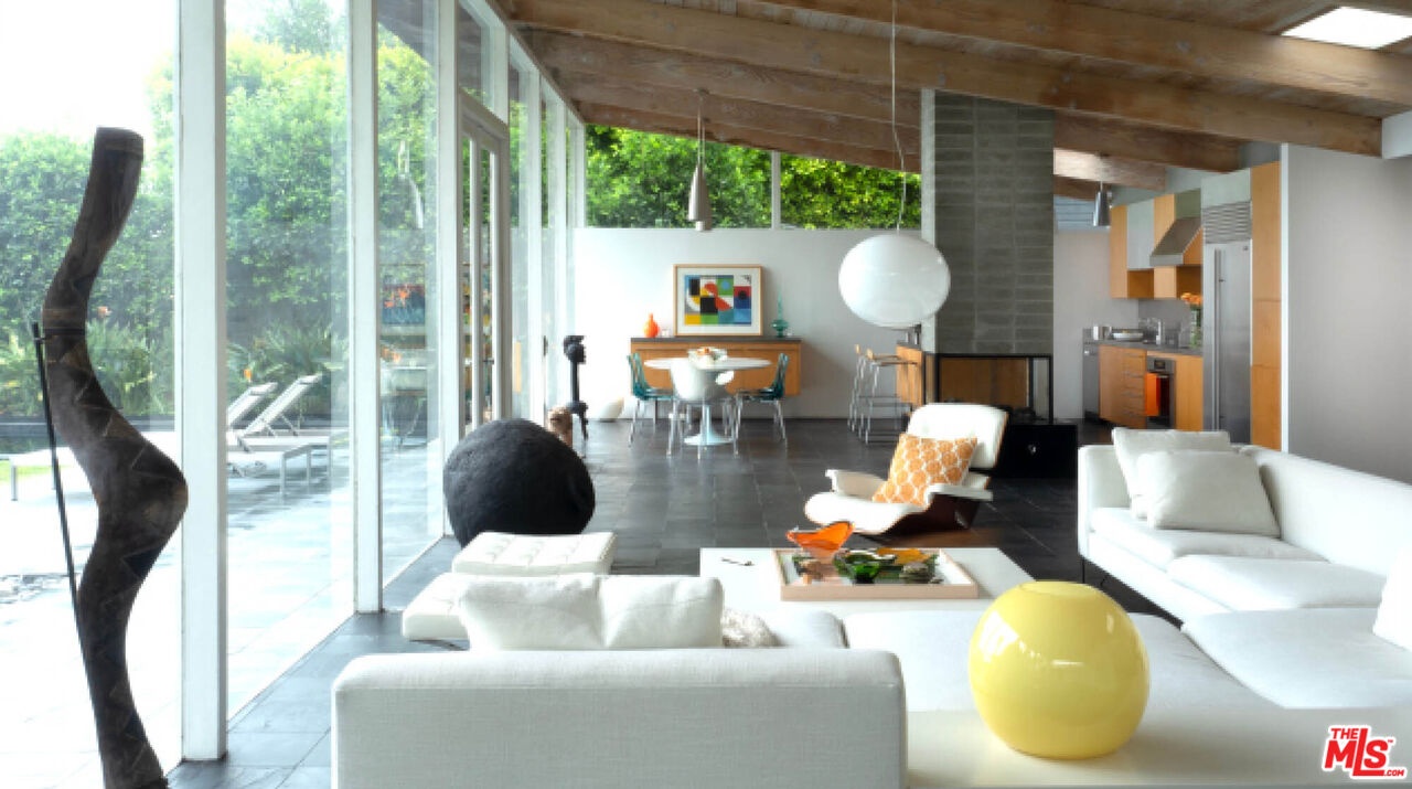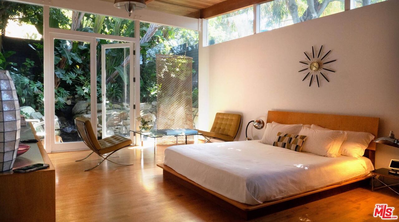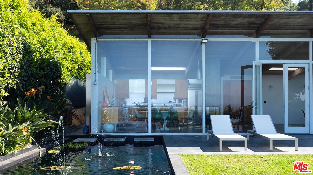 Rodney Walker, architect; 1951. One of the most consequential names of Mid-Century Modernism, Walker contributed three built designs to the revered Case Study House program. No other architect had more. Located above Mulholland, up a serene private lane, located within an enclave of four houses Walker designed and built and one he called home (and he could have chosen anywhere).The house announces itself quietly. A sculptor's entry court. A stainless steel door framed by frosted glass and set into a grid of concrete block. No ornamentation. No apology. Pure Walker. The sense of remove from the city below is complete, while only five minutes away. This is a house that exists on its own terms, at its own altitude. Inside, the architecture does what Walker always intended: it gets out of the way. Floor-to-ceiling glass walls dissolve along the entire rear elevation, opening the living spaces onto a landscape that feels curated rather than merely planted. Japanese maple, birds of paradise, flowering perennials, a long, dark-bottomed reflecting pool with floating stone platforms that seems to merge with the sky at the horizon. The views from this elevation, over the treetops to sky, remind you exactly why you came up the lane in the first place. The great room is the heart of the home, and where the simplicity of the post and beam architecture is most evident. The kitchen is worthy of any master chef. Stainless countertops and backsplash, warm teak cabinetry, Sub-Zero refrigerator, full appliance suite. It functions the way Walker's houses always functioned; beautifully, without calling attention to itself. The primary bedroom is a sanctuary: warm oak floors, a fireplace, and glass doors that open directly to the garden and a private koi pond. The second bedroom, with its floor-to-ceiling built-in library wall, opens to the lush garden. Both bathrooms are modern and equally considered. The furnishings are equally as elevated, featuring pieces designed by several of the most notable designers of the time, including Eames, Miles van der Rohe, Saarinen, Nelson and Aarnio. This is not just a house. It's an opportunity to live in functional art.
