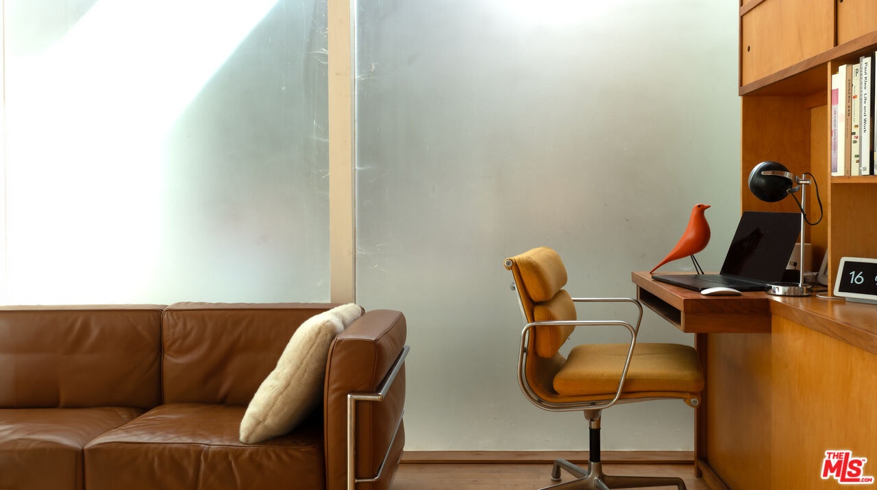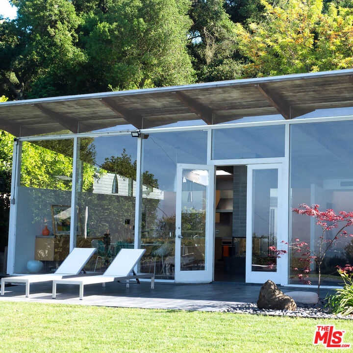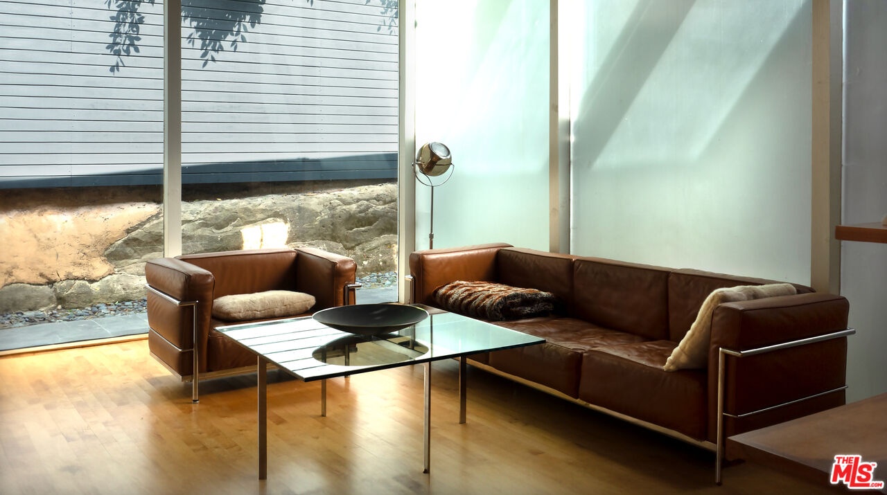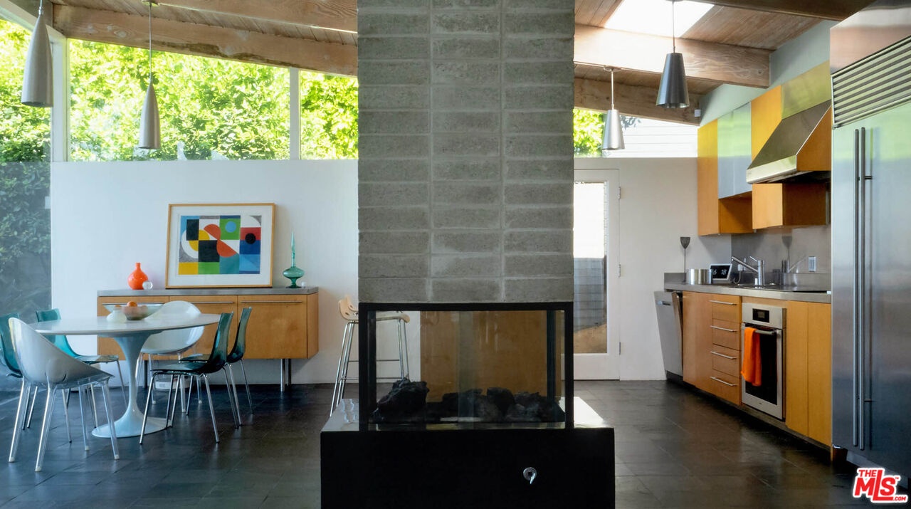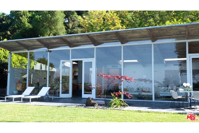 Rodney Walker, architect; 1951. One of the most consequential names of Mid-Century Modernism, Walker contributed three built designs to the revered Case Study House program. No other architect had more. Located above Mulholland, up a serene private lane, located within an enclave of four houses Walker designed and built and one he called home (and he could have chosen anywhere).The house announces itself quietly. A sculptor's entry court. A stainless steel door framed by frosted glass and set into a grid of concrete block. No ornamentation. No apology. Pure Walker. The sense of remove from the city below is complete, while only five minutes away. This is a house that exists on its own terms, at its own altitude. Inside, the architecture does what Walker always intended: it gets out of the way. Floor-to-ceiling glass walls dissolve along the entire rear elevation, opening the living spaces onto a landscape that feels curated rather than merely planted. Japanese maple, birds of paradise, flowering perennials, a long, dark-bottomed reflecting pool with floating stone platforms that seems to merge with the sky at the horizon. The views from this elevation, over the treetops to sky, remind you exactly why you came up the lane in the first place. The great room is the heart of the home, and where the simplicity of the post and beam architecture is most evident. The kitchen is worthy of any master chef. Stainless countertops and backsplash, warm teak cabinetry, Sub-Zero refrigerator, full appliance suite. It functions the way Walker's houses always functioned; beautifully, without calling attention to itself. The primary bedroom is a sanctuary: warm oak floors, a fireplace, and glass doors that open directly to the garden and a private koi pond. The second bedroom, with its floor-to-ceiling built-in library wall, opens to the lush garden. Both bathrooms are modern and equally considered. The furnishings are equally as elevated, featuring pieces designed by several of the most notable designers of the time, including Eames, Miles van der Rohe, Saarinen, Nelson and Aarnio. This is not just a house. It's an opportunity to live in functional art.