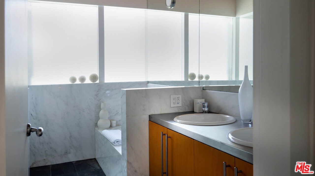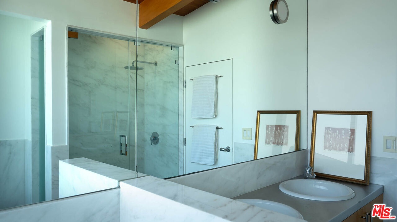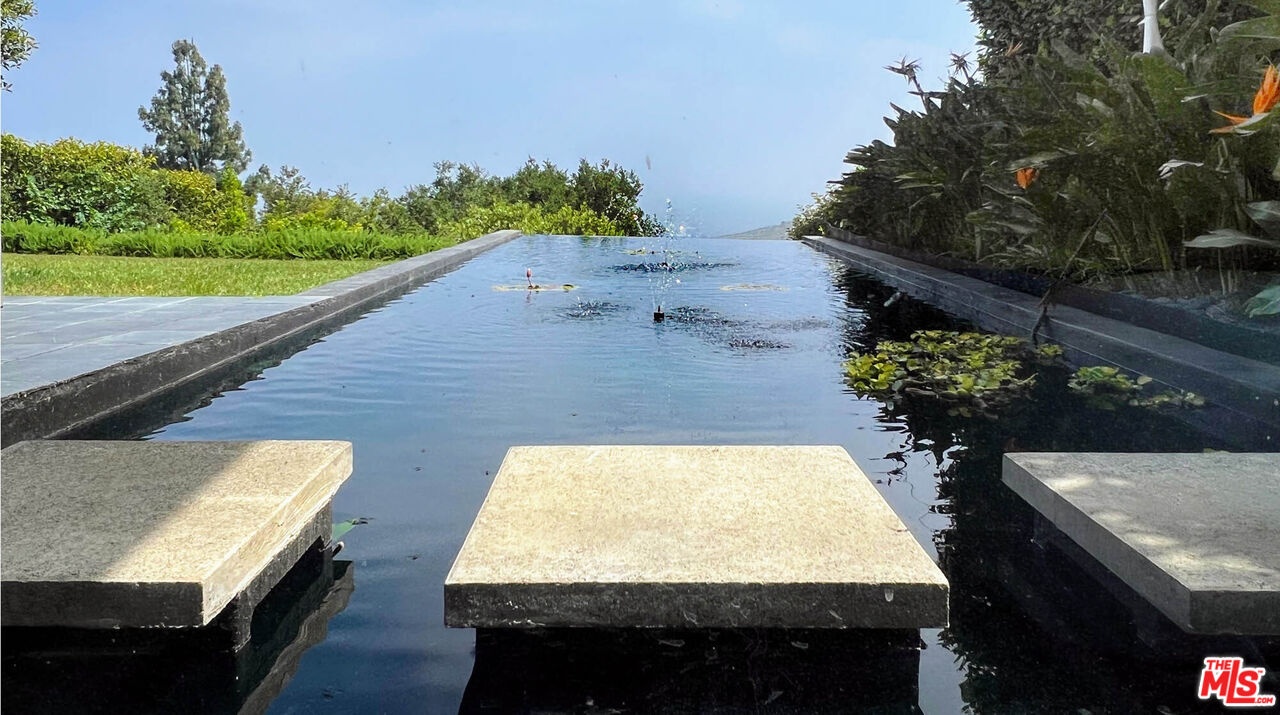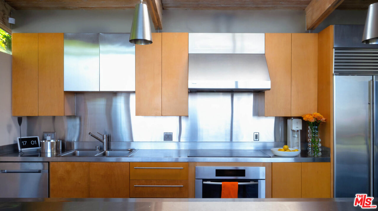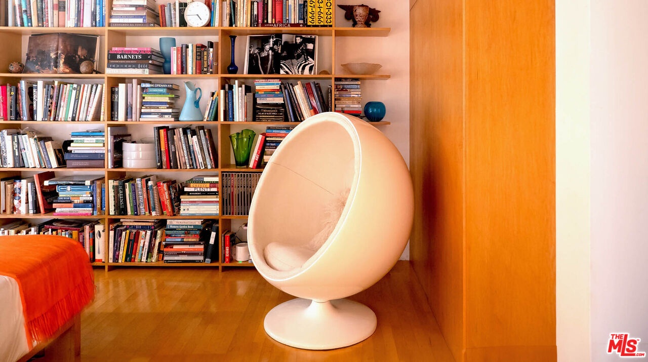 Rodney Walker, architect; 1951. One of the most consequential names of Mid-Century Modernism, Walker contributed three built designs to the revered Case Study House program. No other architect had more. Located above Mulholland, up a serene private lane, located within an enclave of four houses Walker designed and built and one he called home (and he could have chosen anywhere).The house announces itself quietly. A sculptor's entry court. A stainless steel door framed by frosted glass and set into a grid of concrete block. No ornamentation. No apology. Pure Walker. The sense of remove from the city below is complete, while only five minutes away. This is a house that exists on its own terms, at its own altitude. Inside, the architecture does what Walker always intended: it gets out of the way. Floor-to-ceiling glass walls dissolve along the entire rear elevation, opening the living spaces onto a landscape that feels curated rather than merely planted. Japanese maple, birds of paradise, flowering perennials, a long, dark-bottomed reflecting pool with floating stone platforms that seems to merge with the sky at the horizon. The views from this elevation, over the treetops to sky, remind you exactly why you came up the lane in the first place. The great room is the heart of the home, and where the simplicity of the post and beam architecture is most evident. The kitchen is worthy of any master chef. Stainless countertops and backsplash, warm teak cabinetry, Sub-Zero refrigerator, full appliance suite. It functions the way Walker's houses always functioned; beautifully, without calling attention to itself. The primary bedroom is a sanctuary: warm oak floors, a fireplace, and glass doors that open directly to the garden and a private koi pond. The second bedroom, with its floor-to-ceiling built-in library wall, opens to the lush garden. Both bathrooms are modern and equally considered. The furnishings are equally as elevated, featuring pieces designed by several of the most notable designers of the time, including Eames, Miles van der Rohe, Saarinen, Nelson and Aarnio. This is not just a house. It's an opportunity to live in functional art.