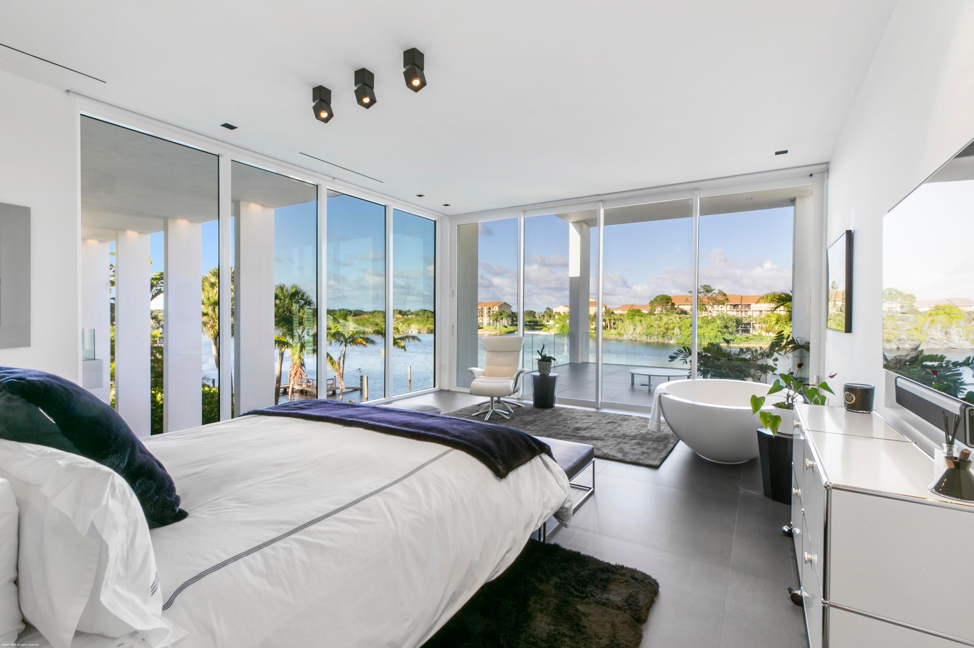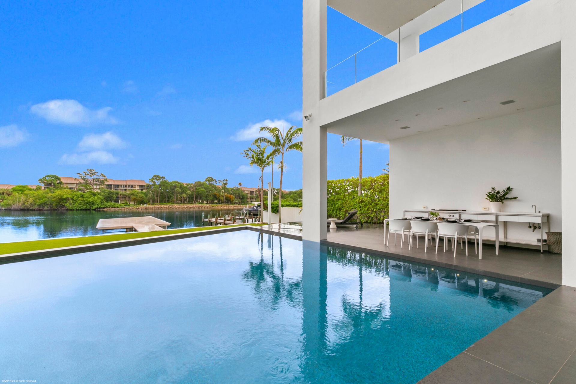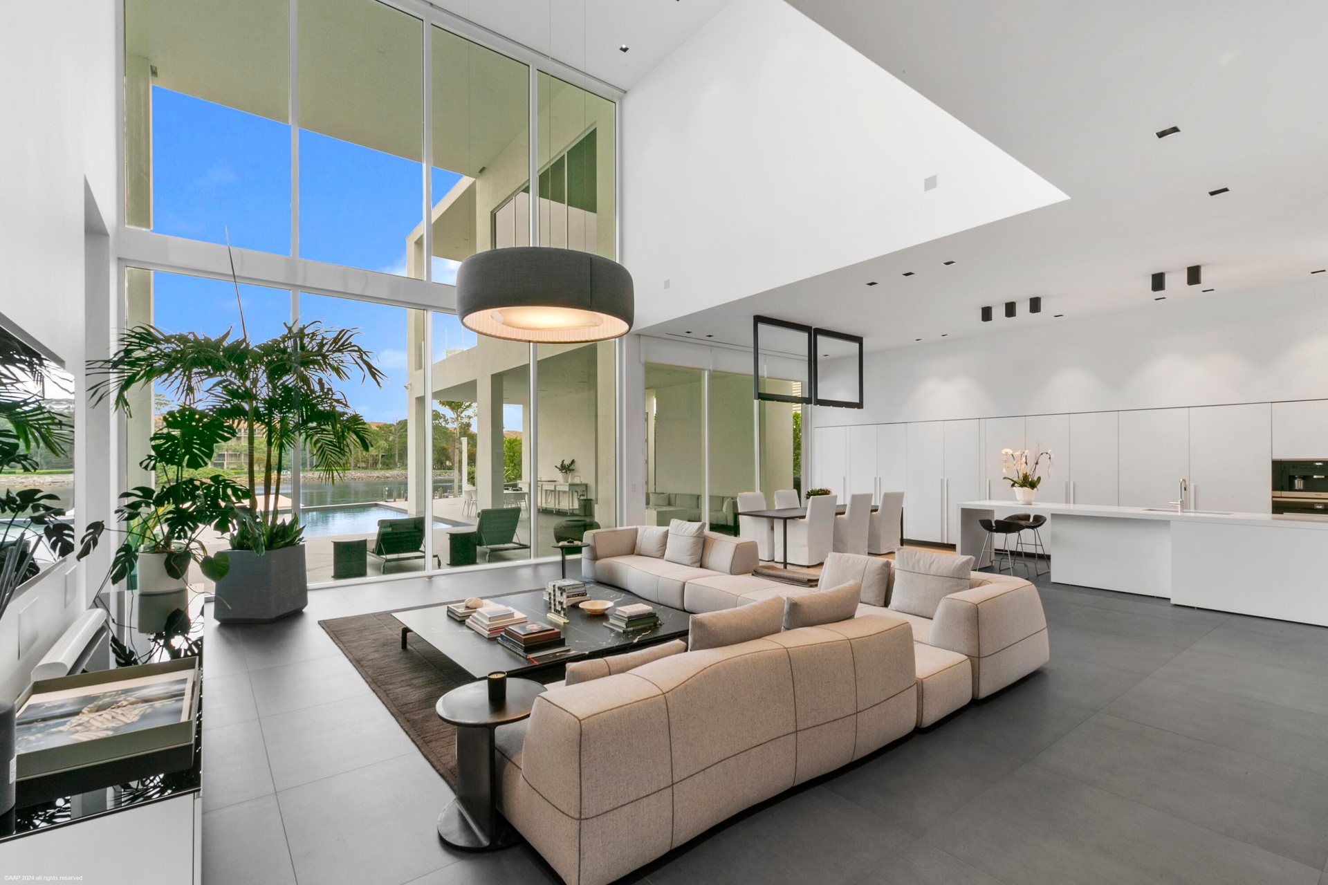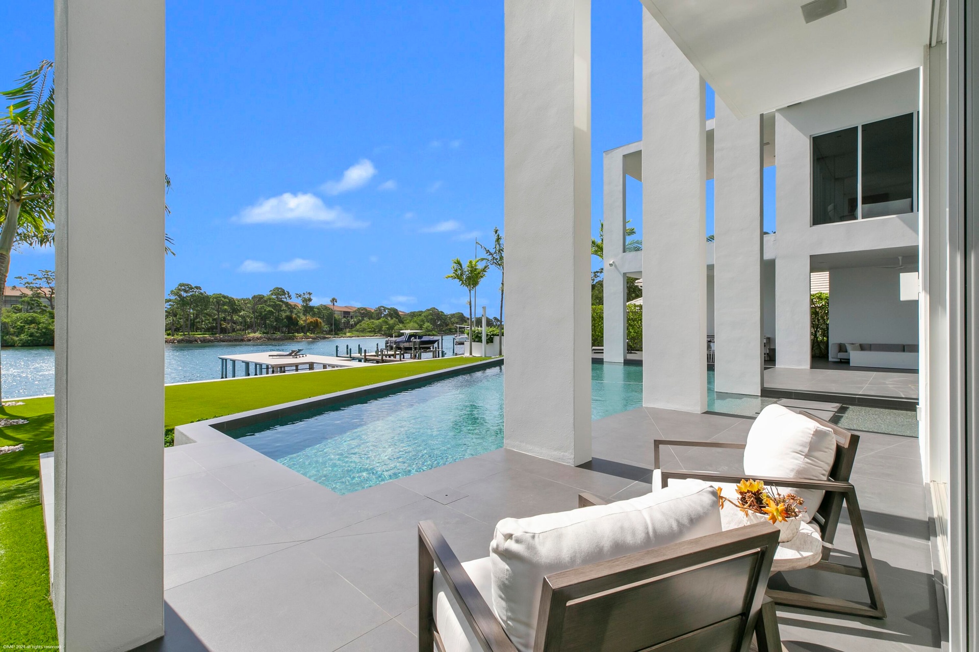 Nestled in prestigious Palm Beach Gardens, this stunning single-family home epitomizes luxury living with its gorgeous water views and ultra-modern design. Boasting a prime location, every aspect of this residence exudes elegance and comfort.Upon entering, you are greeted by an expansive foyer that leads seamlessly into the spacious living areas. The interiors are adorned with high-end finishes, including large format tile floors, custom Bizassa tiled bathrooms, designer light fixtures, and soaring windows and glass doors, creating an ambiance of sophistication with unobstructed views. The gourmet kitchen is a chef's dream, featuring state-of-the-art appliances, sleek cabinetry, and a center island perfect for culinary creations or casual gatherings. Adjacent, the dining area Nestled in prestigious Palm Beach Gardens, this stunning single-family home epitomizes luxury living with its gorgeous water views and ultra-modern design. Boasting a prime location, every aspect of this residence exudes elegance and comfort.Upon entering, you are greeted by an expansive foyer that leads seamlessly into the spacious living areas. The interiors are adorned with high-end finishes, including large format tile floors, custom Bizassa tiled bathrooms, designer light fixtures, and soaring windows and glass doors, creating an ambiance of sophistication with unobstructed views. The gourmet kitchen is a chef's dream, featuring state-of-the-art appliances, sleek cabinetry, and a center island perfect for culinary creations or casual gatherings. Adjacent, the dining area