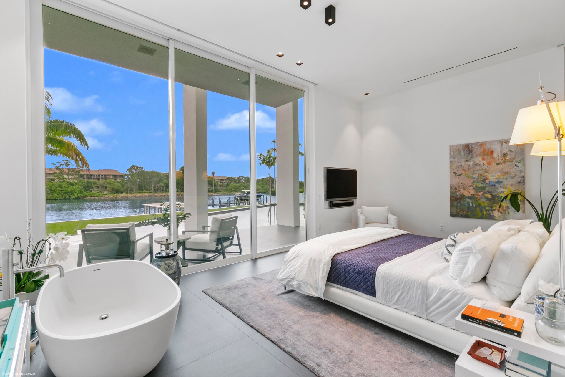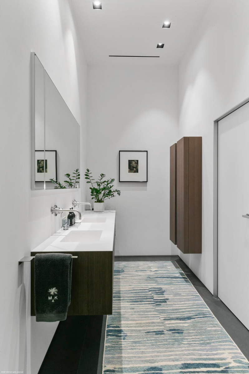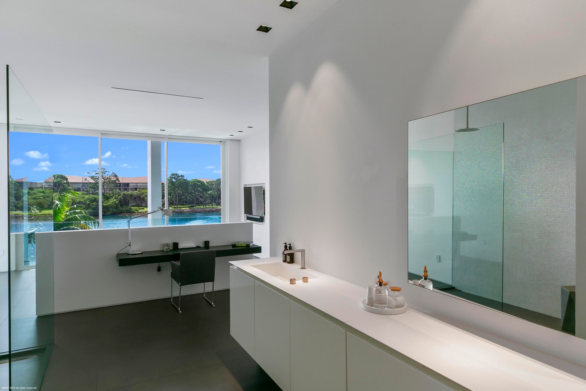 The VIP guest suite, or second primary bedroom, is generously spacious, featuring a layout that exudes both privacy and openness. The floor to ceiling windows and sliding glass doors allows for panoramic views of the waterway and offer an enormous amount of natural light with direct access to the private covered lanai. Boasting a spa-like European style en-suite bathroom, spacious walk-in shower with rainfall showerhead, dual vanities with ample counter space and storage cabinets are seamlessly integrated into the design. The thoughtfully designed walk-in closet can accommodate both short-term and long-term stays. It features custom shelving, drawers, and hanging space for clothing and personal items, ensuring guests feel at home during their stay.