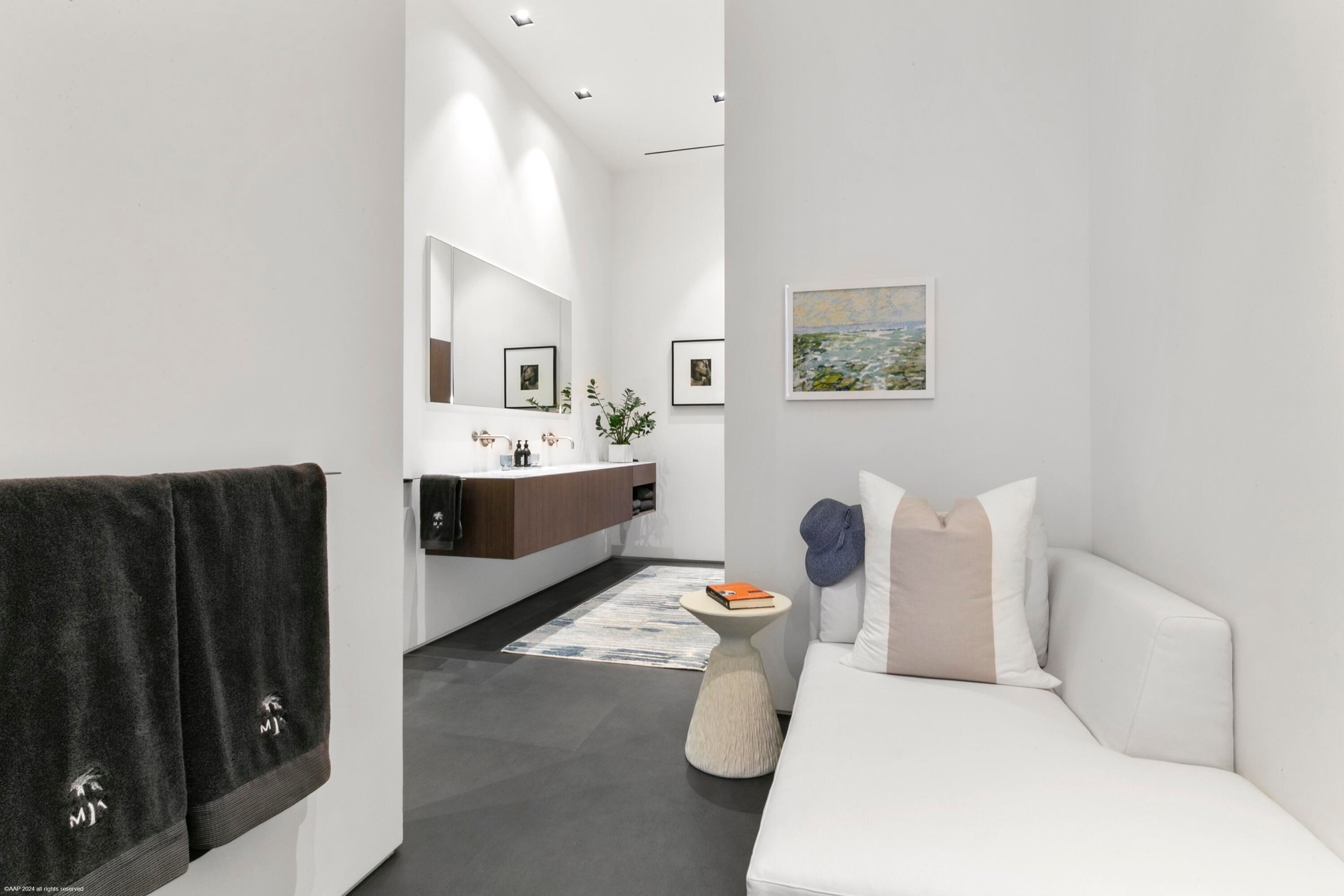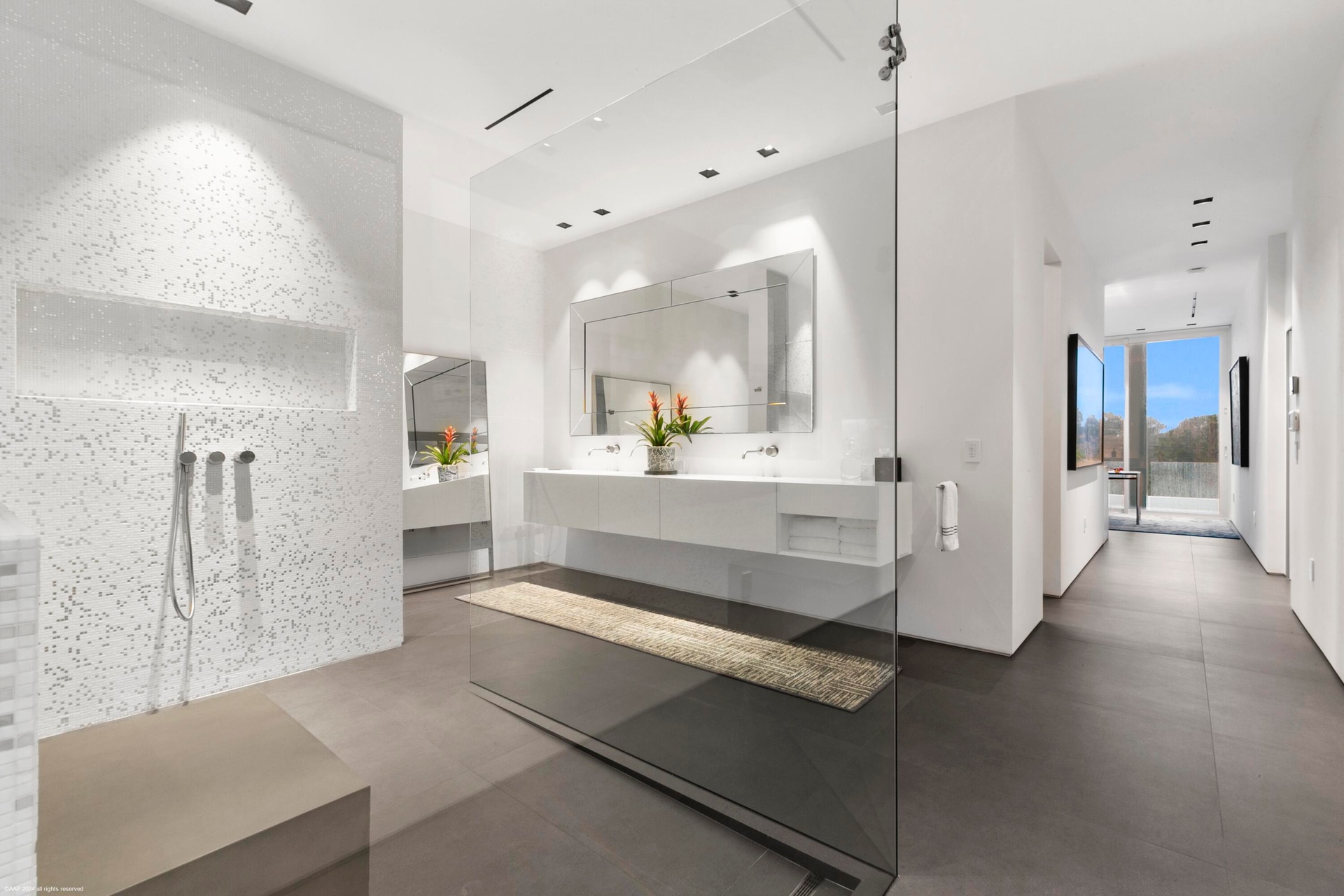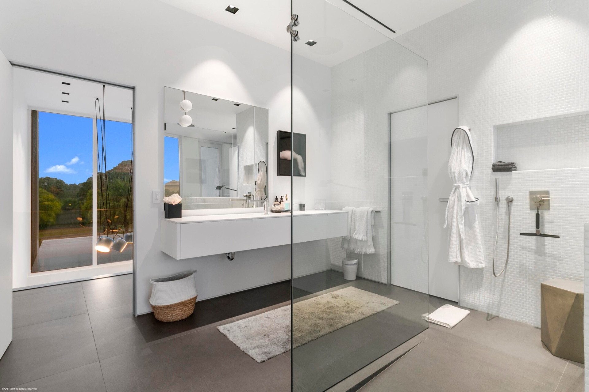 The VIP guest suite, or second primary bedroom, is generously spacious, featuring a layout that exudes both privacy and openness. The floor to ceiling windows and sliding glass doors allows for panoramic views of the waterway and offer an enormous amount of natural light with direct access to the private covered lanai. Boasting a spa-like European style en-suite bathroom, spacious walk-in shower with rainfall showerhead, dual vanities with ample counter space and storage cabinets are seamlessly integrated into the design. The thoughtfully designed walk-in closet can accommodate both short-term and long-term stays. It features custom shelving, drawers, and hanging space for clothing and personal items, ensuring guests feel at home during their stay.