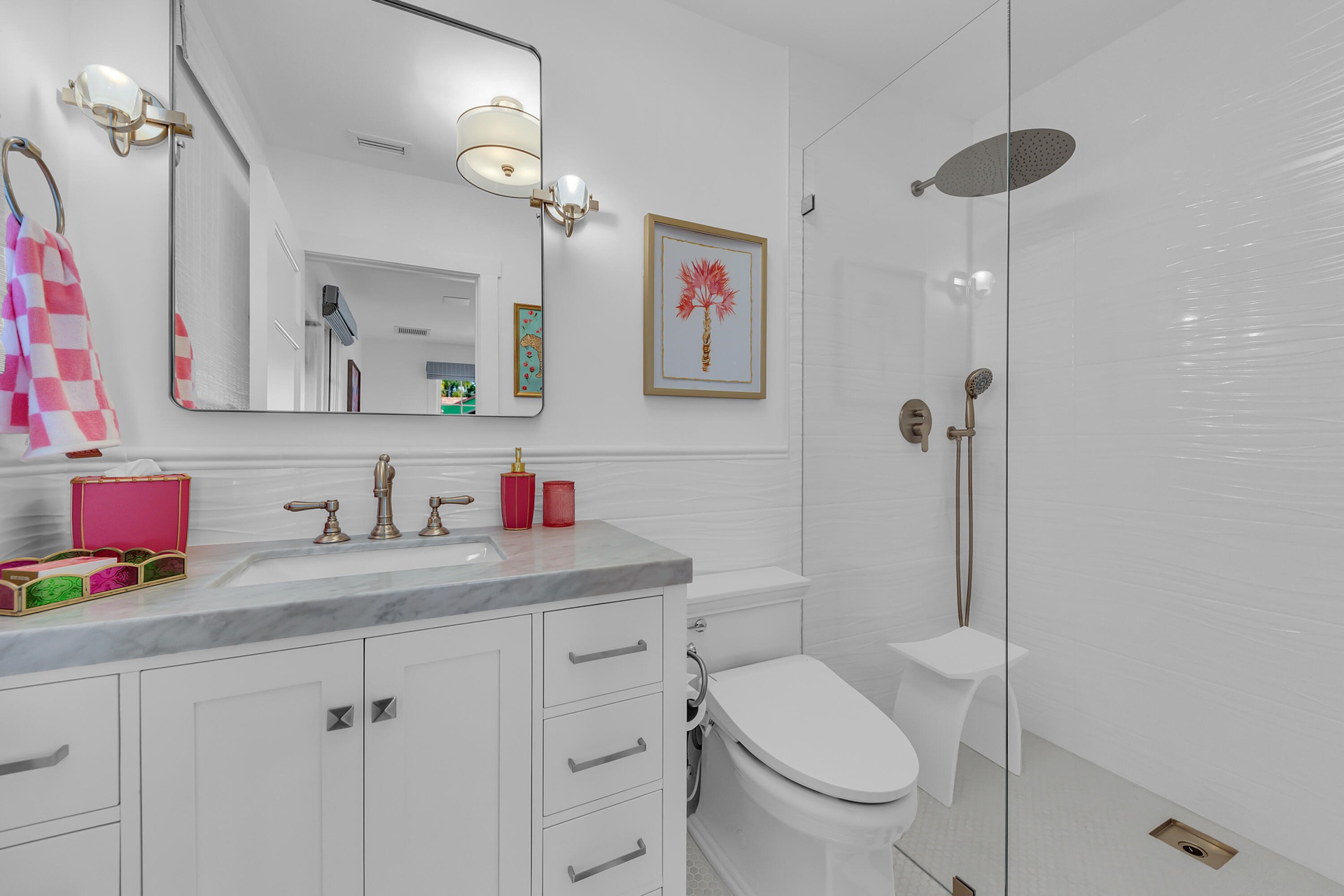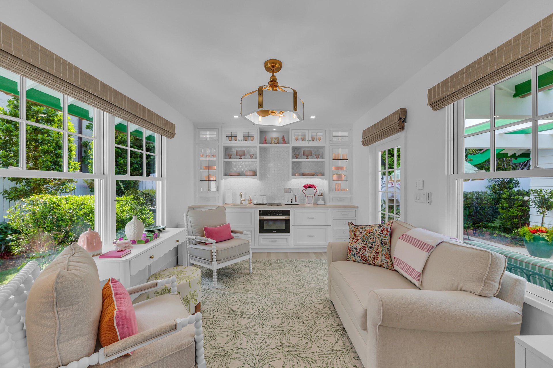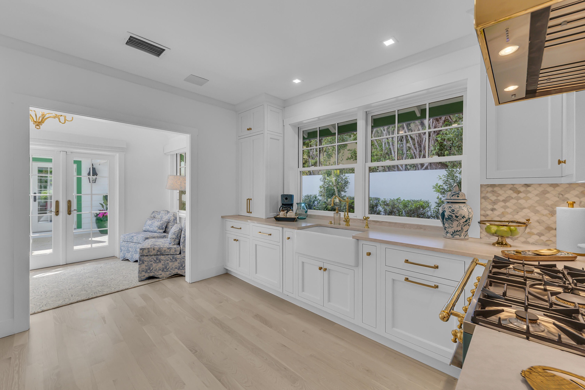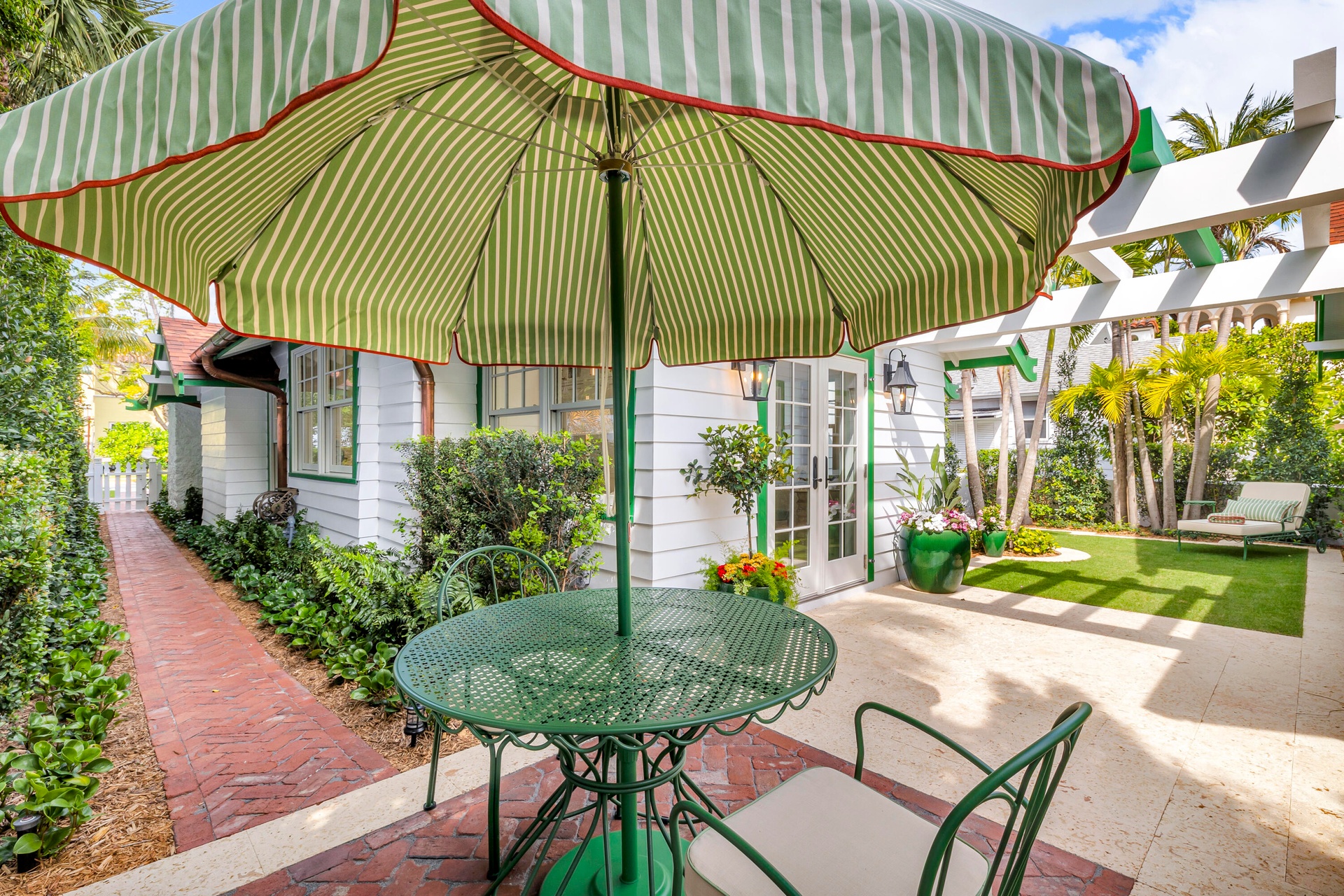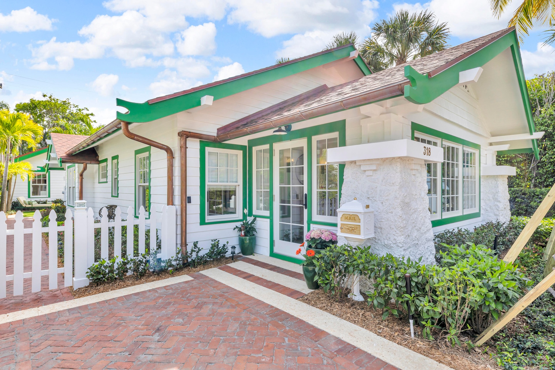 Rare Opportunity to Own a Piece of Palm Beach History. Step back in time when you enter this historic one-story Bungalow, originally built circa 1918. Landmarked by the current owner in November 2023, the home has been completely and lovingly renovated and preserved. This charming Bungalow features impact resistant, Double Hung Andersen windows, a new asphalt shingle roof, copper gutters, Detroit brick walkways, white picket fences and a delightful water fountain feature in the rear yard. Interiors boast original pecky cypress ceilings with matching built-in hutch, a gas fireplace, and an exceptional Jim Dove Design gourmet kitchen, featuring a handsome La Cornue gas stove and leaded glass in the cabinetry. Amazingly, this lot features not one, but two standalone houses! The main house has two bedrooms and two marble baths. The rear cottage features one bedroom and one bath and a full kitchenette with Miele appliances.