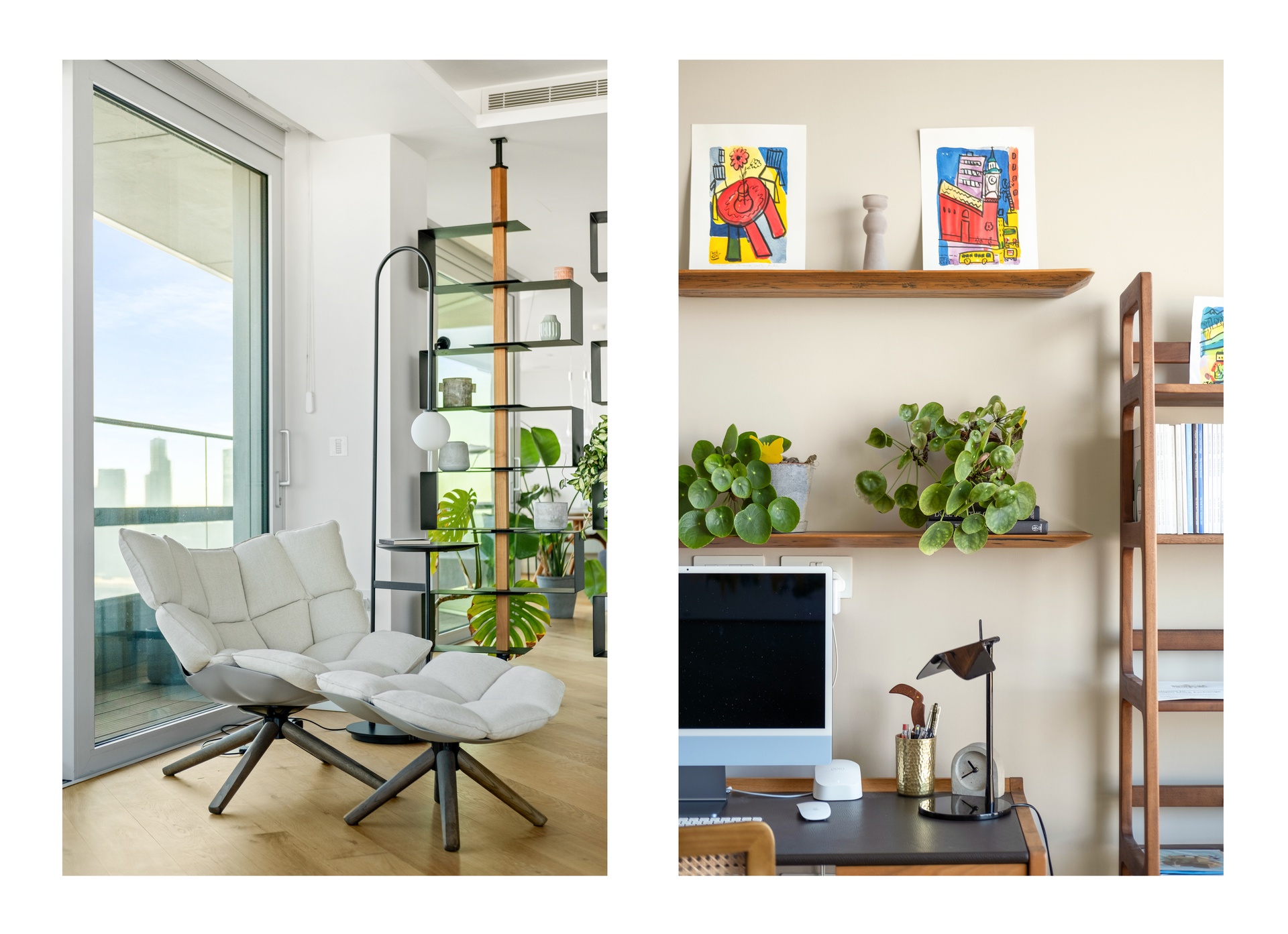 Evenings transform the apartment into a calm, elevated space set against a backdrop of illuminated landmarks.