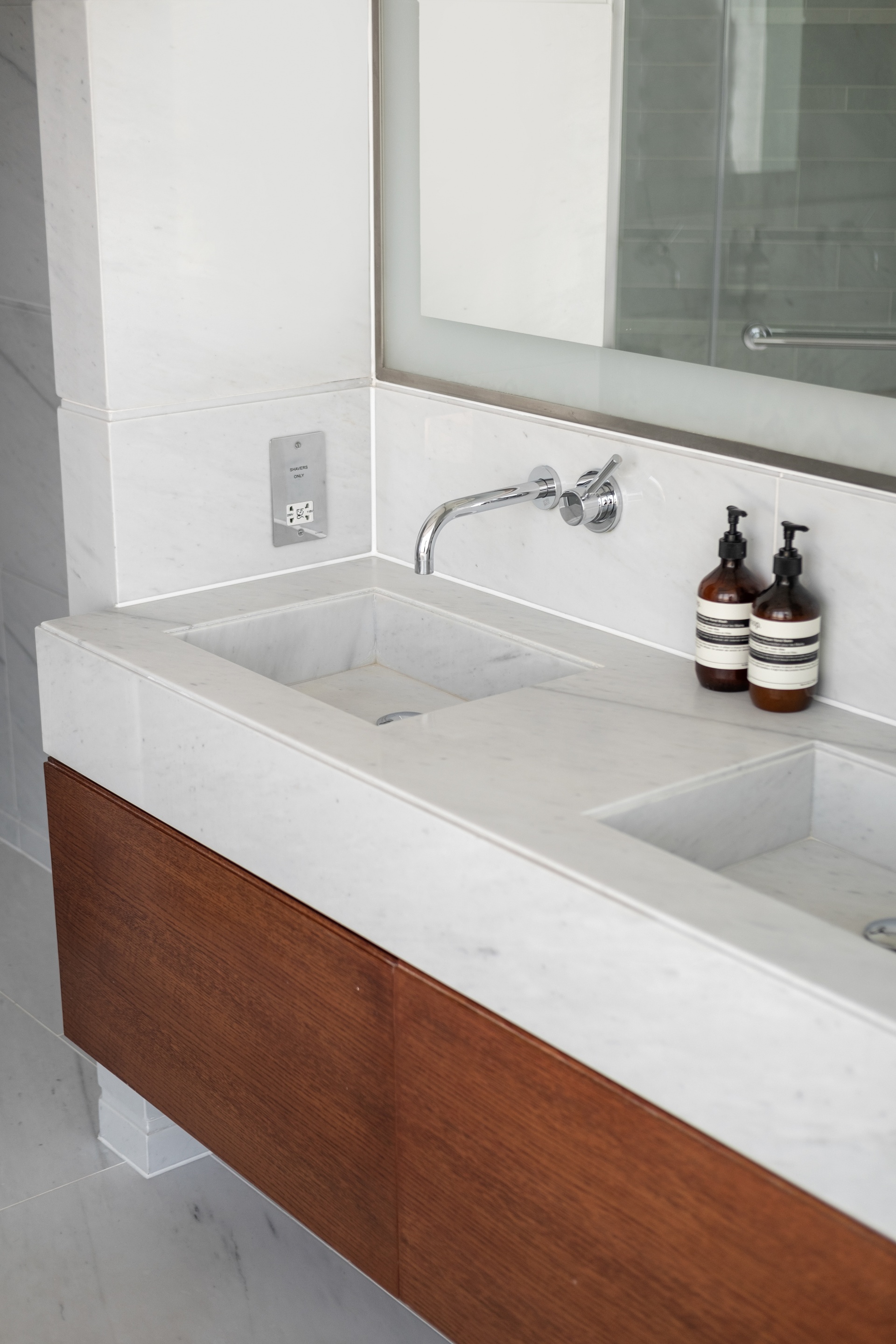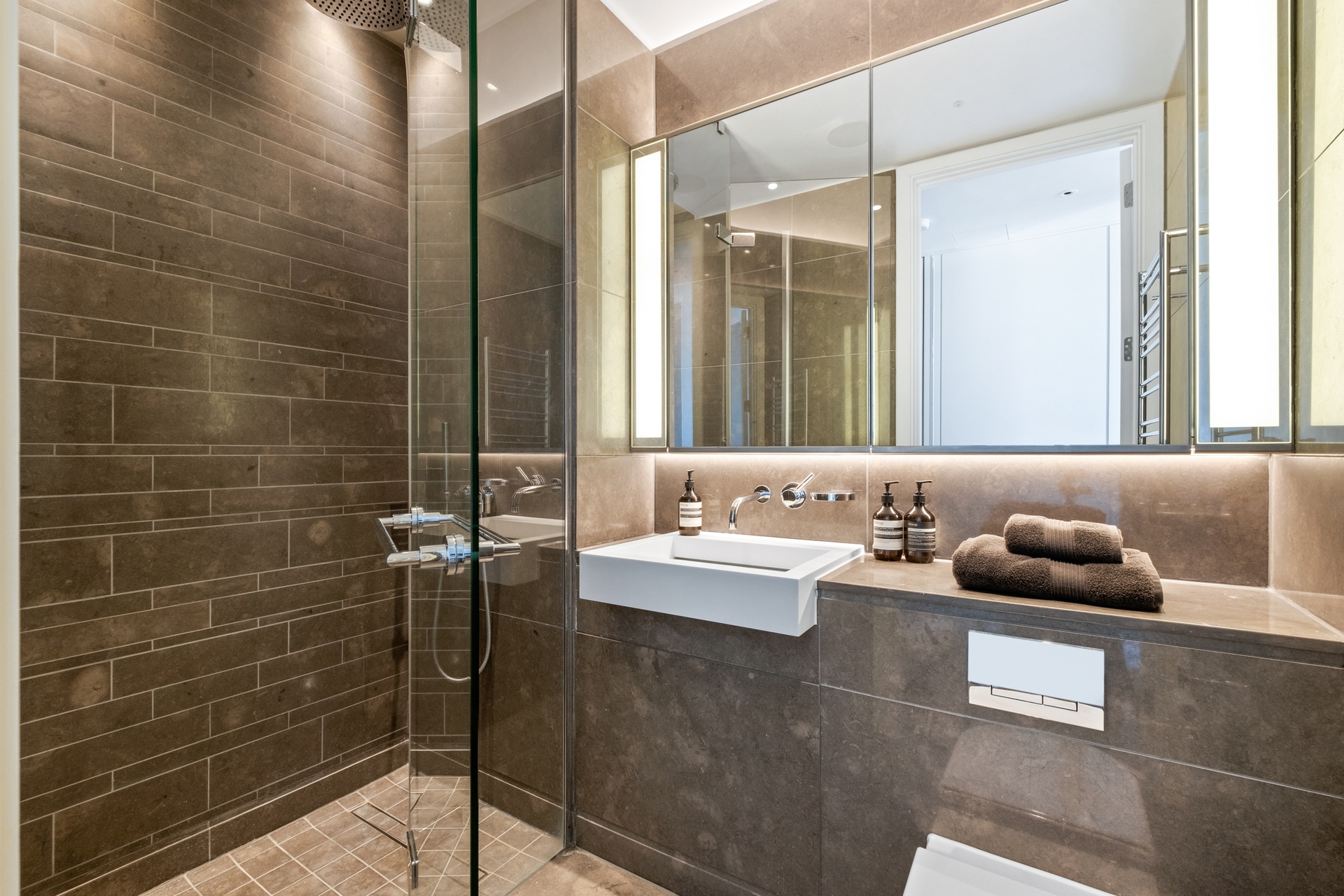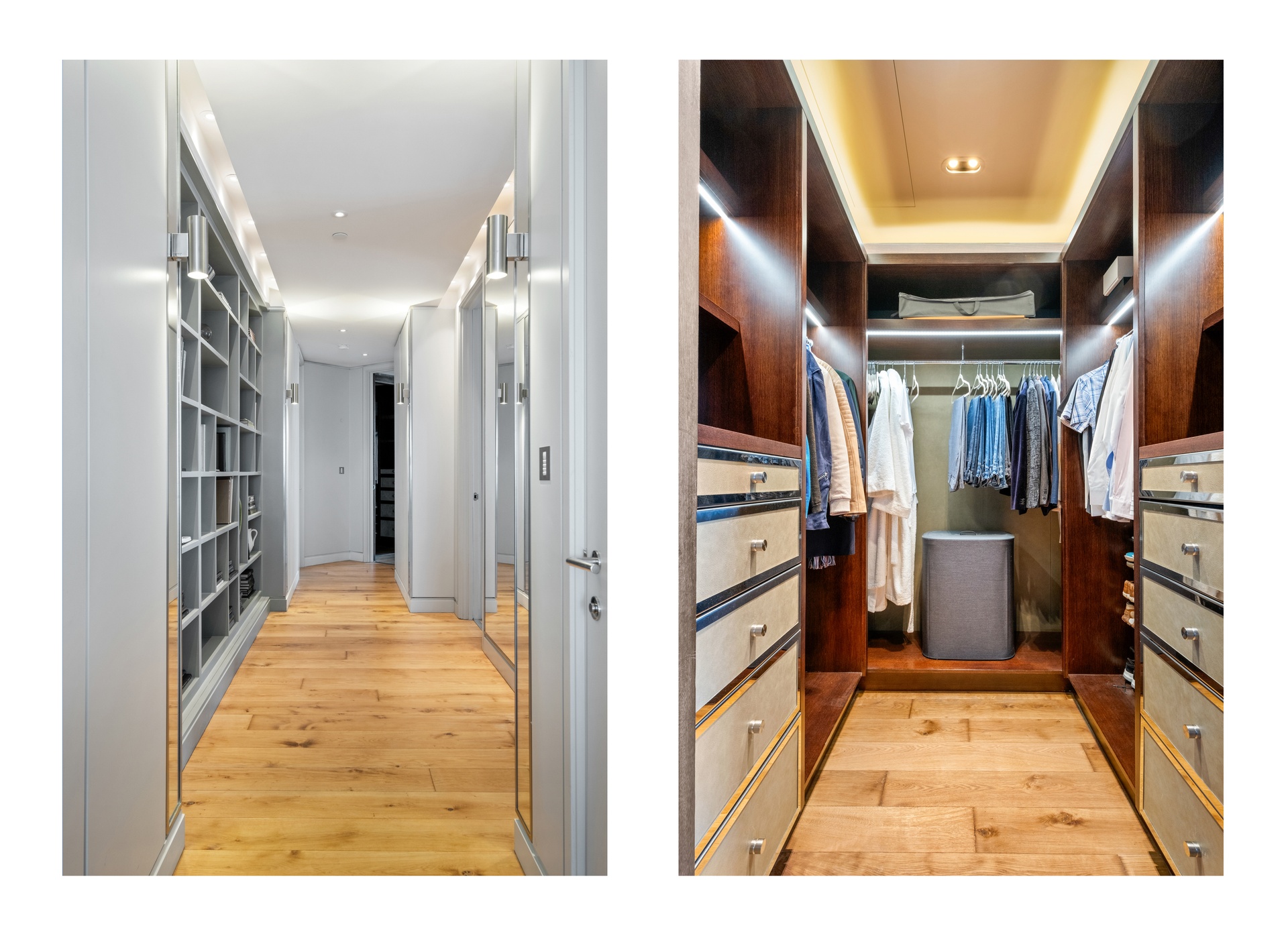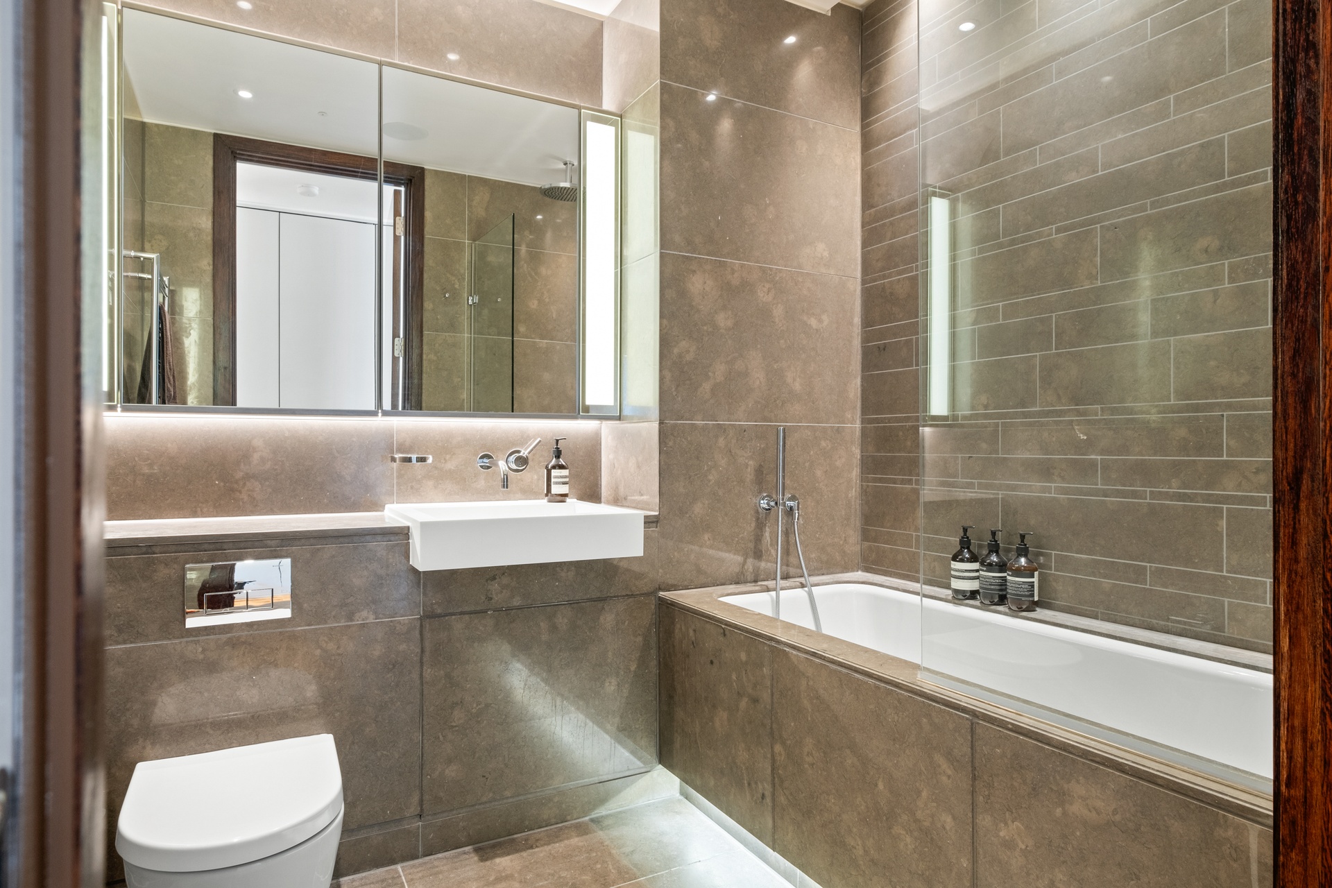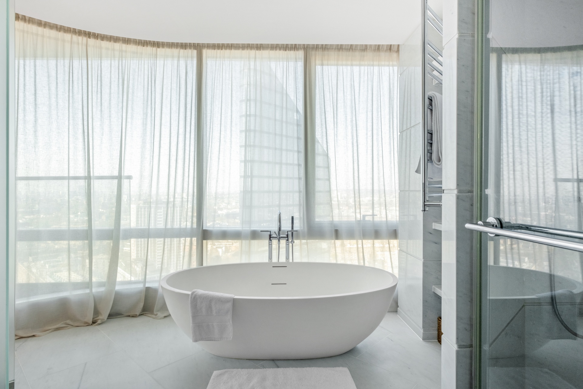 A lateral layout enhances both space and flow, comprising three well-proportioned bedrooms and four bathrooms. The primary bedroom suite is designed as a private retreat, complete with a bespoke walk-in dressing room, finished in rich joinery with integrated lighting and extensive storage, alongside a beautifully appointed en-suite featuring a freestanding bath set against floor-to-ceiling glazing, creating a calm, hotel-style environment with skyline views.