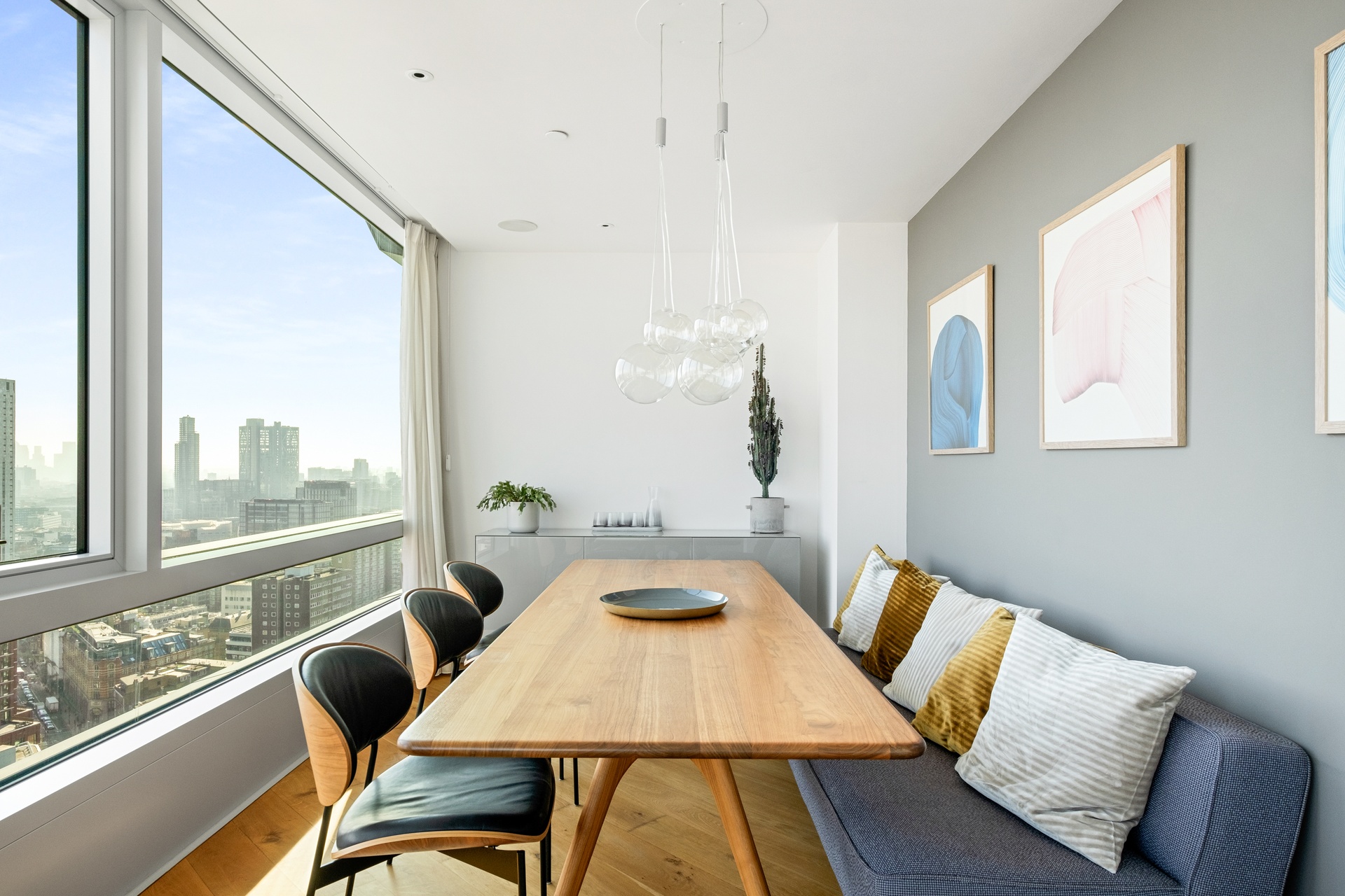 The open-plan kitchen and living area is both refined and highly functional, appointed with premium Gaggenau and Miele appliances, and perfectly positioned to enjoy the views whether cooking, dining, or entertaining. A dedicated dining area sits alongside the glazing, creating a striking setting for both everyday meals and more formal occasions, all framed by panoramic city views.