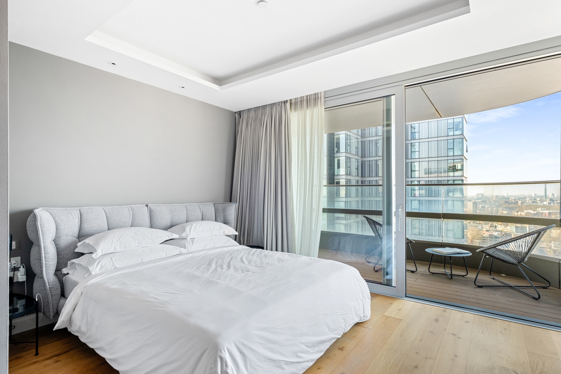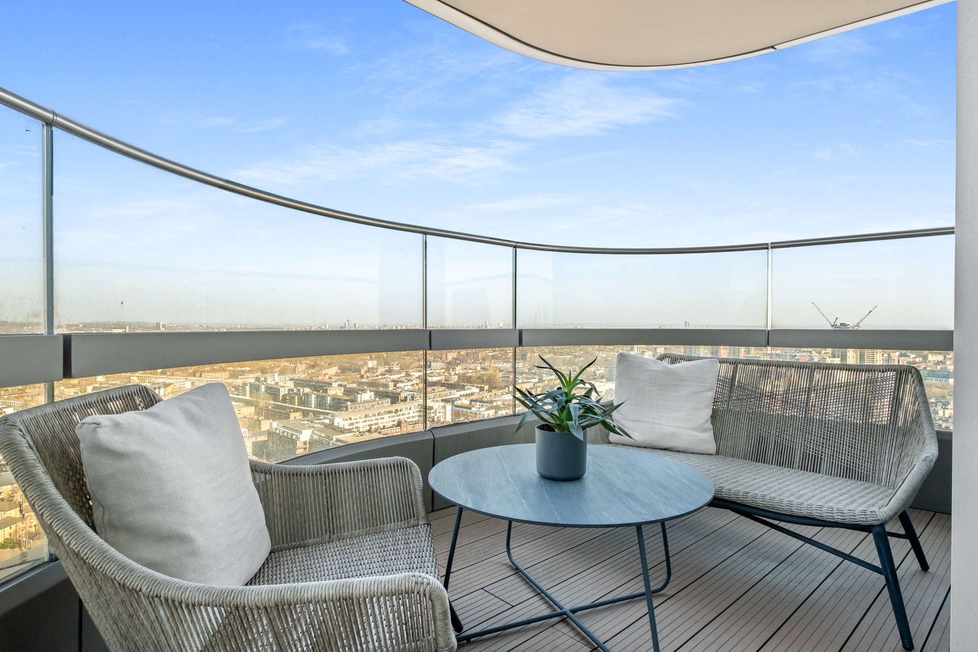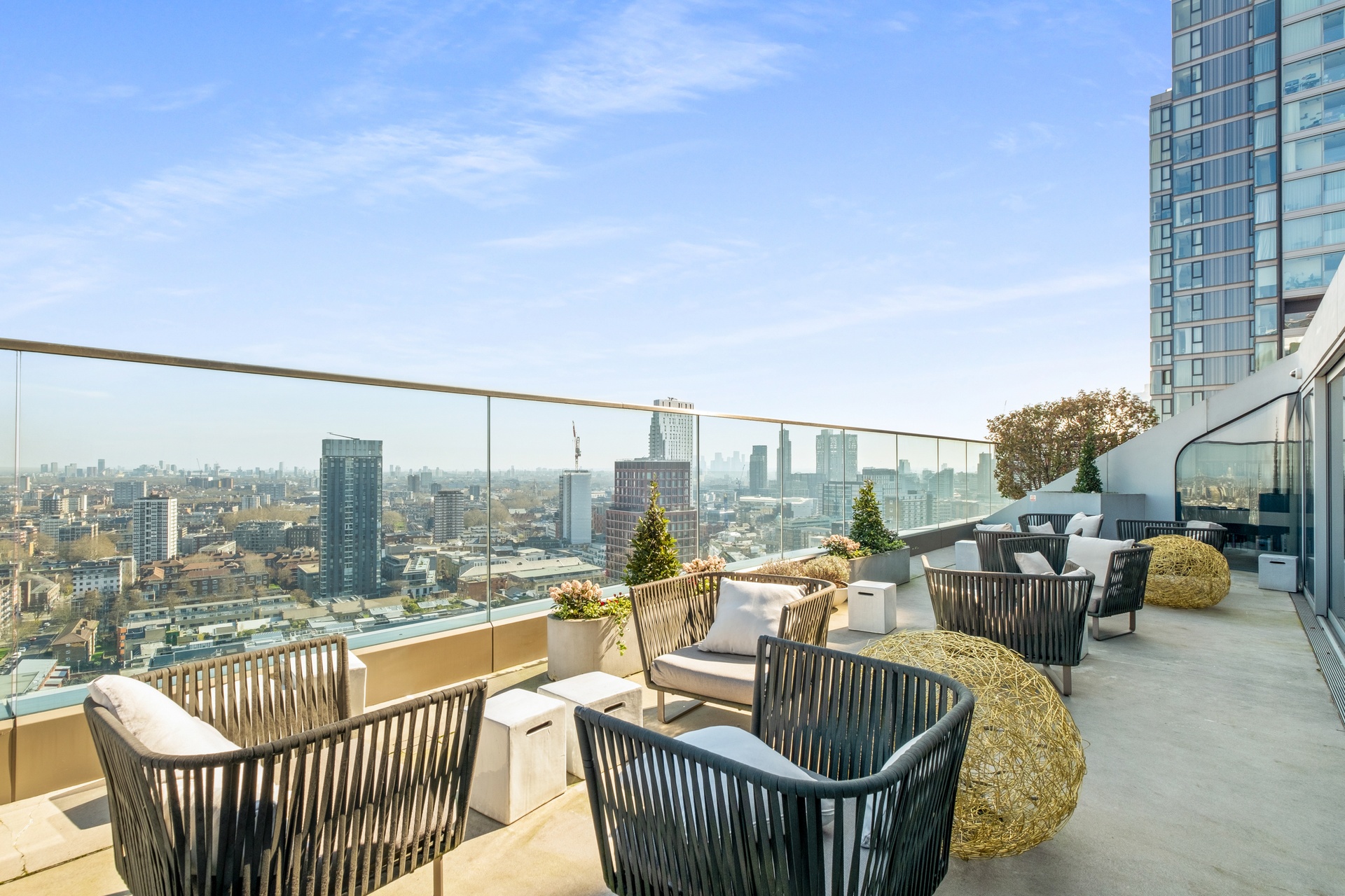 A rare sub-penthouse within the iconic Canaletto Tower, occupying half of an entire floor and spanning approximately 1,960 sq ft of lateral living, defined by three private terraces and truly panoramic views across London’s skyline.