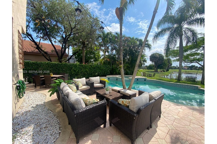 Beautiful, completely updated waterfront two-story home offering 4 bedrooms and 3 full bathrooms in the prestigious Grand Palms Golf Community.This gated community is renowned for its championship golf courses, lush tropical landscaping, and exceptional amenities. Residents enjoy access to a 27-hole public golf course with no mandatory golf membership required. Ideally located near Interstate 75, The Shops at Pembroke Gardens, Pembroke Lakes Mall, Costco, Whole Foods Market, and Publix, with convenient access to dining and family-friendly entertainment.The backyard offers privacy and tranquility. The home features accordion hurricane shutters and a 2-car garage plus driveway parking for 3 additional vehicles. Rental payment includes pest control, lawn service, basic cable TV, and high-speed WiFi/internet. This light-filled home is move-in ready and located in a top-rated school district, with both public and top charter schools and private options nearby. Brand-new oversized refrigerator with built-in water dispenser. The property is currently tenant-occupied through June 1st. Rented for $6000 a month. Sold with furnished or unfurnished. Pool tiles will be replaced and $20k sellers credit for closing with full price offer. Listed for rent as well. MLS # A11972055. Owner-agent.