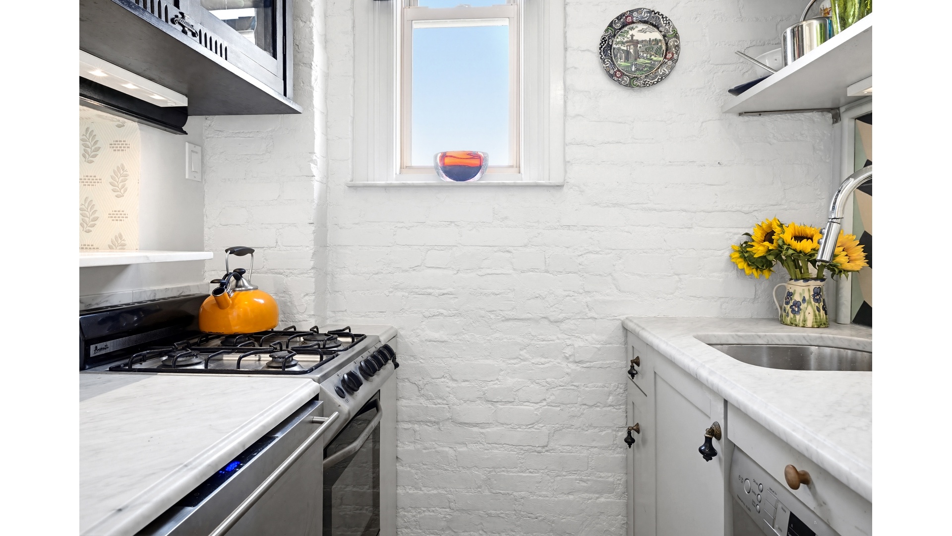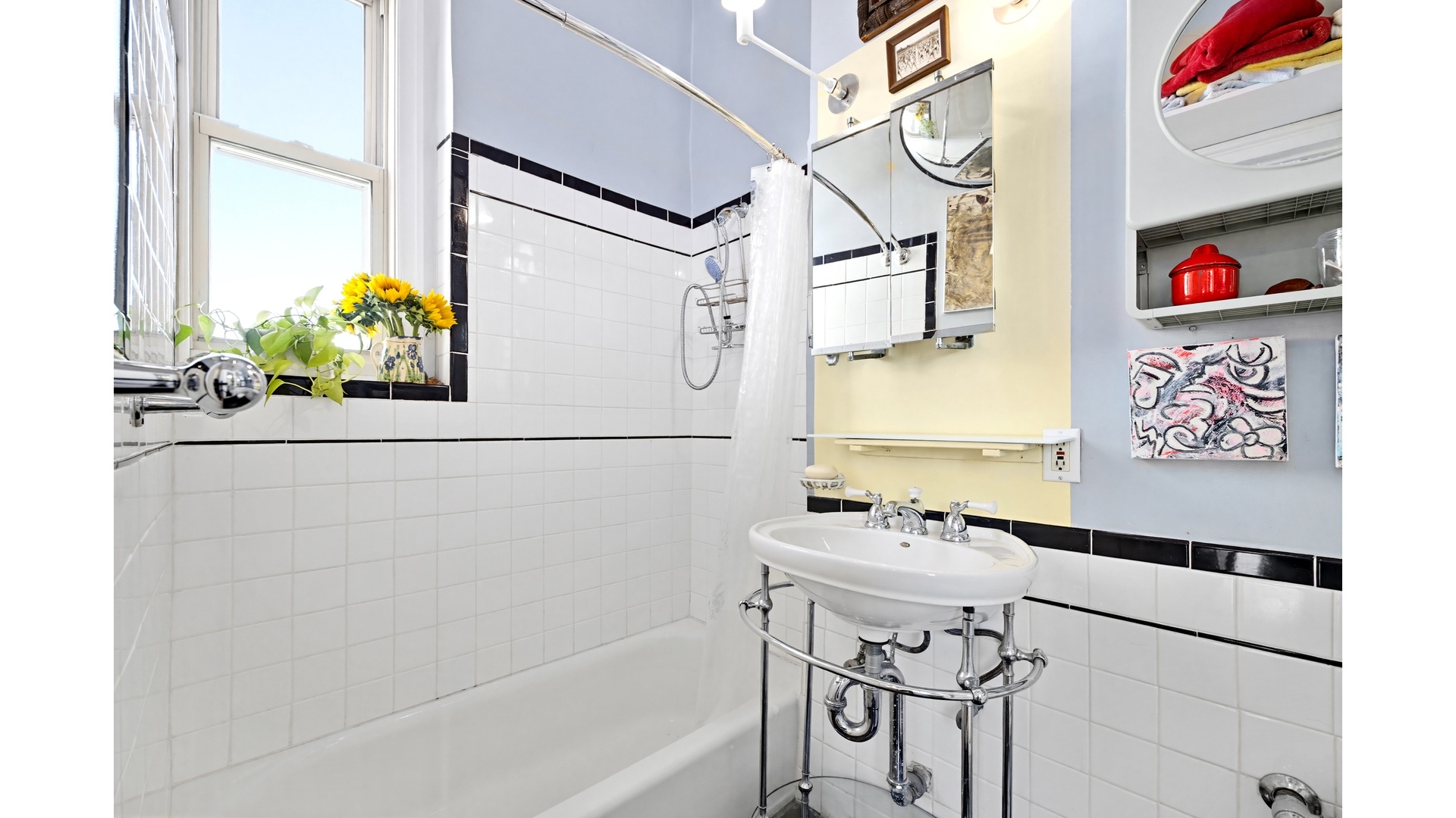 You can even enjoy city views from the full-sized bathroom with classic white and black tile, and charming porcelain console sink.