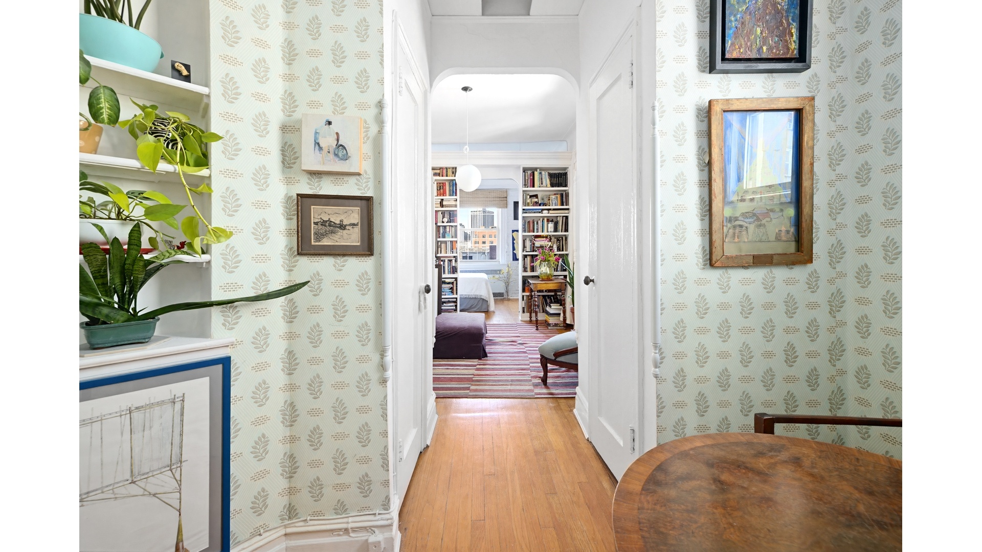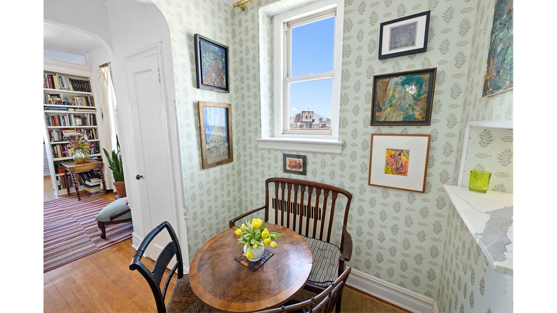 Entertain in the windowed dining area with views of the Brooklyn Bridge, Empire State Building, and Chrysler Building. The living room has the same sweeping views, as well as a view toward the harbor through an extra-large pocket door to the bedroom, integrated into full height adjustable bookshelves.