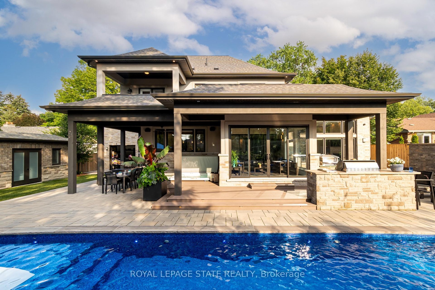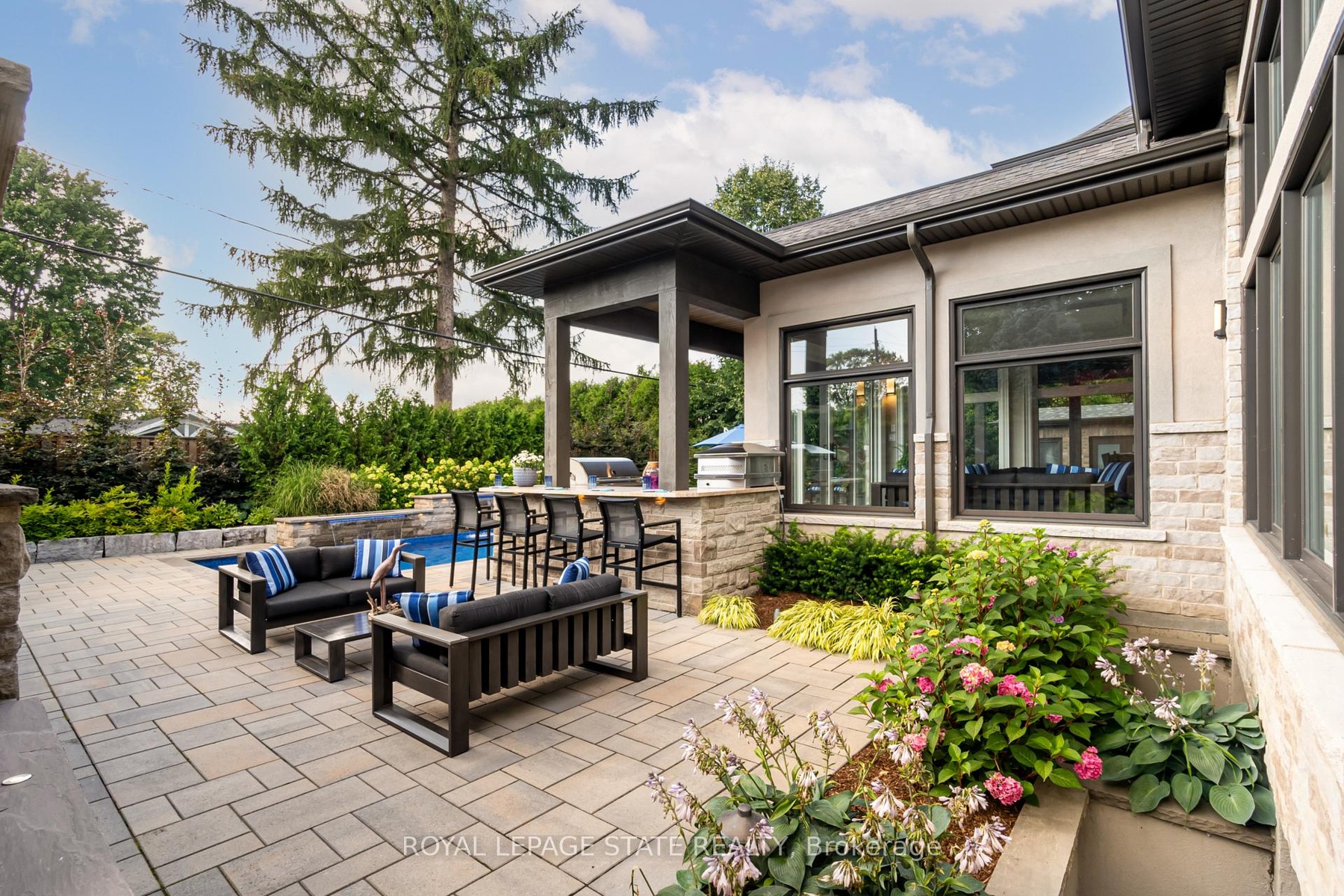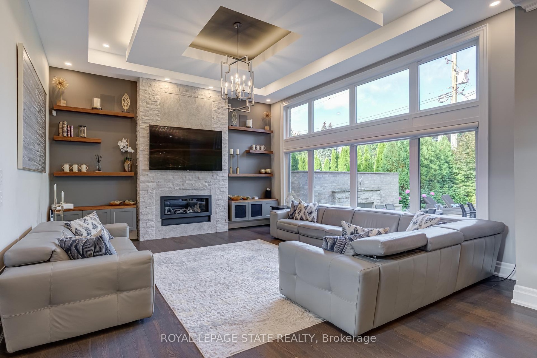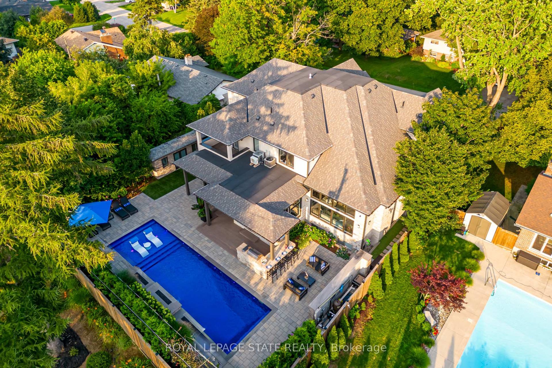 This architectural masterpiece offers 7,000 sq. ft. of luxurious living space with 4+2 bedrooms, 6 bathrooms, an incredible resort-style backyard oasis, and a fully finished basement with separate entrance. Set on an 85 x 135 ft. lot in a mature Ancaster neighbourhood, just one minute to highway access and all Power Centre amenities, this dream home impresses with striking curb appeal, professional landscaping, and an oversized triple garage with 14 ft. ceilings and two car lifts. The grand foyer with a soaring 21 ft. ceiling and curved staircase opens to a sophisticated interior featuring bold millwork, expansive porcelain, and wide-plank hardwood all illuminated by massive windows allowing plenty of natural light. The main level boasts formal living and dining rooms with 12 ft. ceilings, a private office, powder room, mudroom, and a gourmet eat-in kitchen with top-tier appliances. A 4-season sunroom with radiant in-floor heating and a family room with 11 ft. ceiling and stone fireplace create the perfect entertaining spaces. Upstairs, the sensational primary suite includes custom built-ins, spa-inspired 5-piece bath, private balcony, walk-in closet, and a custom dressing room fit for any wardrobe. Three additional bedrooms, all with ensuite baths (heated floors), and bedroom level laundry complete the upper level. The finished lower level offers a recreation area, home theatre, 2 bedrooms, full bath, second laundry, and kitchenette-ideal for family enjoyment or a multigenerational in-law suite. Step outside to a private resort-style retreat with heated saltwater pool (waterfalls, lights, fire features), sunken hot tub, outdoor kitchen with pizza oven, extensive hardscaping, artificial turf, storage shed, and an elite K-Array sound system. Upgrades include Control4 automation, integrated security with cameras, whole-home sound, and dual furnaces, A/Cs, and HRVs for comfort and efficiency. A rare opportunity to own one of Ancaster's most extraordinary residences!