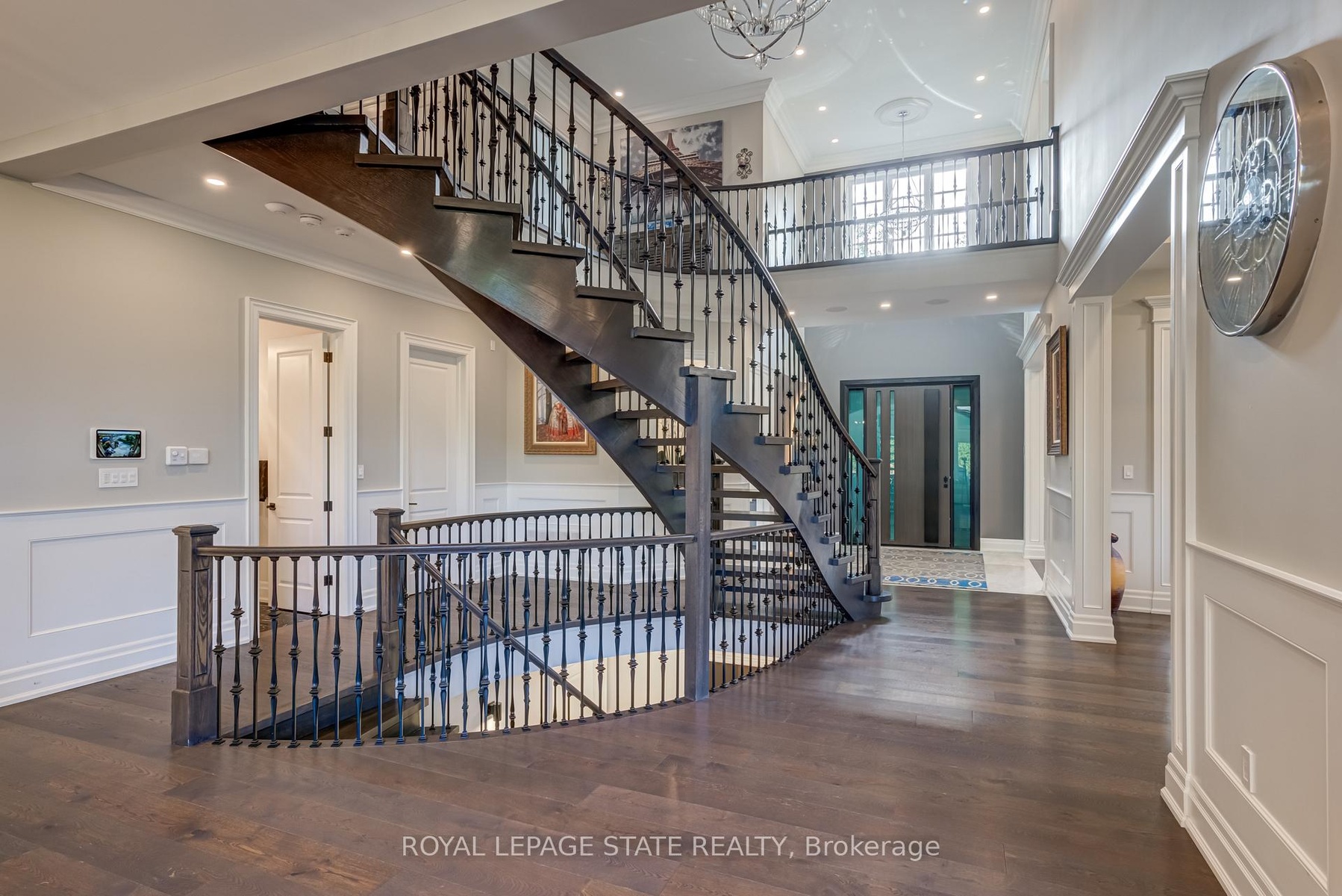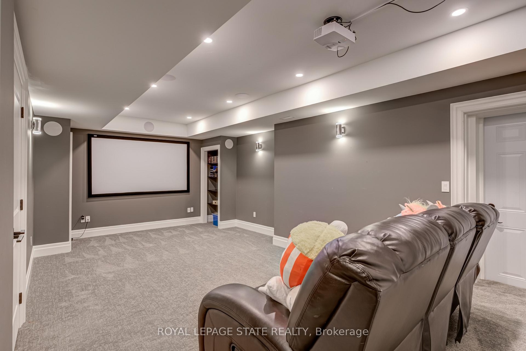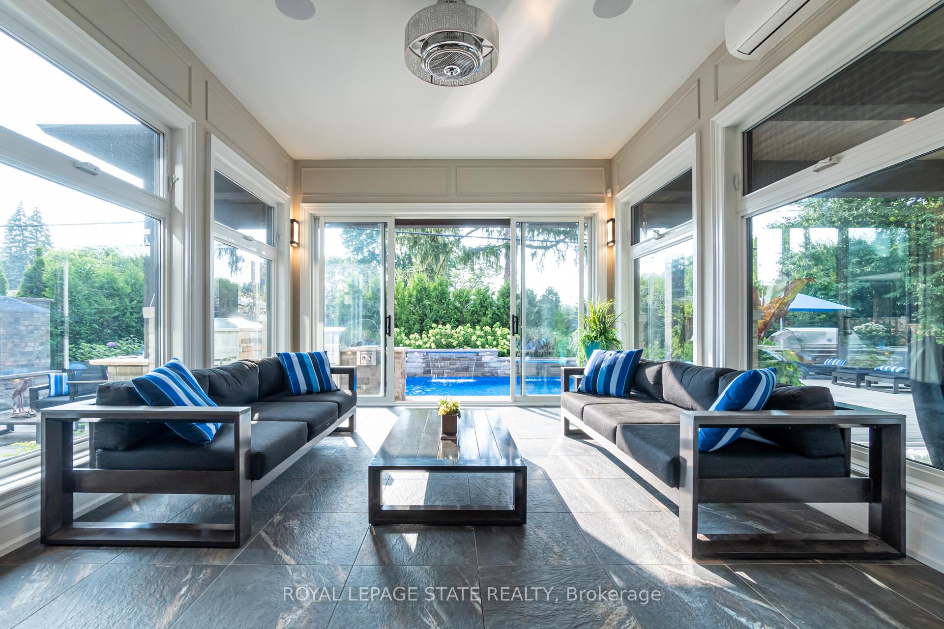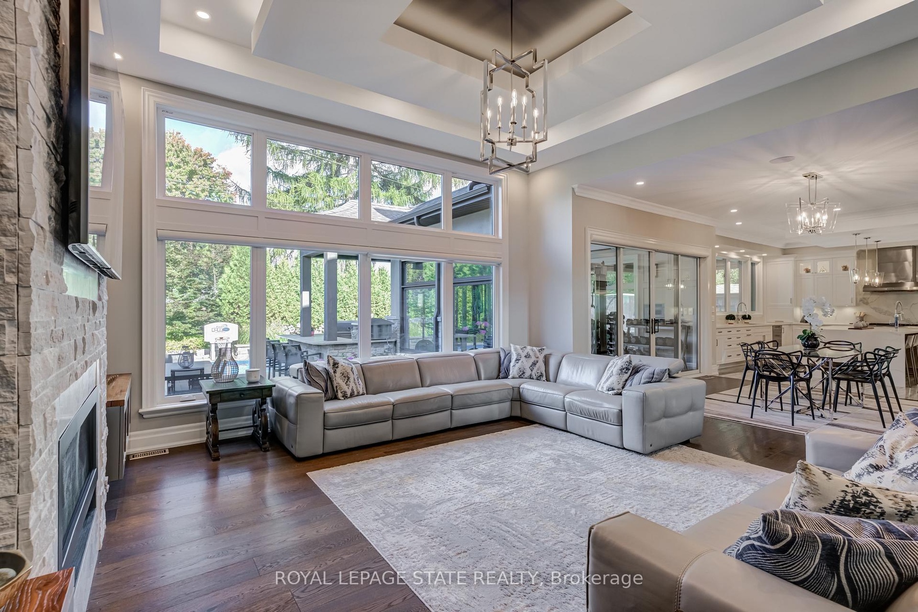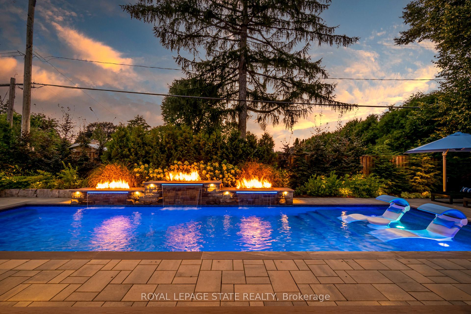 This architectural masterpiece offers 7,000 sq. ft. of luxurious living space with 4+2 bedrooms, 6 bathrooms, an incredible resort-style backyard oasis, and a fully finished basement with separate entrance. Set on an 85 x 135 ft. lot in a mature Ancaster neighbourhood, just one minute to highway access and all Power Centre amenities, this dream home impresses with striking curb appeal, professional landscaping, and an oversized triple garage with 14 ft. ceilings and two car lifts. The grand foyer with a soaring 21 ft. ceiling and curved staircase opens to a sophisticated interior featuring bold millwork, expansive porcelain, and wide-plank hardwood all illuminated by massive windows allowing plenty of natural light. The main level boasts formal living and dining rooms with 12 ft. ceilings, a private office, powder room, mudroom, and a gourmet eat-in kitchen with top-tier appliances. A 4-season sunroom with radiant in-floor heating and a family room with 11 ft. ceiling and stone fireplace create the perfect entertaining spaces. Upstairs, the sensational primary suite includes custom built-ins, spa-inspired 5-piece bath, private balcony, walk-in closet, and a custom dressing room fit for any wardrobe. Three additional bedrooms, all with ensuite baths (heated floors), and bedroom level laundry complete the upper level. The finished lower level offers a recreation area, home theatre, 2 bedrooms, full bath, second laundry, and kitchenette-ideal for family enjoyment or a multigenerational in-law suite. Step outside to a private resort-style retreat with heated saltwater pool (waterfalls, lights, fire features), sunken hot tub, outdoor kitchen with pizza oven, extensive hardscaping, artificial turf, storage shed, and an elite K-Array sound system. Upgrades include Control4 automation, integrated security with cameras, whole-home sound, and dual furnaces, A/Cs, and HRVs for comfort and efficiency. A rare opportunity to own one of Ancaster's most extraordinary residences!
