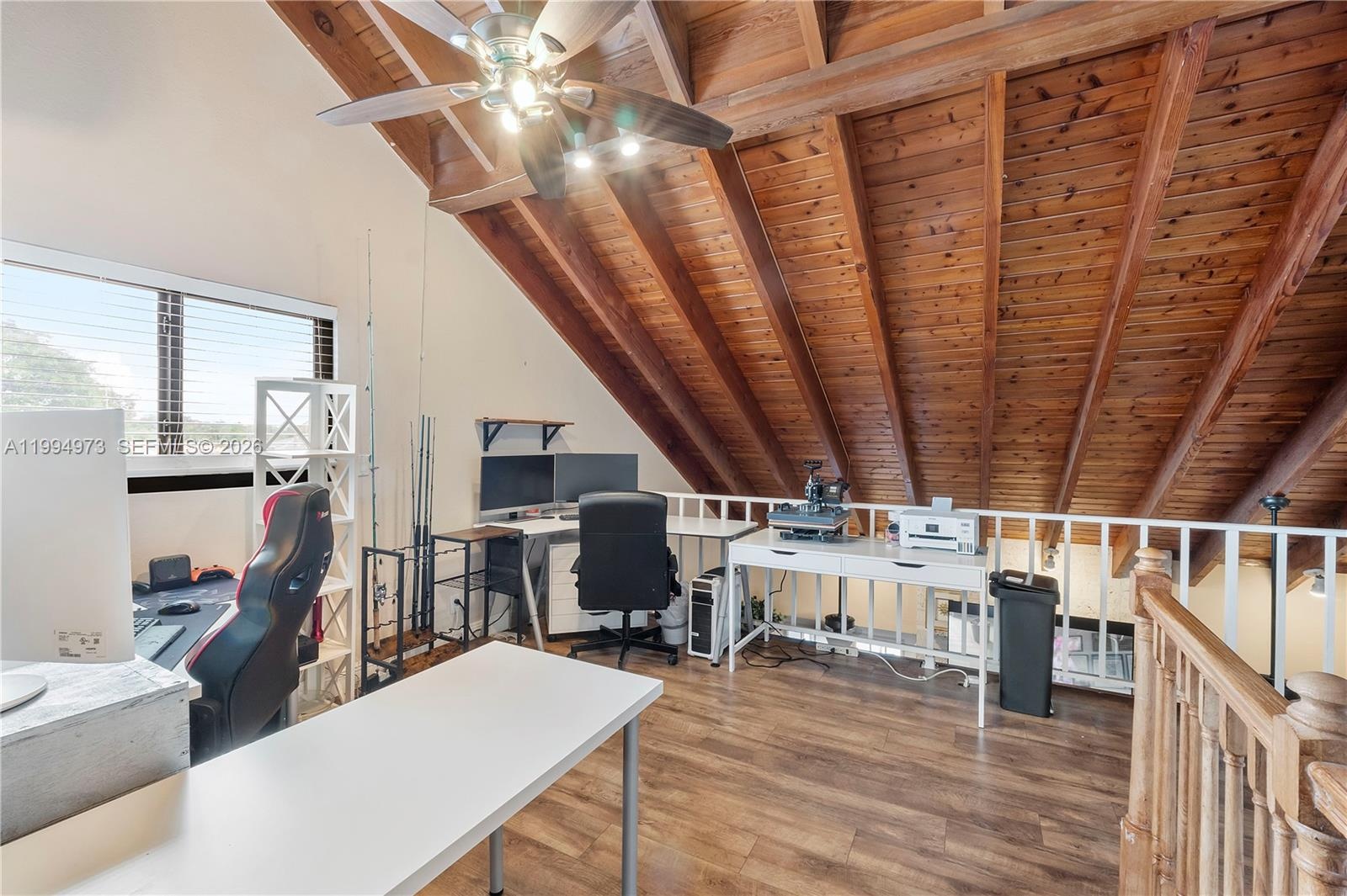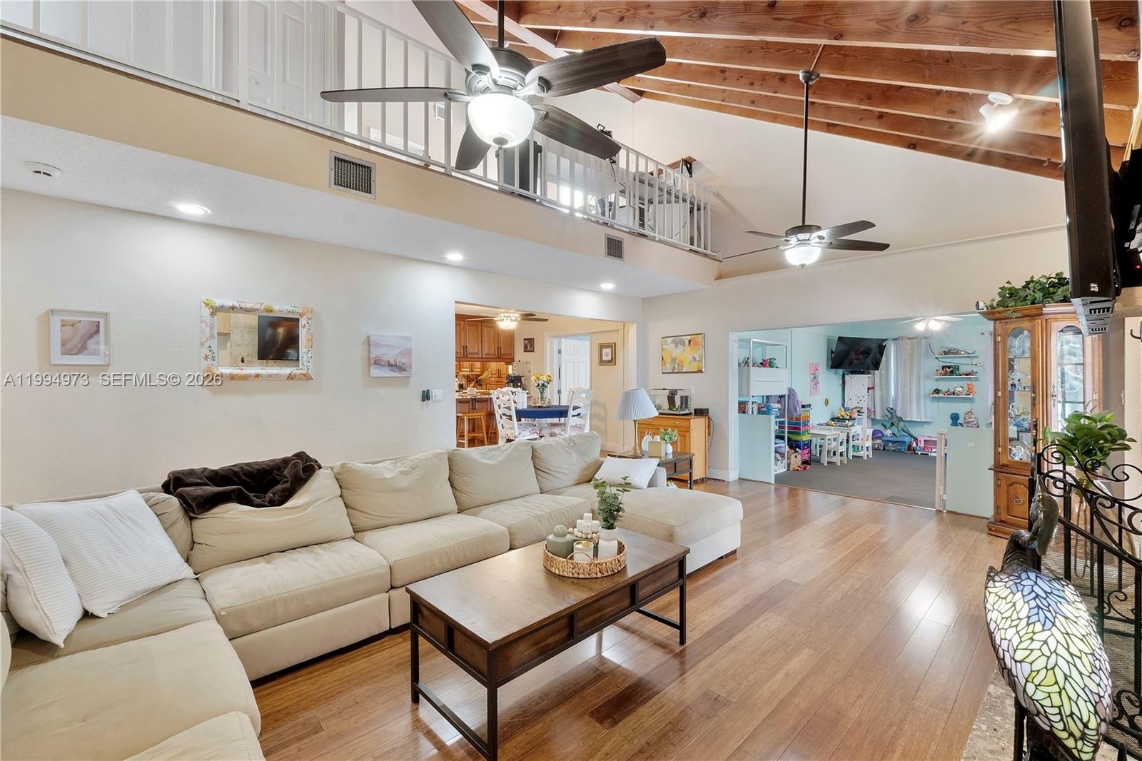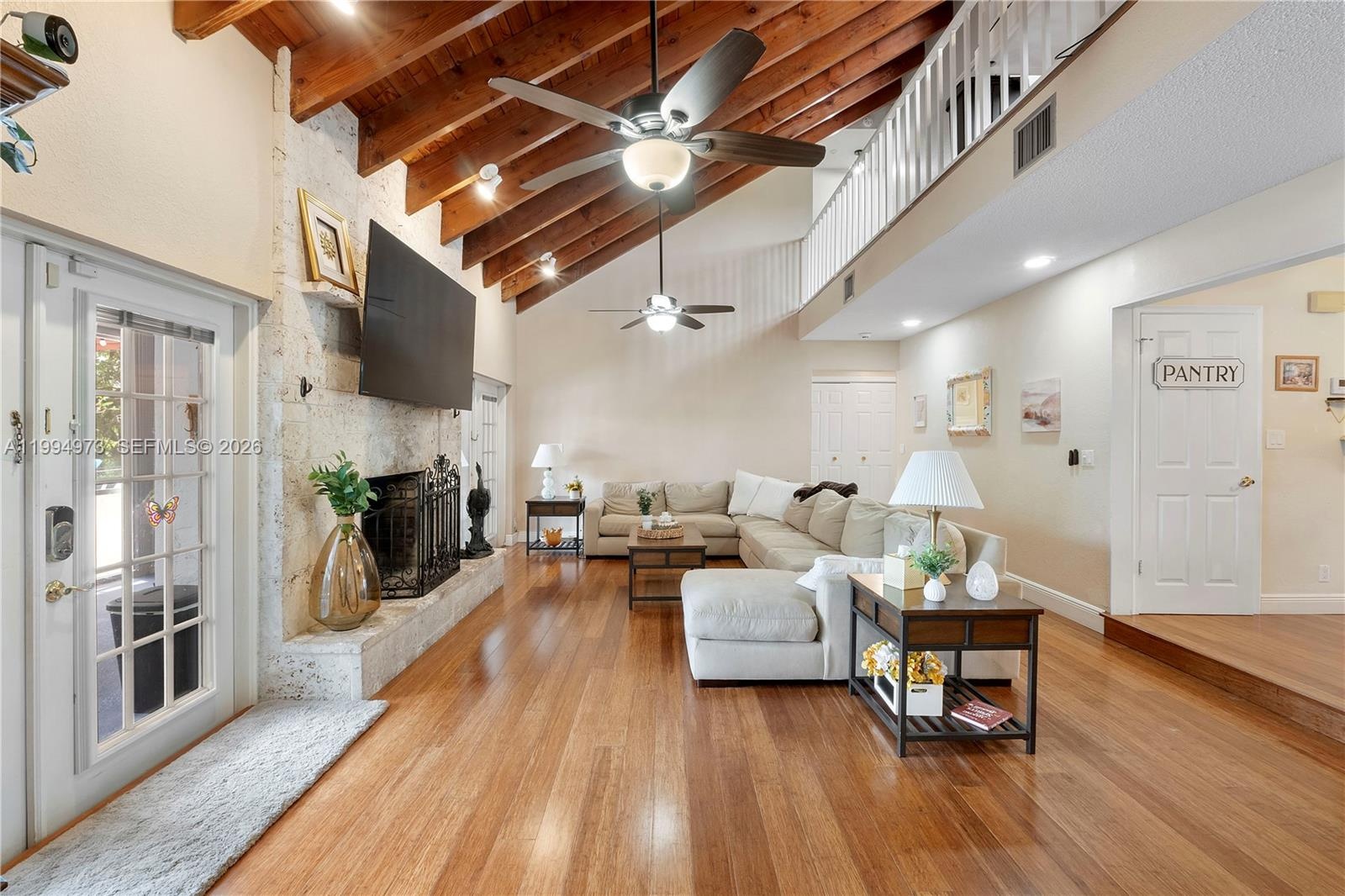 Beautifully updated 6-bedroom, 3.5-bath pool home with tranquil lake views in a highly sought-after neighborhood, offering more than 3,800 sq ft under air. This spacious layout features two living areas, providing plenty of room for entertaining and everyday living. The main living room is a standout with a cozy fireplace and stunning wood ceilings with exposed beams that extend into the loft area, adding warmth and character throughout.