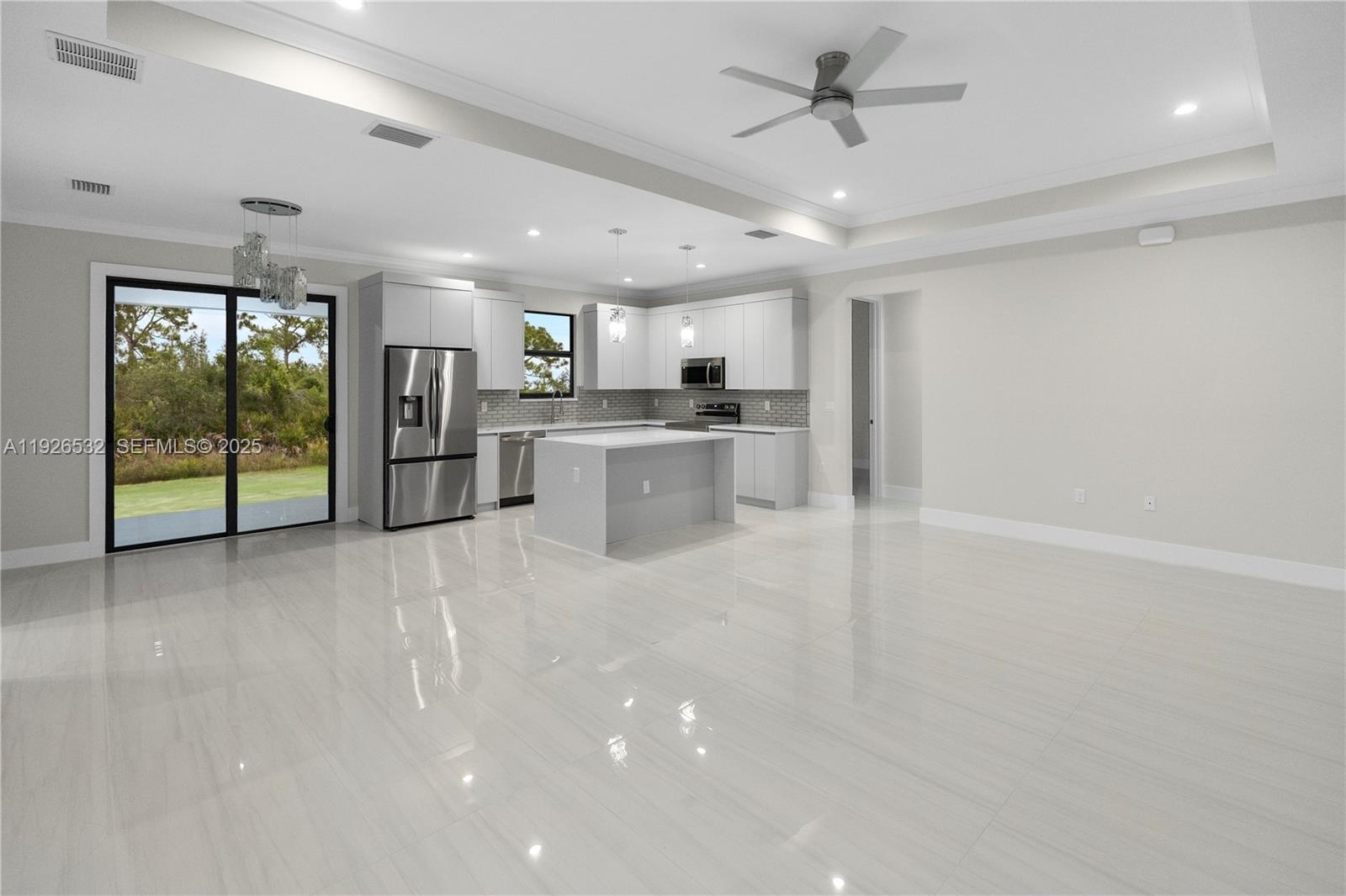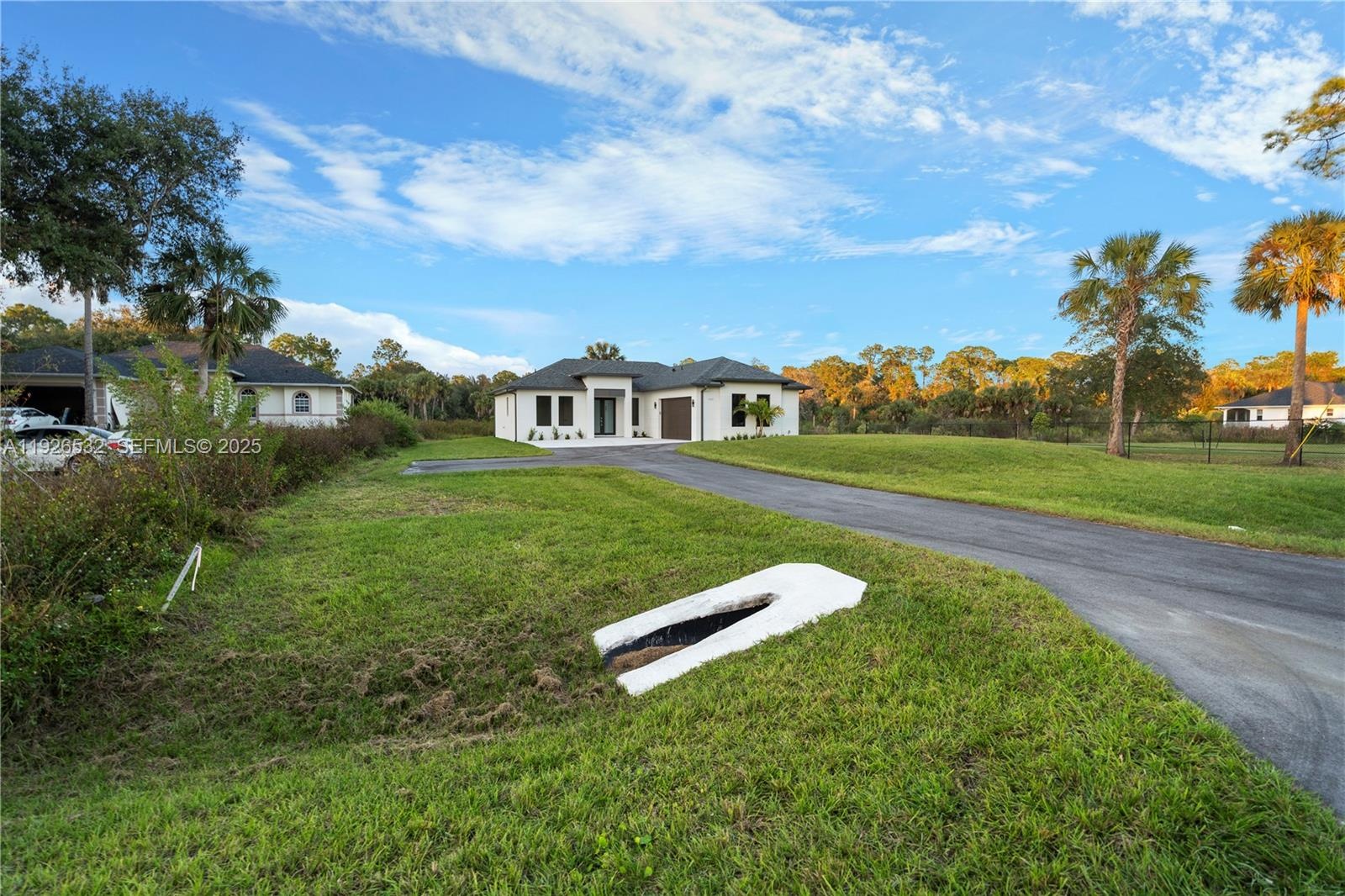 ** READY TO MOVE IN NOW ** This stunning 3-bedroom + den new construction home sits on an oversized 1.59-acre lot, offering endless possibilities—add a pool, bring your pets and toys, or build a future guest house since the property meets county requirements. From the moment you enter through the tall French doors, you’ll notice the bright, open layout and exceptional attention to detail: elegant tile flooring throughout, soaring tray ceilings, beautiful crown molding in the main living areas and primary suite, 8-ft doors, and an airy living room that fills the home with natural light. The modern chef-inspired kitchen features 42" custom light-colored cabinetry, quartz countertops, a stunning waterfall island, and a stylish backsplash. The bathrooms elevate the home’s contemporary feel with over-the-counter vessel sinks and sleek waterfall faucets. Nestled in the rapidly growing Golden Gate Estates, this property offers privacy while being just minutes from shops, supermarkets, and top-rated Naples schools—making it not only a beautiful home but also an incredible long-term investment for your family!