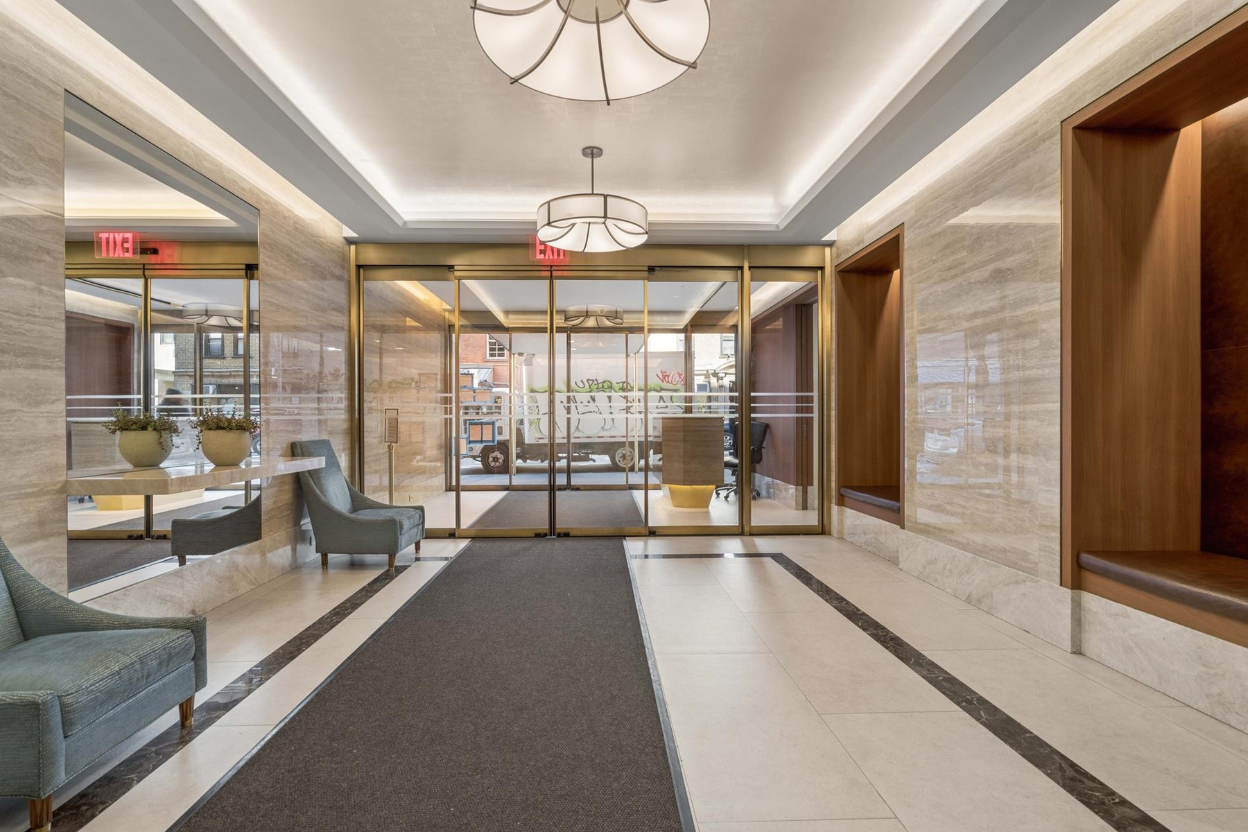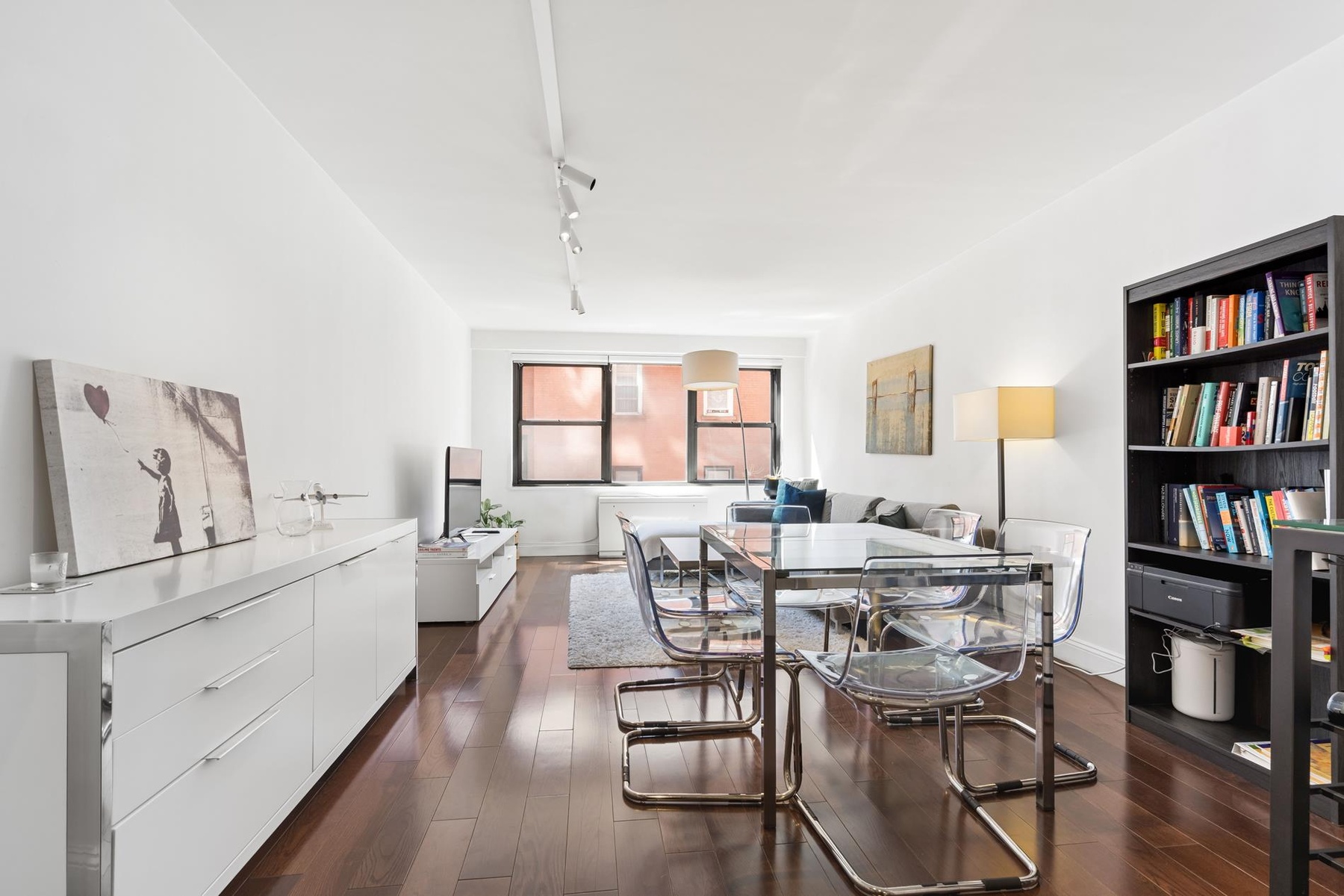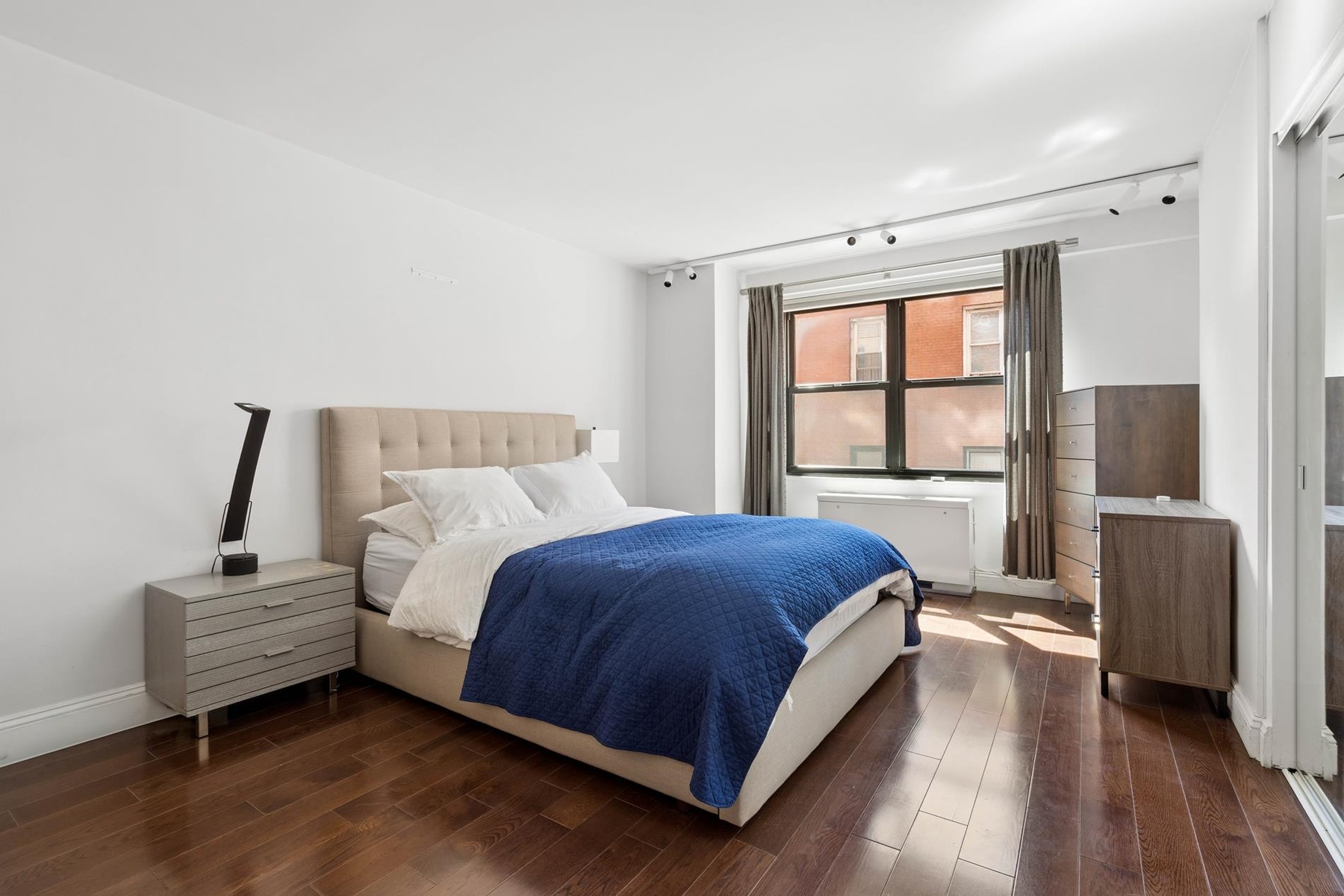 The master bedroom easily fits a king-sized bed and has two large closets, tucked at the end of a hallway for extra privacy. The bathroom has been updated with marble and limestone and is thoughtfully separated from the main living area. Other highlights include gorgeous hardwood floors, amazing natural light throughout, central heat and air conditioning, and plenty of storage space throughout.