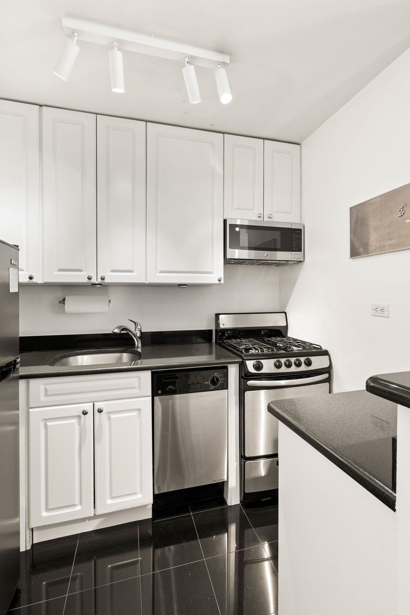 Quiet and full of sunlight, this beautifully renovated one-bedroom, one-bath apartment features a huge living room that easily accommodates both a full seating area and a separate dining space—perfect for entertaining or relaxing at home. The kitchen is clean and modern, with stainless steel appliances (including a dishwasher), black granite counters, a deep sink, and crisp white cabinets.