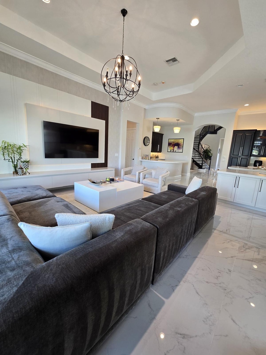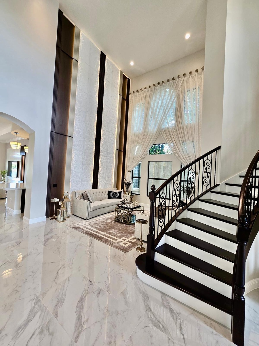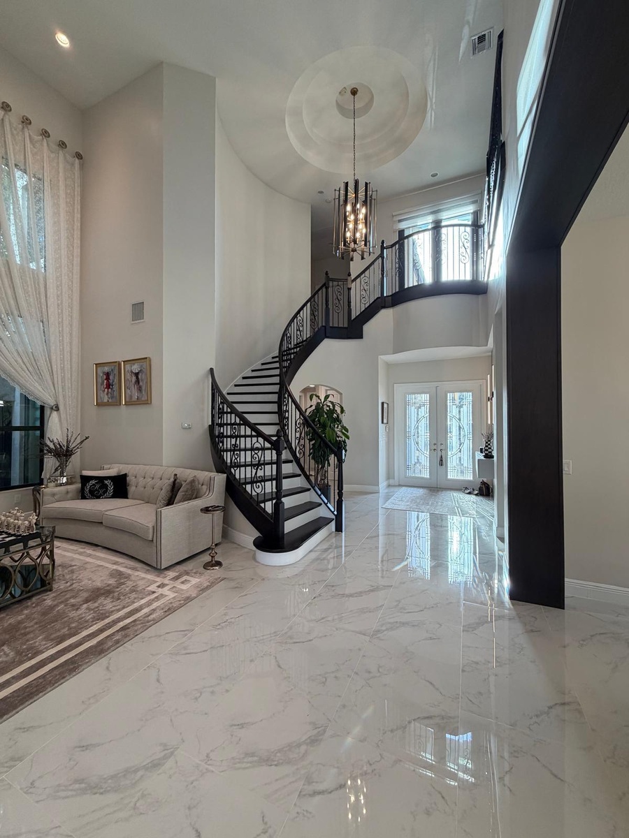 Custom upgrades Vizcaya model lakefront pool home has 4 bedrooms plus Den! High ceilings and expansive floor plan. lake views through impact glass with natural light. Take a dip in the hot tub and heated pool with fountains in a very private, professionally landscaped backyard oasis. wet bar and the gourmet kitchen with two islands, quartz countertops, upgraded cabinets, stainless steel appliances and single bowl sink featuring hot water dispenser. separate dining room or casual breakfast nook. The downstairs master bedroom features his and hers custom closets, crown molding and wood flooring plus marble in the bath. All four spacious suites include walk-in closets and private bathrooms. The large loft/second family room upstairs. Work from home in the office that opens to an atrium.