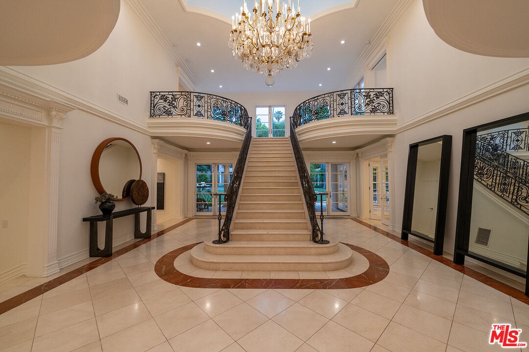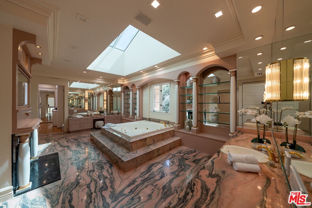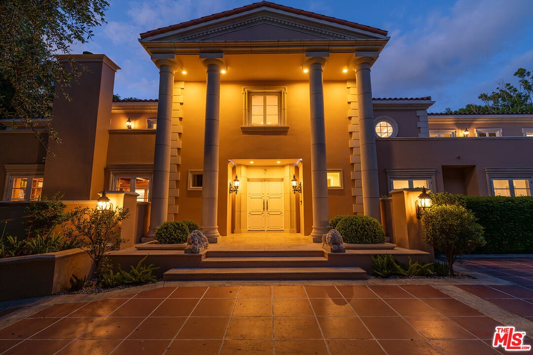 Perched above a long gated driveway, this Grand Mediterranean sits on over an acre of gorgeous resort-like grounds with night lit tennis court. Step inside double doors to discover impressive 2-story entry with skylights and marbled staircase. Enormous stepdown living room highlighted by fireplace, beautiful wood paneled office with wet bar, large formal dining room and decorative kitchen with top-of-the-line appliances, oversized center island and adjacent breakfast room. Extraordinary primary suite features another full living room with fireplace and two separate sumptuous baths highlighted by skylights, jacuzzi tubs, sauna and large walk-in closets. There are 4 additional family bedrooms upstairs, each en suite with walk-in closets and balcony access. Second staircase leads down to spacious family room with fireplace and game room/nook. French doors from almost every living space lead to expansive verandas with outdoor seating, built-in BBQ and pizza oven, and manicured gardens with lush grassy lawn perfect for entertaining! Detached 2-story 2bedroom guest house with kitchen overlooks enticing sparkling pool and spa. Temp controlled wine cellar, 2 staff quarters with shared living space, 2 laundry rooms, solar panels and 3-car garage complete this magnificent estate.