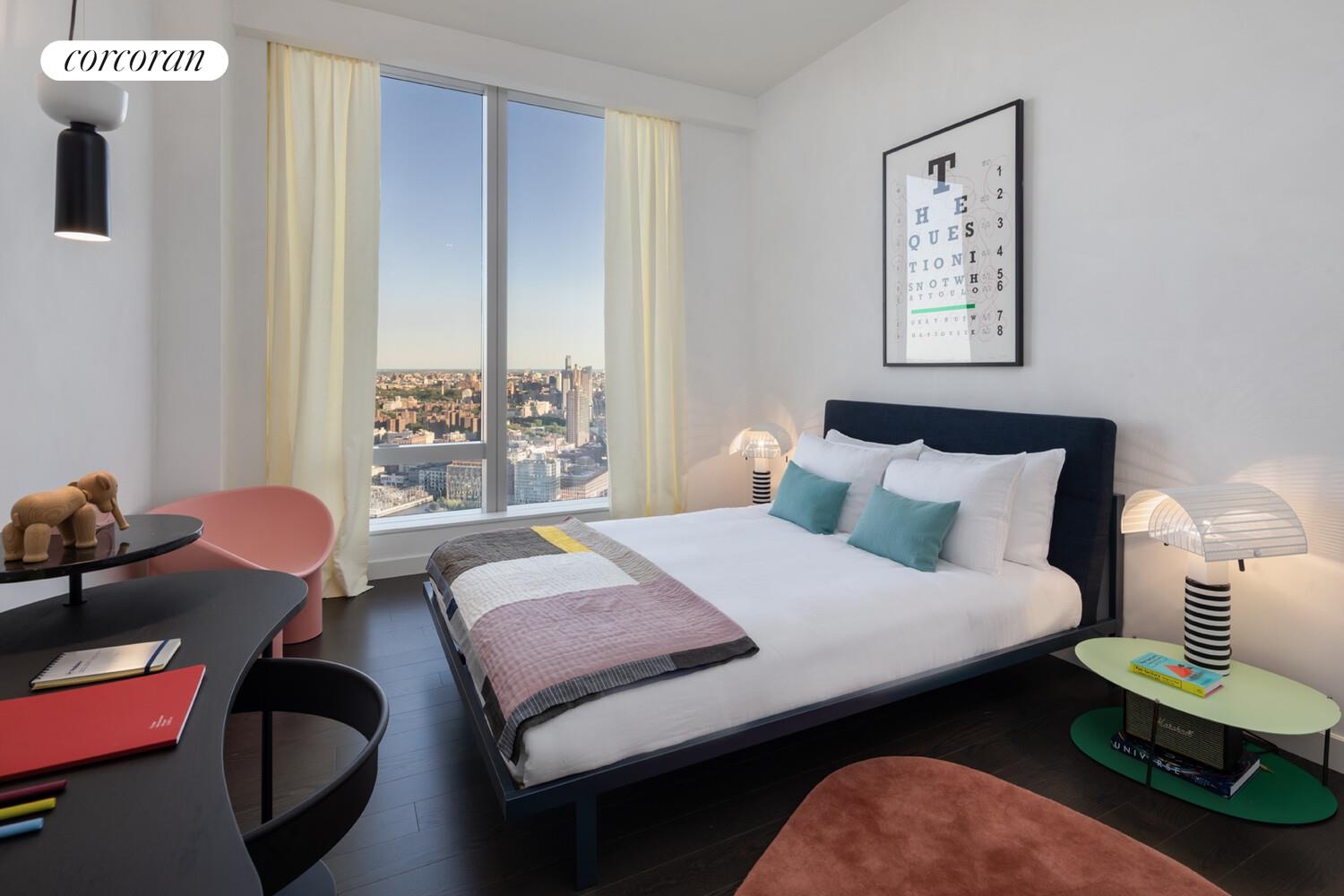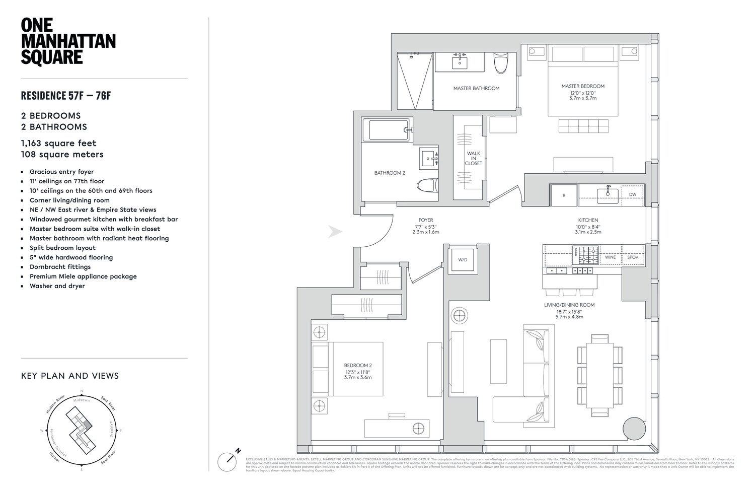 Residence 66F is a 1,163 square foot two bedroom, two bathroom with an open gourmet kitchen and breakfast bar. This spacious corner residence faces South East and North East with views of the city's skyline, Empire State, East River, and Manhattan Bridge. Warm, modern interiors are brought to life by the renowned design team at Meyer Davis Studio. This residence features imported stone and custom finishes, premium Miele appliance package, 5" wide stained oak flooring, master bath with custom wood cabinetry, marble tile walls and mosaic floors with radiant heat, under-mount Wetstyle sink with glass vanity top and Dornbracht polished chrome faucets and a washer and dryer.