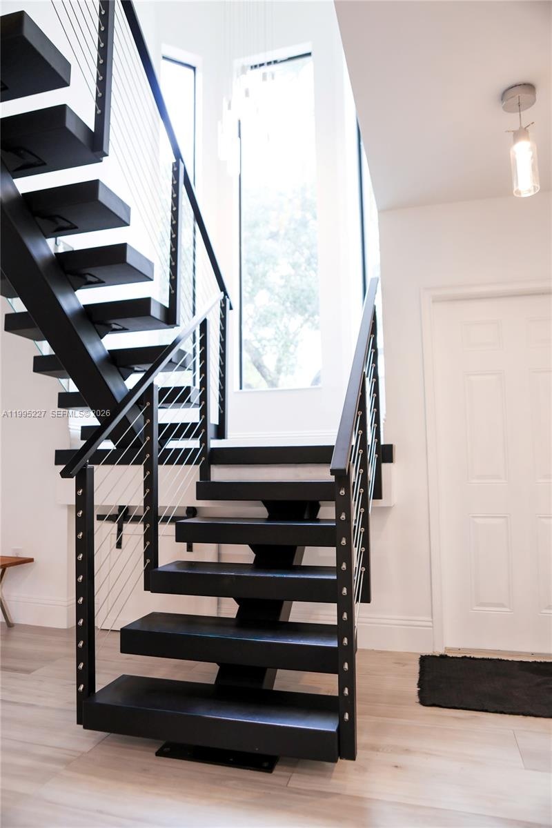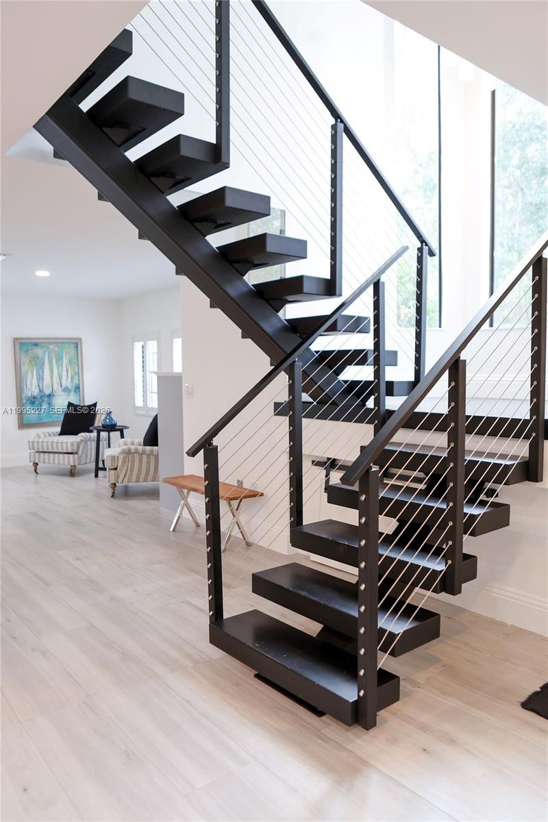 The custom kitchen features WiFi smart appliances and elegant marble countertops. The living room boasts a built-in entertainment center with surround sound speakers, while a dramatic floating stairway leads upstairs.
