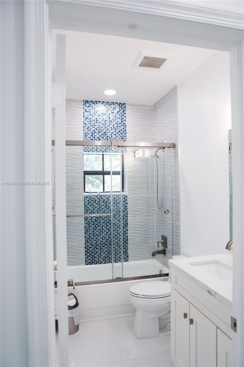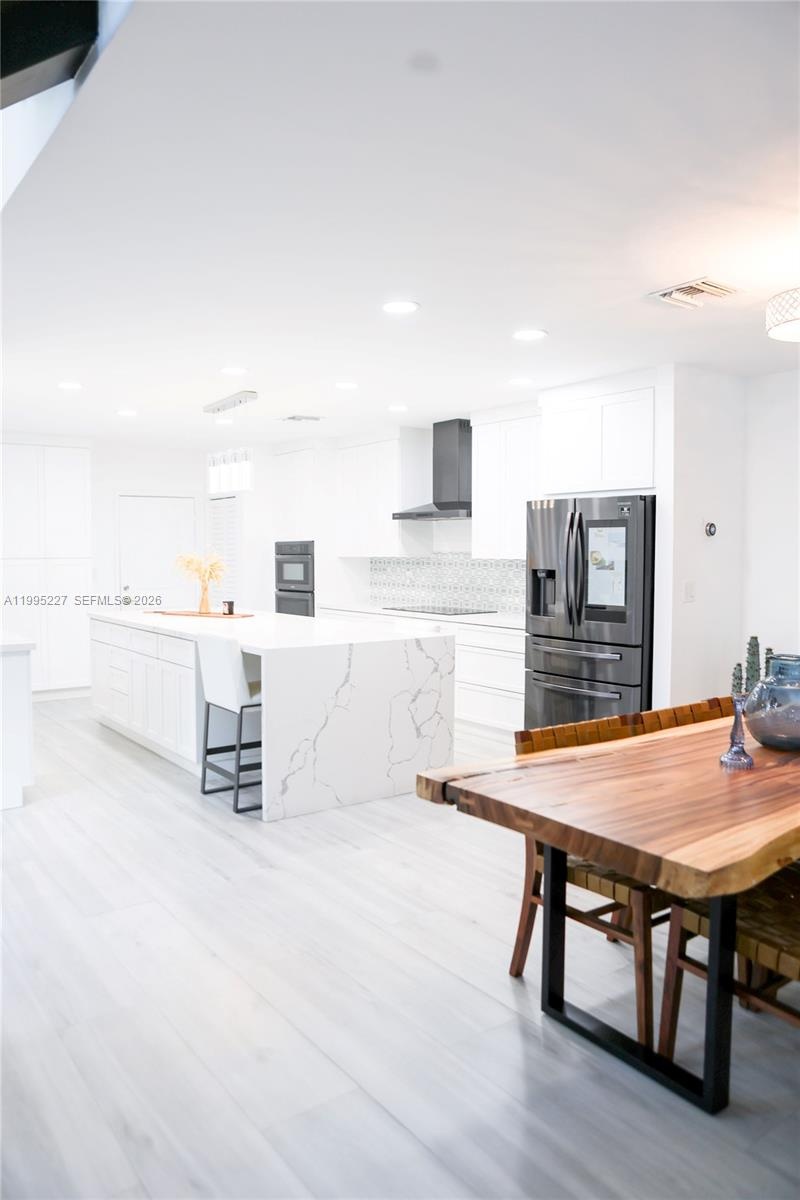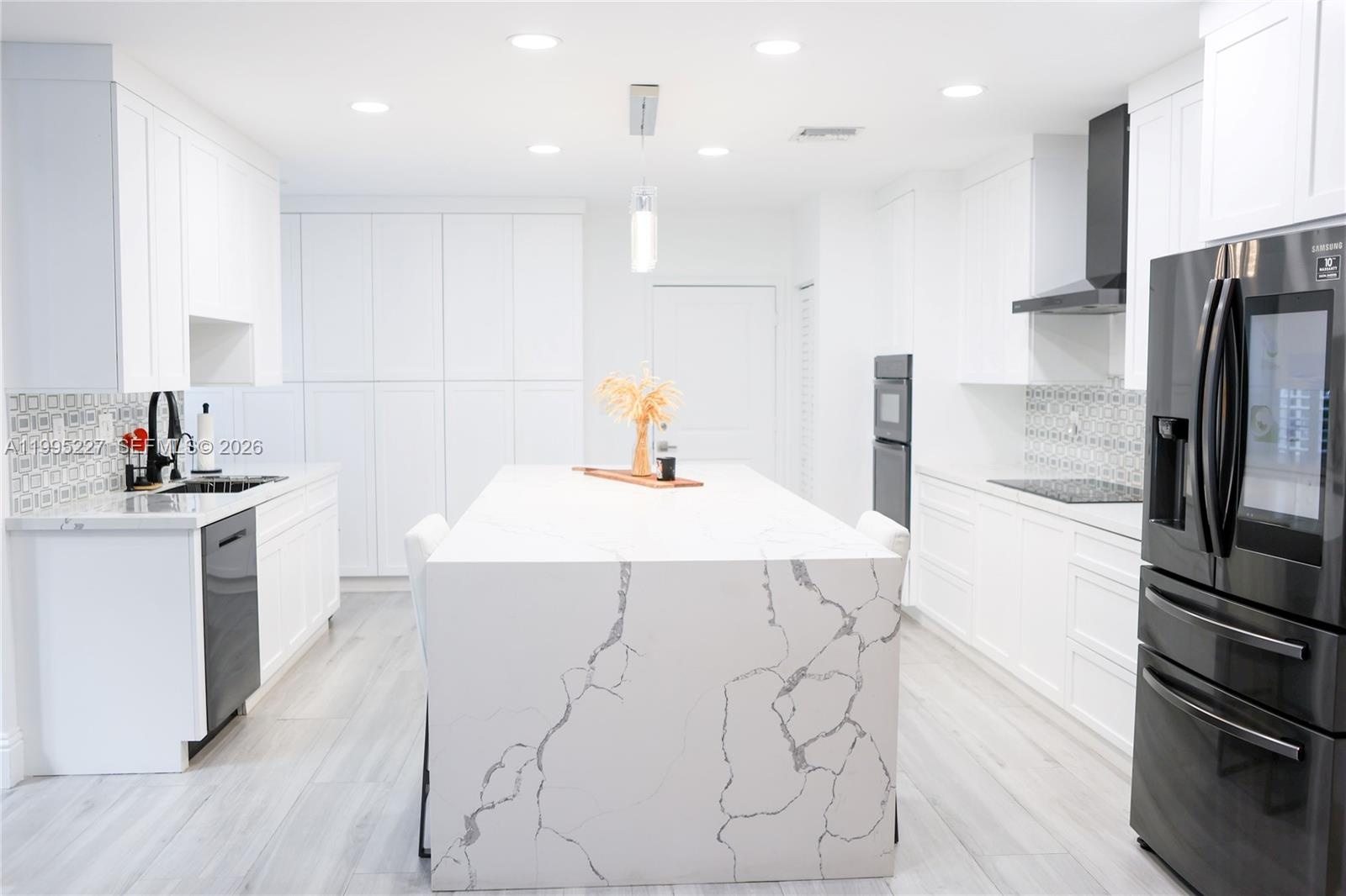 All three bedrooms enjoy private balconies. The master suite is a true retreat with a spa-like bath featuring a rain shower, marble finishes throughout, and spacious California walk-in closets. Additional baths are modern and updated.