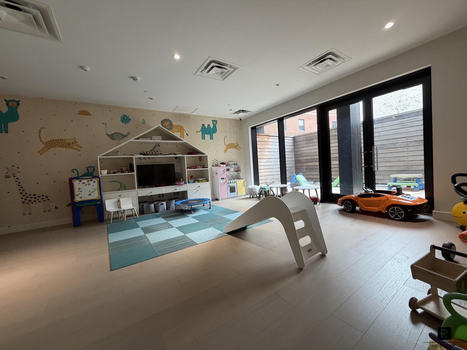 Additional amenities include a thoughtfully designed children’s playroom with access to a private enclosed outdoor space, a beautifully landscaped courtyard with lounge seating, sunbathing areas, barbecue stations, and outdoor refrigerators, as well as the convenience of an on-site parking garage.