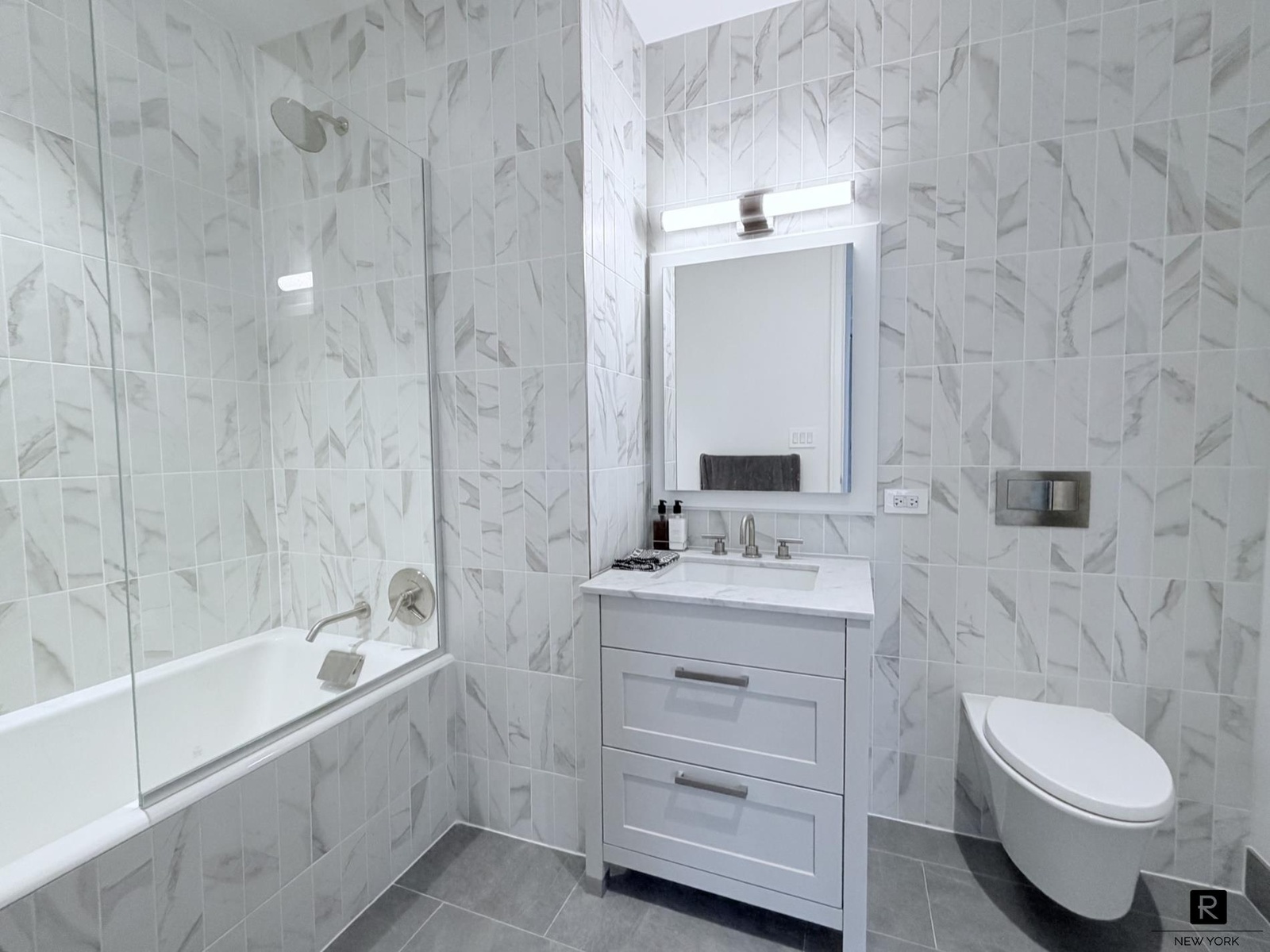 The spa-like bathroom is finished in Italian Carrara marble and features a Kohler vanity and toilet, premium fixtures, and a soaking tub, creating a serene retreat. Additional highlights include an in-unit Bosch washer and dryer and a modern Latch keyless entry system.