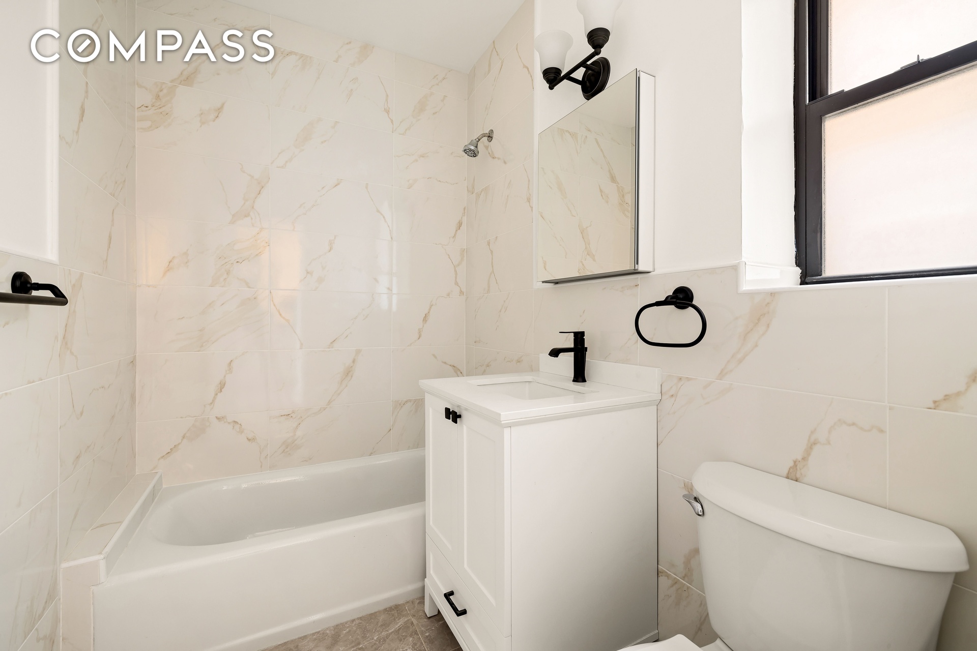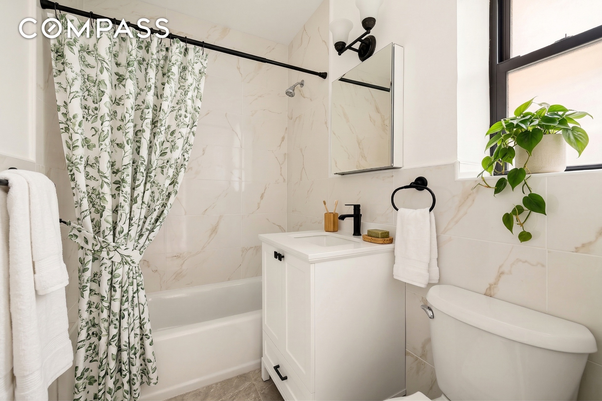 The bathroom is fully renovated with clean, contemporary finishes, including a sleek vanity and a classic tiled shower/tub combination.