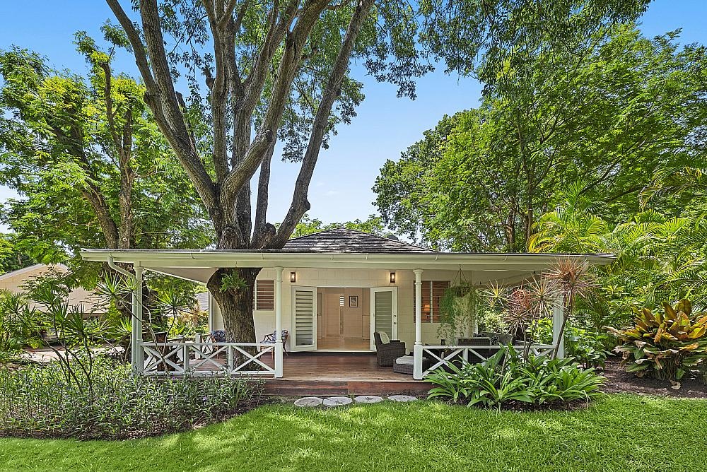 A saltwater swimming pool anchors the outdoor spaces, complemented by a second, beautifully positioned dining gazebo set among mature trees and landscaped gardens - ideal for entertaining or relaxed family living. The primary suite is a private retreat, featuring his-and-hers en suite bathrooms and a generous walk-in dressing room. A second bedroom in the main house also benefits from air-conditioning and ceiling fans, ensuring year-round comfort. Additional practical spaces include a home office, powder room, two-car garage, laundry, staff bathroom, storage room, and drying yard, all thoughtfully integrated. A charming self-contained guest cottage adds flexibility and long-term appeal. Fully air-conditioned, it offers two bedrooms, a bathroom, a modern kitchen, living area, and a spacious verandah - dramatically framed by a mature mahogany tree growing through the structure, creating a truly distinctive feature. The estate is fully enclosed with two automatic gated entrances, enhancing privacy and security.