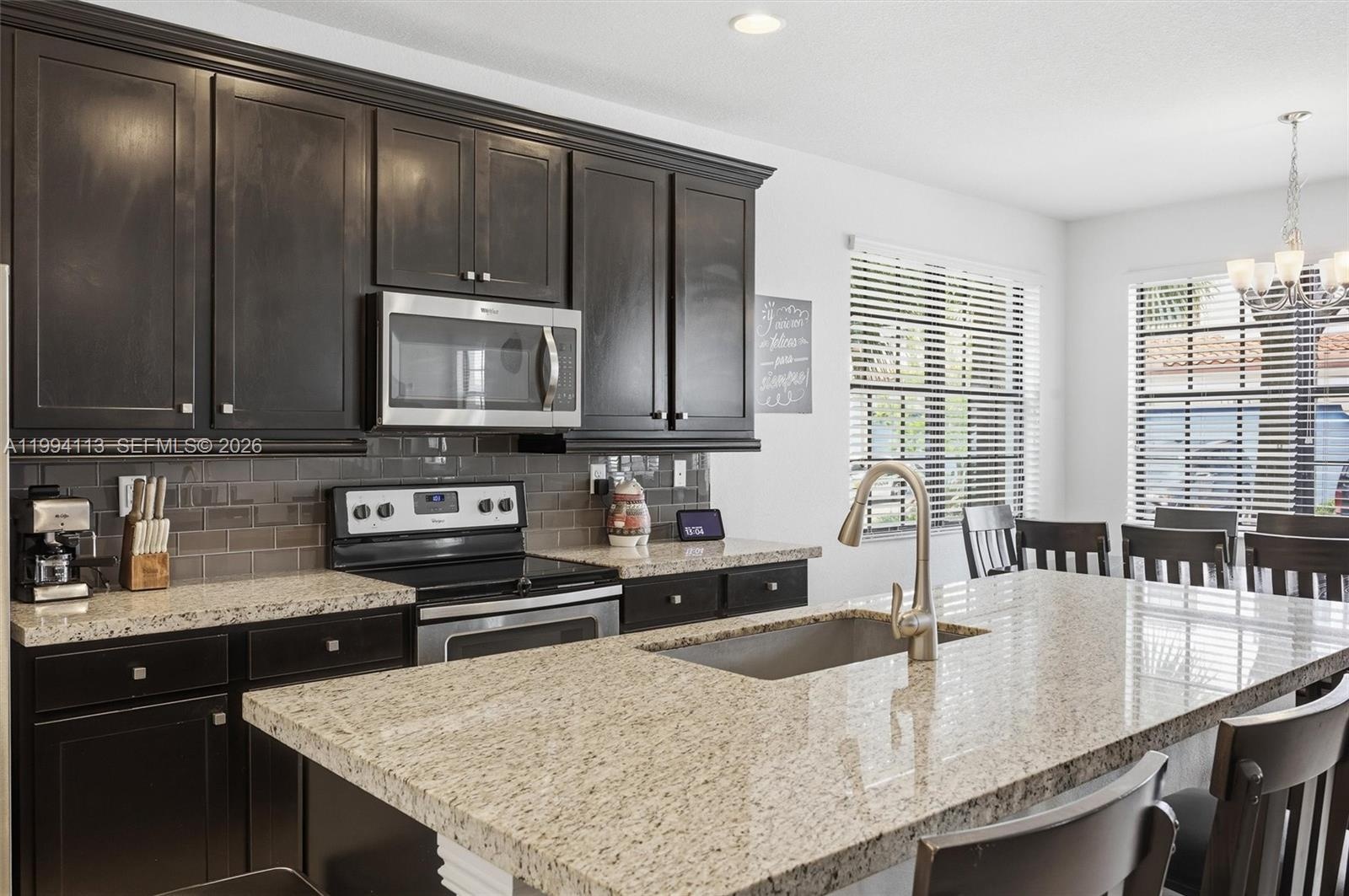 A modern, beautifully maintained townhome in the gated, nicely landscaped community of Raintree at Mayfair. This two floor home boasts 3 bedrooms all with ensuite bathrooms + a powder room. A corner unit, it has extra windows allowing for ample natural light. Downstairs is nicely tiled and is built with a large open concept great room to accommodate living and dining comfortably. The kitchen has stainless steel Whirlpool appliances, a large center aisle, dark wood cabinets and mottled solid granite counters that are found throughout the home. Your master has dual closets and a private, palm shaded balcony. It's completed with separate tub, glass enclosed shower & double basins. Upstairs accommodates a convenient laundry room with washer & dryer & cozy mezzanine you can adapt to your needs. Your garage has 2 car spaces with extra room for storage or even a motorcycle. This lovely community has a gym, heated pool and a room with full kitchen for meetings or parties. Beyond that, it is great for taking a stroll, walking your dog or anything else you choose. A kids play area is being installed later this year. At Raintree, you are close to the I75, plenty of shops, restaurants and many other services. This is a wonderful location in Pembroke Pines.