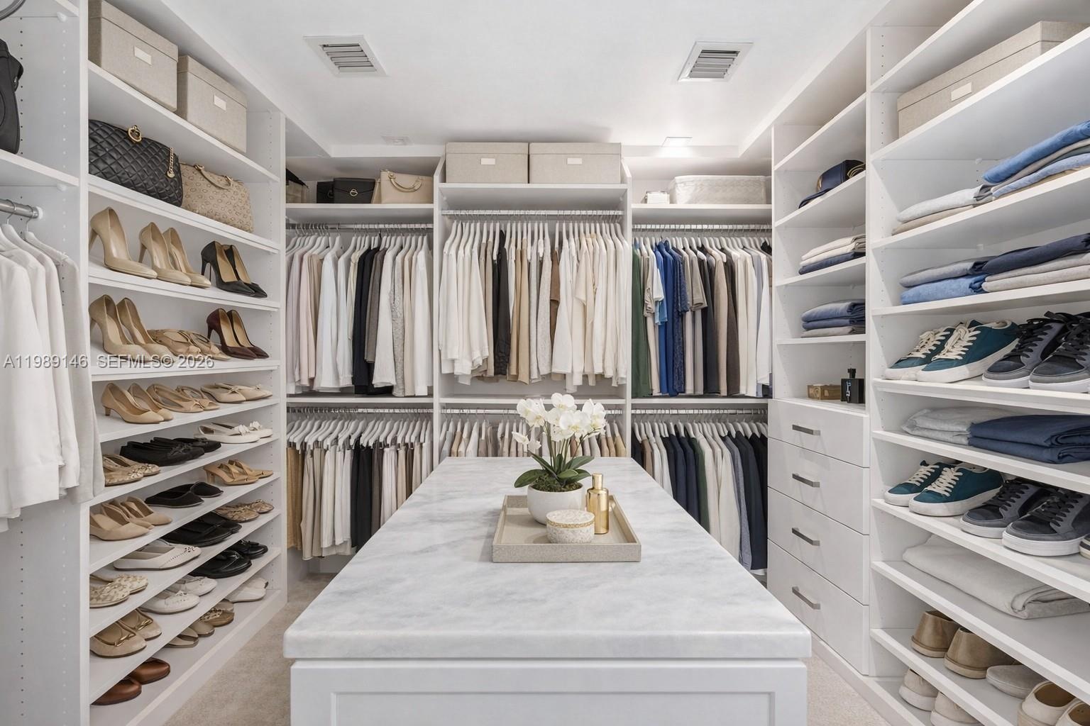 A dedicated home office with a custom built-in workstation, motorized automatic blinds, and custom-designed closets throughout reflect the thoughtful attention to detail at every turn.