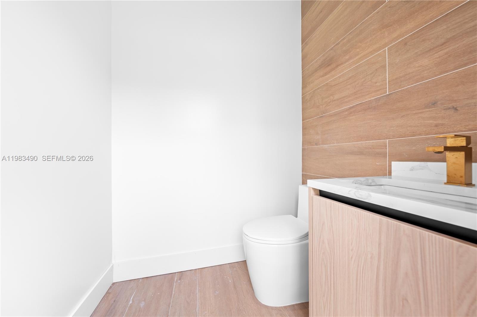 The open-concept layout is anchored by a designer kitchen with quartzite Bianco Superiore countertops, Porcelana Calacatta Borghini surfaces, custom white oak and hardwood cabinetry, and Bosch appliances. Italian Venice Blanco porcelain flooring flows throughout, complemented by Spanish larch wood accent walls that add warmth and texture.