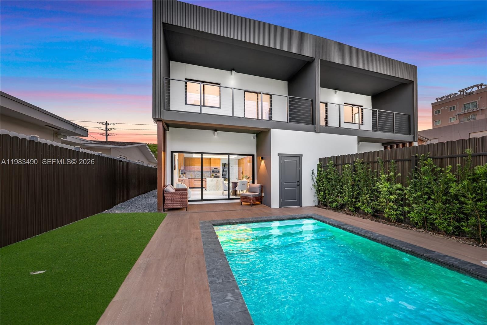 The outdoor space is designed for entertaining, complete with a saltwater heated pool, WiFi-controlled spa jets, a Coyote summer kitchen, and a Spanish porcelain Augusta pool deck. Additional highlights include Masonite fiberglass entry doors, soft-closing garage doors, and an extensive drainage system for added peace of mind.