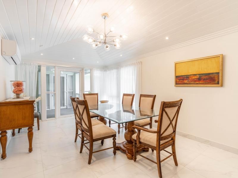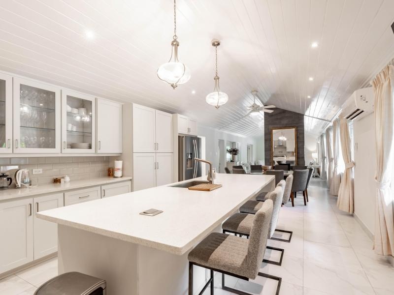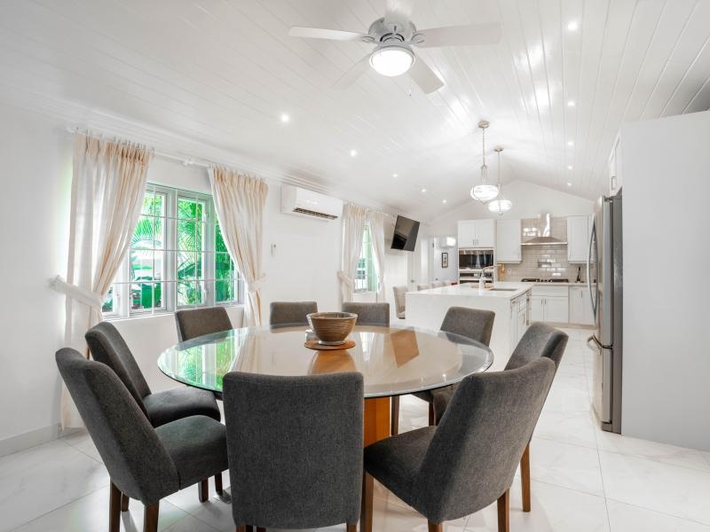 Living spaces flow seamlessly from indoors to out. A spacious living room with vaulted ceilings opens onto covered terraces designed for outdoor dining and shaded lounging. A formal dining area, separate TV or family room, and a modern kitchen with granite countertops support both everyday living and elegant entertaining. Practical features such as a one-car garage, dedicated laundry room, and an installed solar energy system enhance both convenience and efficiency - an increasingly desirable element of luxury living in Barbados.