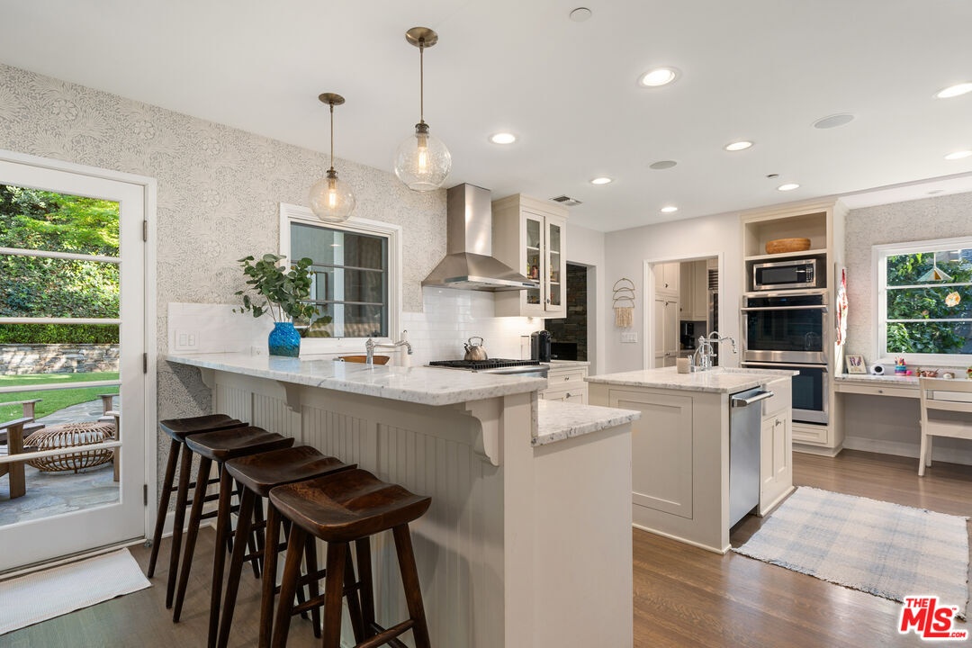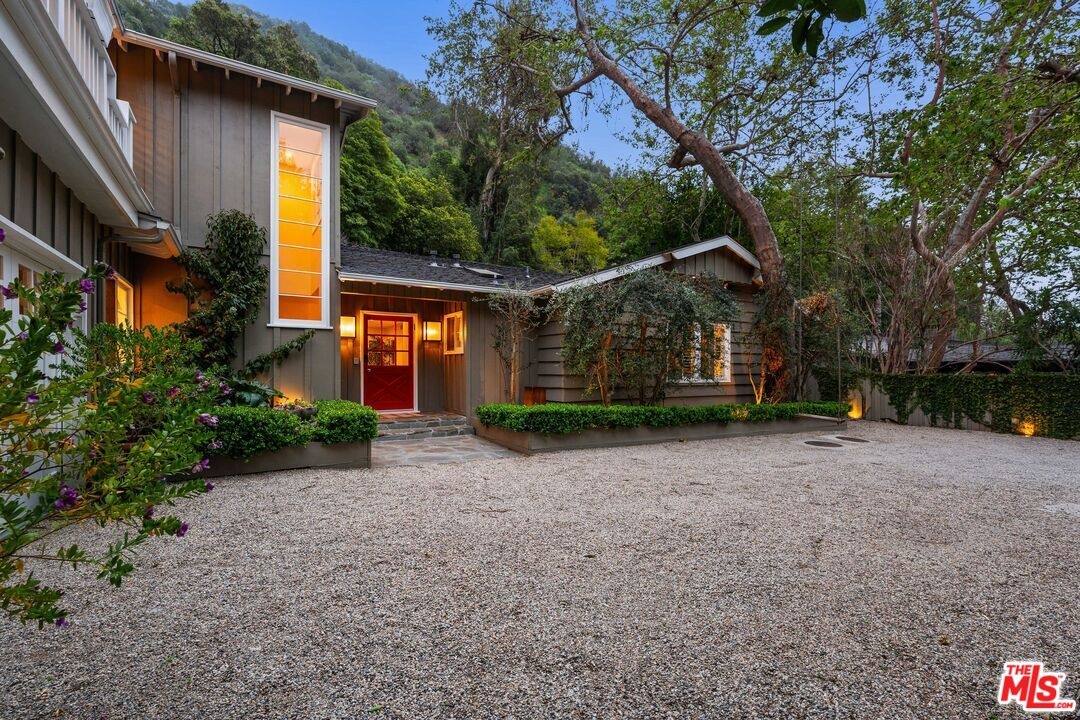 Welcome to this enchanting Mandeville Canyon country estate, tucked behind gates and set amongst majestic sycamores. This private sanctuary offers a rare blend of warmth, seclusion, and refined country traditional charm. A long, private driveway leads you into a realm where nature and elegance exist in beautiful harmony. Thoughtfully updated and completely turn key with timeless charm, the home features five bedrooms and four bathrooms, with the expansive primary suite occupying the entire upper level, a peaceful retreat among the treetops. Upon entry, you're welcomed into a light-filled living room with a double-sided stone fireplace that flows seamlessly into the dining room. French doors in both spaces invite the outdoors in, opening to an entertainer's paradise: a serene backyard framed by stacked stone, an alfresco kitchen, a glowing fireplace, and a saltwater pool. At the heart of the home, a sun-drenched chef's kitchen awaits complete with Carrara marble countertops, professional-grade appliances, and a cozy built-in banquette, perfect for morning rituals or evening gatherings. Just moments from scenic hiking trails and the charm of Brentwood Village, this is canyon living at its most idyllic. An extraordinary setting where every detail whispers peace, privacy, and possibility.