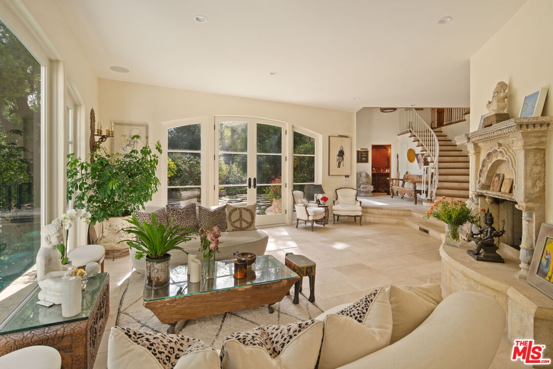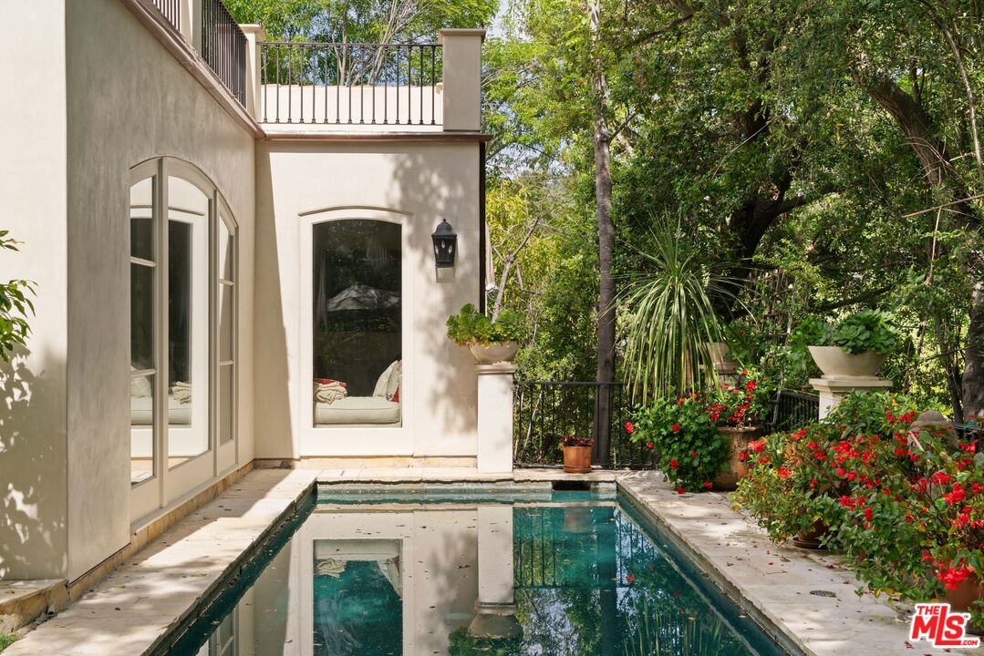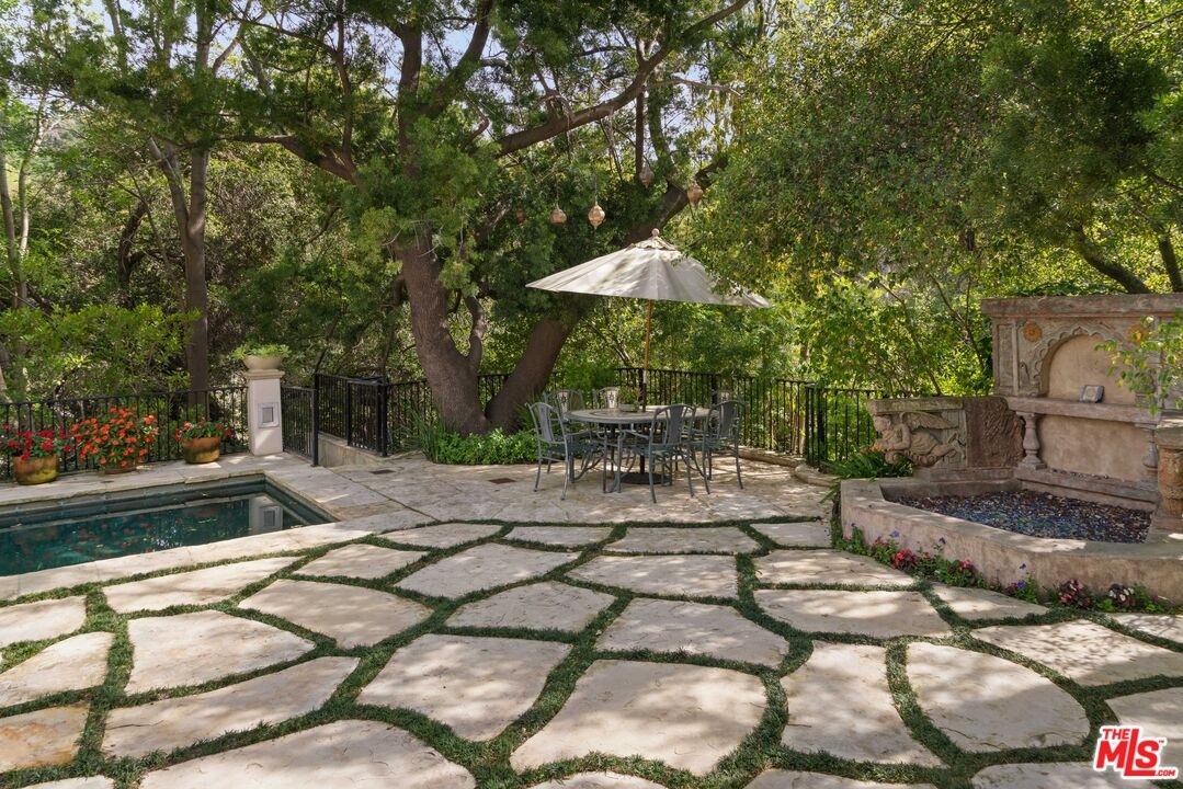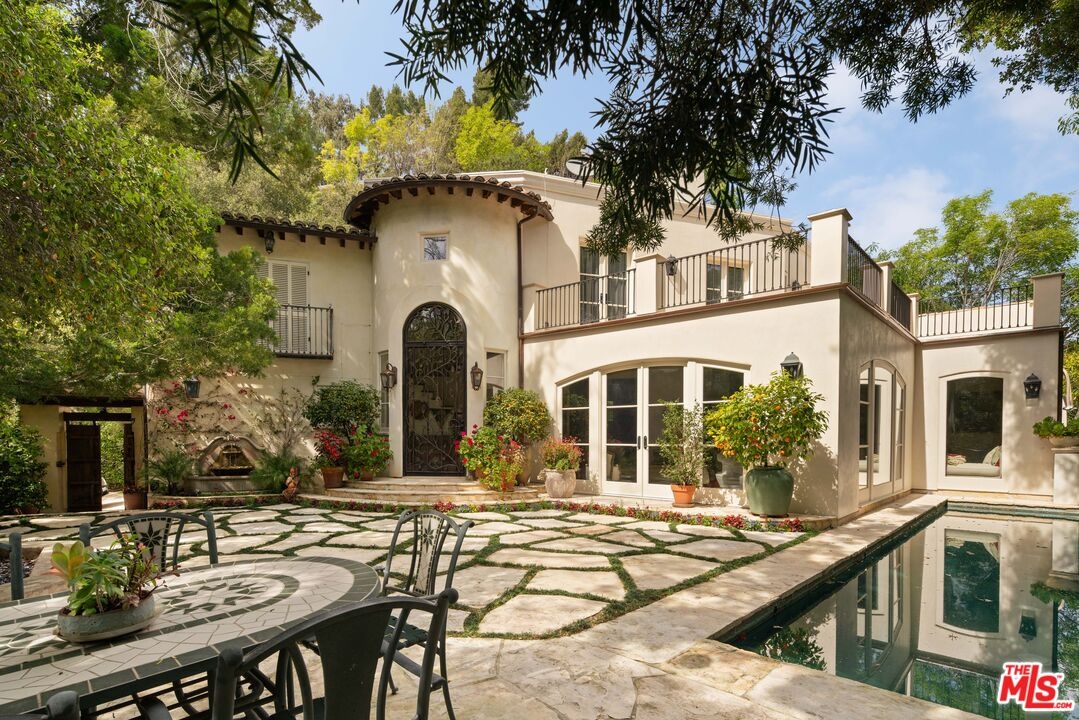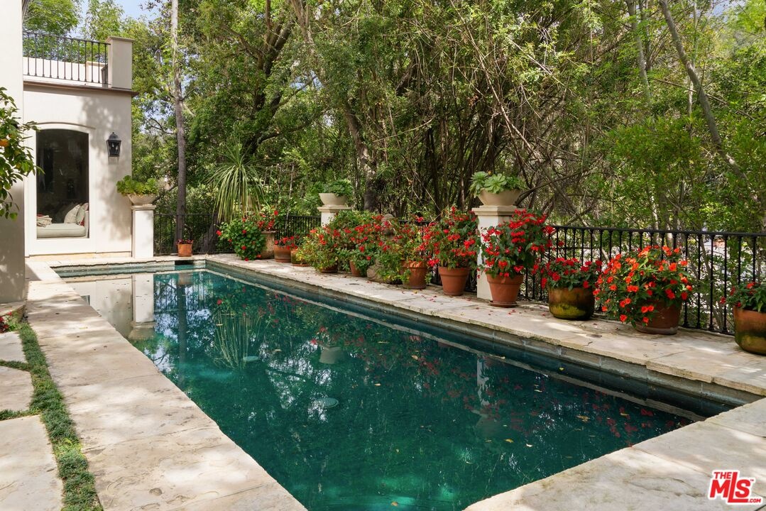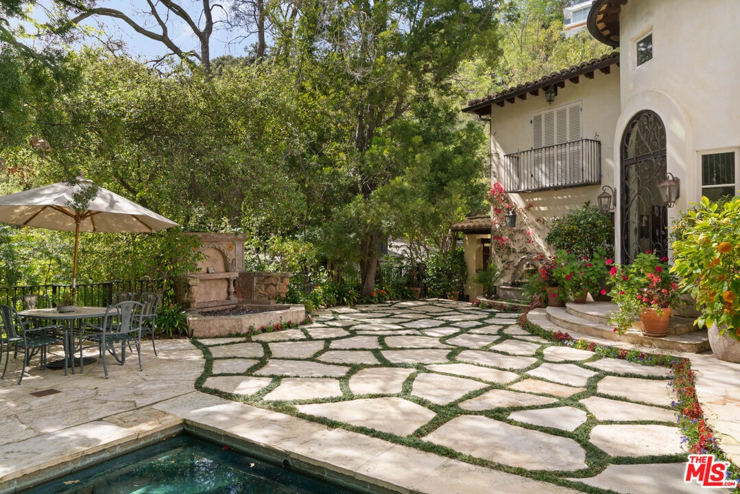 Expansive Estate in BHPO with Art Studio and Pool. Nestled on a semi-private drive in the foothills of Beverly Hills Post Office, enter through the gate to a stunning courtyard complete with a waterfall, pool, firepit and generous space to dine and entertain under open sky. The custom iron door opens to a soaring foyer where the step-down living room is generous and light-filled, anchored by a double-sided fireplace shared with the chef's kitchen. The kitchen features a large island, cozy breakfast nook, and French doors that open to a serene canyon garden. Off the kitchen, a private maid's quarters with a full ensuite bath adds rare practicality. The living room flows into a generous screening room which leads to a skylit art studio with bonus basement storage. A separate den/office and laundry room complete the downstairs. Upstairs, two guest suites share a connected bath, while the primary suite is its own world: a large terrace overlooking the pool, luxurious bath, massive closet, and a private meditation room. A home built for epic gatherings where a sweeping floorplan flows from indoors to out, with surround sound speakers in every room and outside that take your hosting to the next level. A canyon retreat of extraordinary character and privacy, entirely one of a kind.
