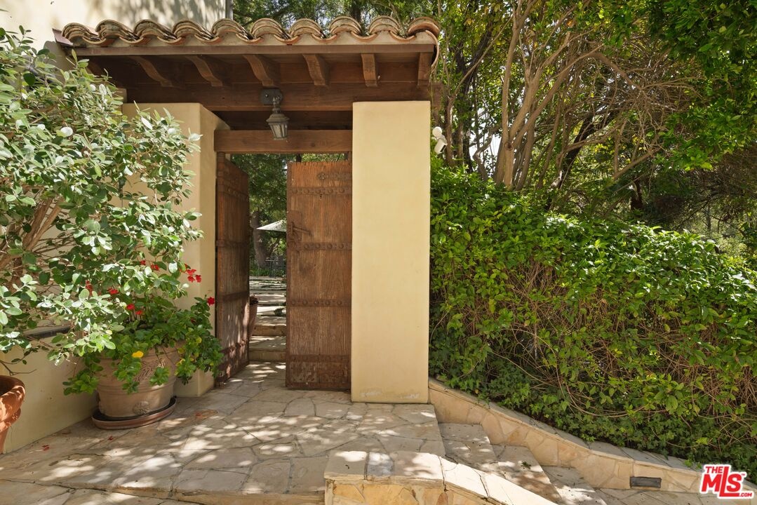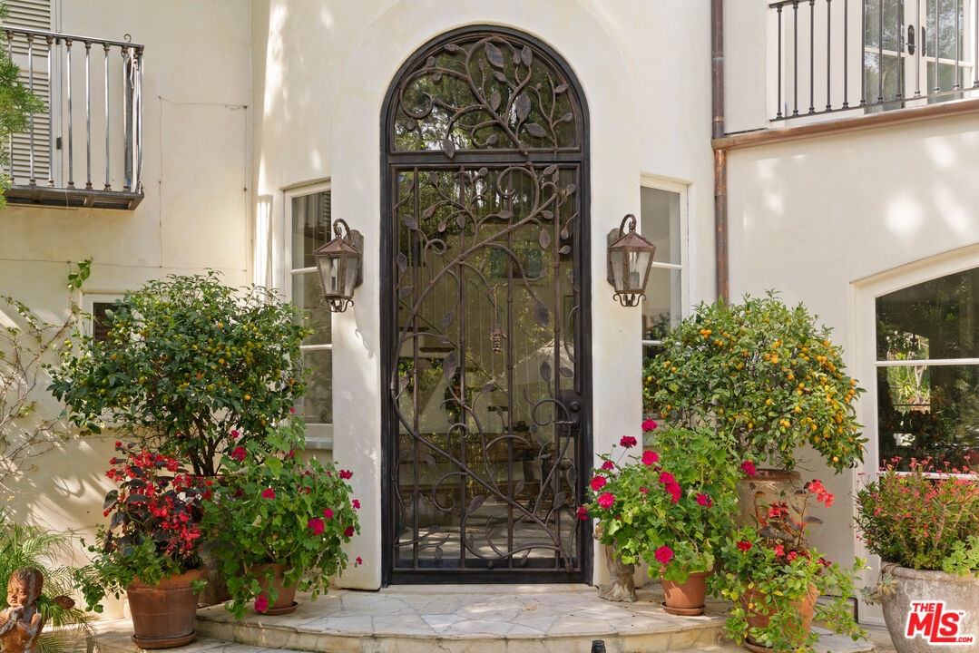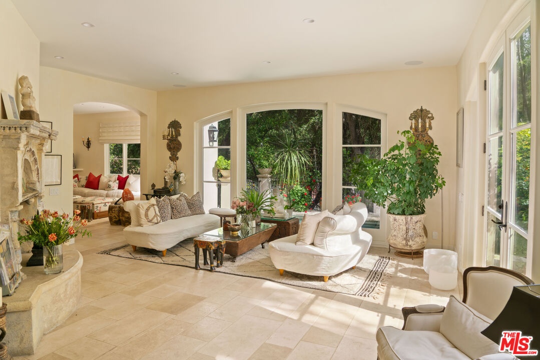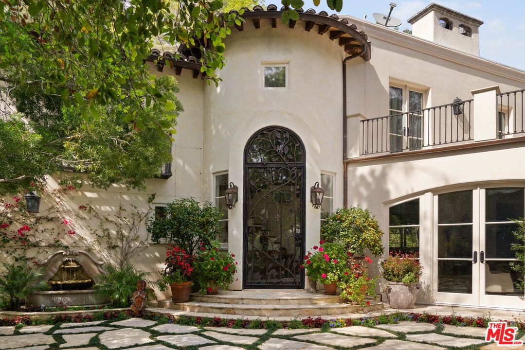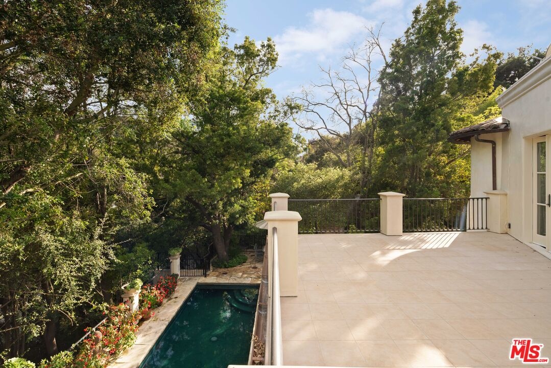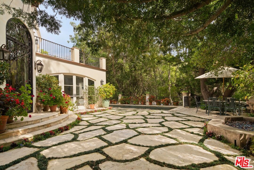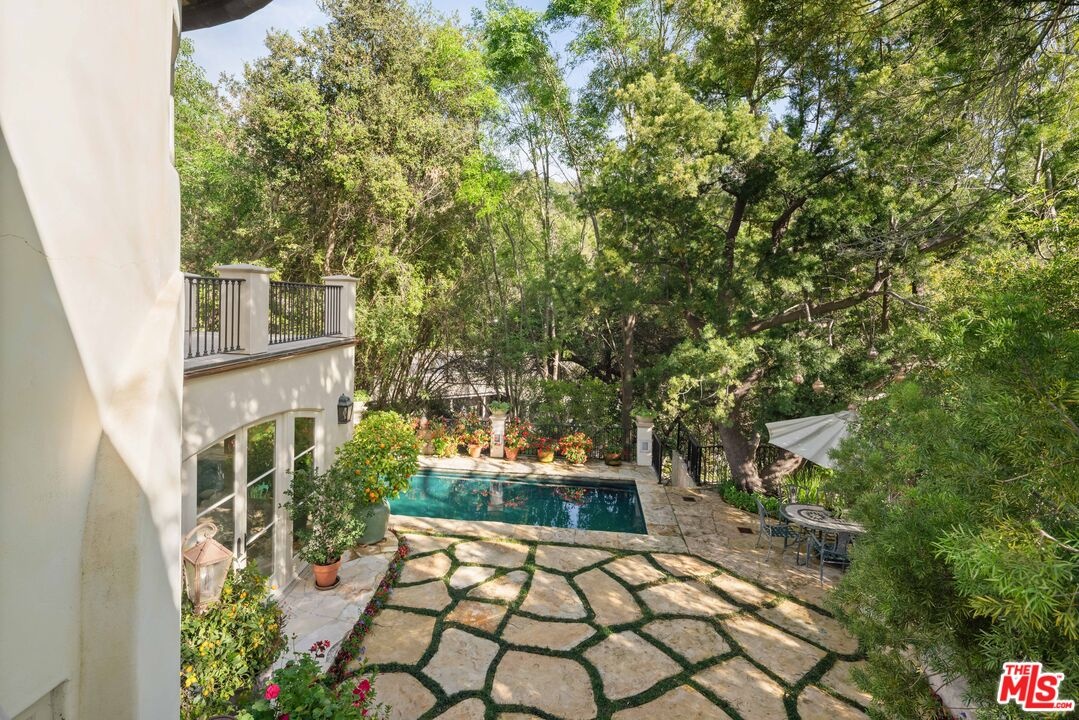 Expansive Estate in BHPO with Art Studio and Pool. Nestled on a semi-private drive in the foothills of Beverly Hills Post Office, enter through the gate to a stunning courtyard complete with a waterfall, pool, firepit and generous space to dine and entertain under open sky. The custom iron door opens to a soaring foyer where the step-down living room is generous and light-filled, anchored by a double-sided fireplace shared with the chef's kitchen. The kitchen features a large island, cozy breakfast nook, and French doors that open to a serene canyon garden. Off the kitchen, a private maid's quarters with a full ensuite bath adds rare practicality. The living room flows into a generous screening room which leads to a skylit art studio with bonus basement storage. A separate den/office and laundry room complete the downstairs. Upstairs, two guest suites share a connected bath, while the primary suite is its own world: a large terrace overlooking the pool, luxurious bath, massive closet, and a private meditation room. A home built for epic gatherings where a sweeping floorplan flows from indoors to out, with surround sound speakers in every room and outside that take your hosting to the next level. A canyon retreat of extraordinary character and privacy, entirely one of a kind.