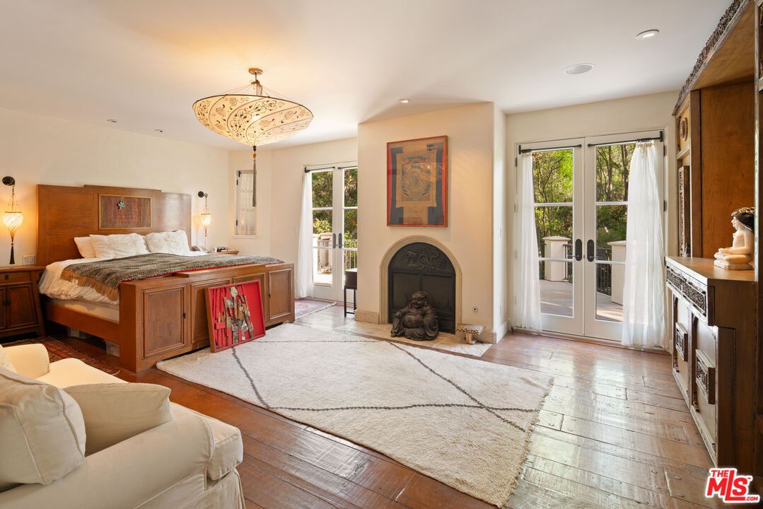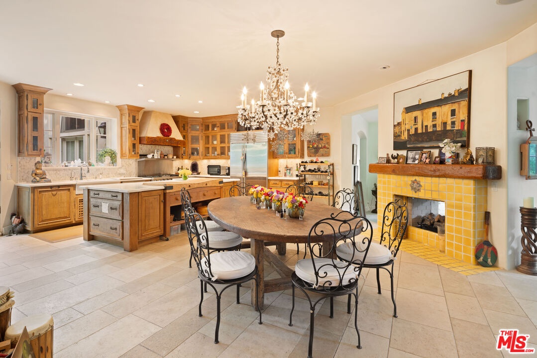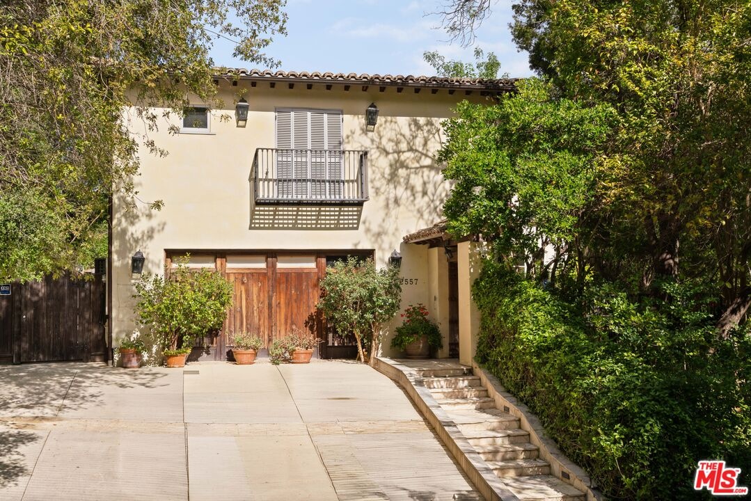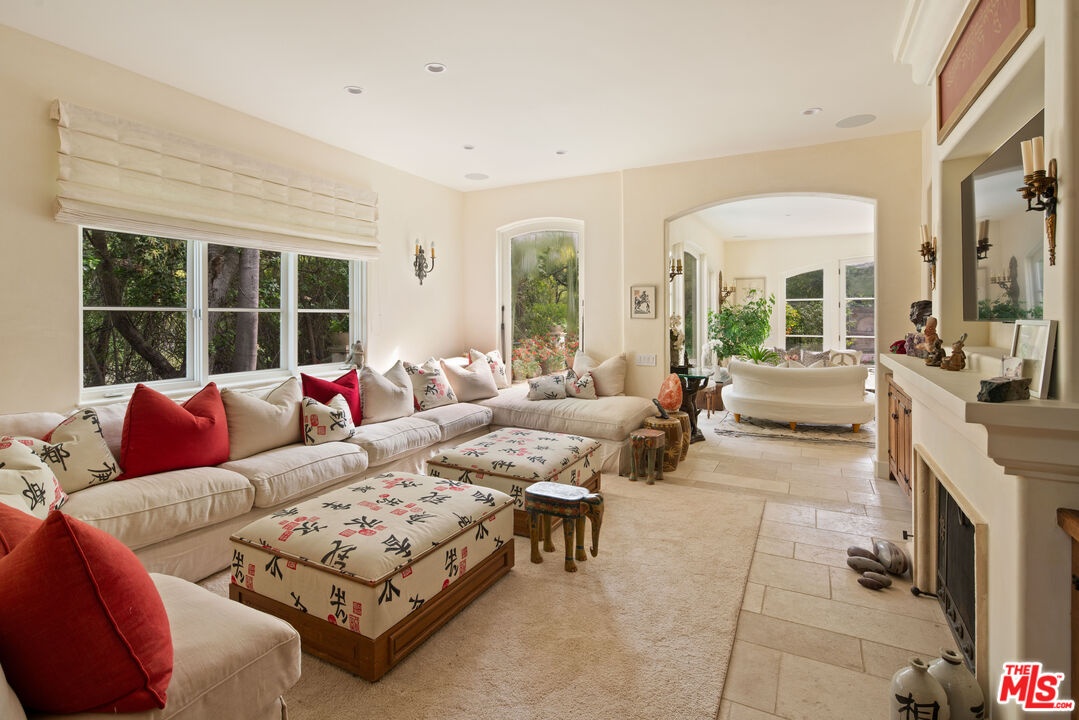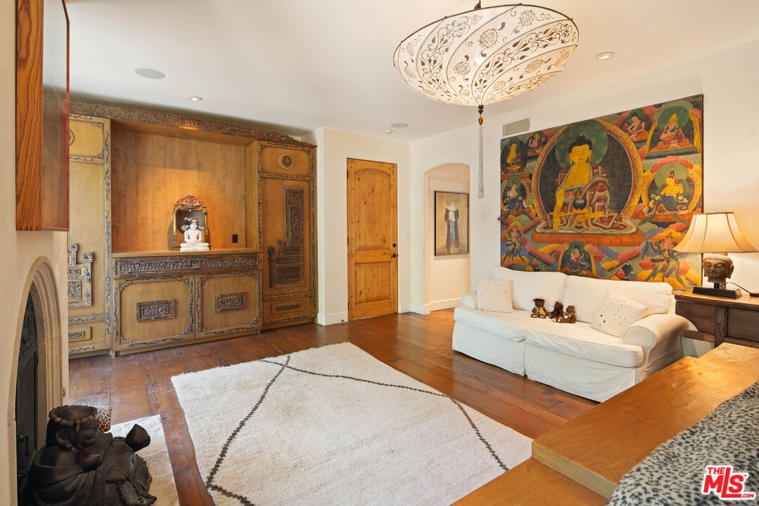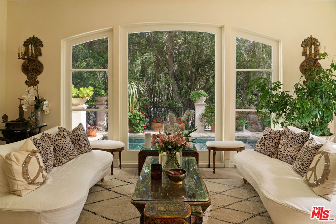 Expansive Estate in BHPO with Art Studio and Pool. Nestled on a semi-private drive in the foothills of Beverly Hills Post Office, enter through the gate to a stunning courtyard complete with a waterfall, pool, firepit and generous space to dine and entertain under open sky. The custom iron door opens to a soaring foyer where the step-down living room is generous and light-filled, anchored by a double-sided fireplace shared with the chef's kitchen. The kitchen features a large island, cozy breakfast nook, and French doors that open to a serene canyon garden. Off the kitchen, a private maid's quarters with a full ensuite bath adds rare practicality. The living room flows into a generous screening room which leads to a skylit art studio with bonus basement storage. A separate den/office and laundry room complete the downstairs. Upstairs, two guest suites share a connected bath, while the primary suite is its own world: a large terrace overlooking the pool, luxurious bath, massive closet, and a private meditation room. A home built for epic gatherings where a sweeping floorplan flows from indoors to out, with surround sound speakers in every room and outside that take your hosting to the next level. A canyon retreat of extraordinary character and privacy, entirely one of a kind.
