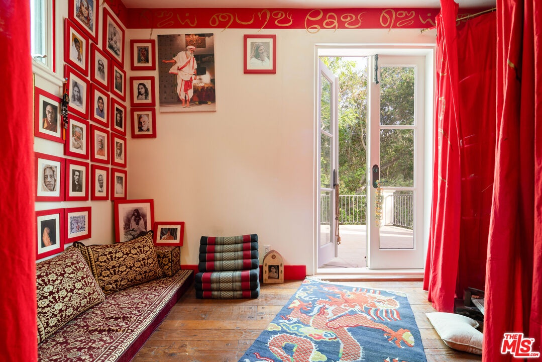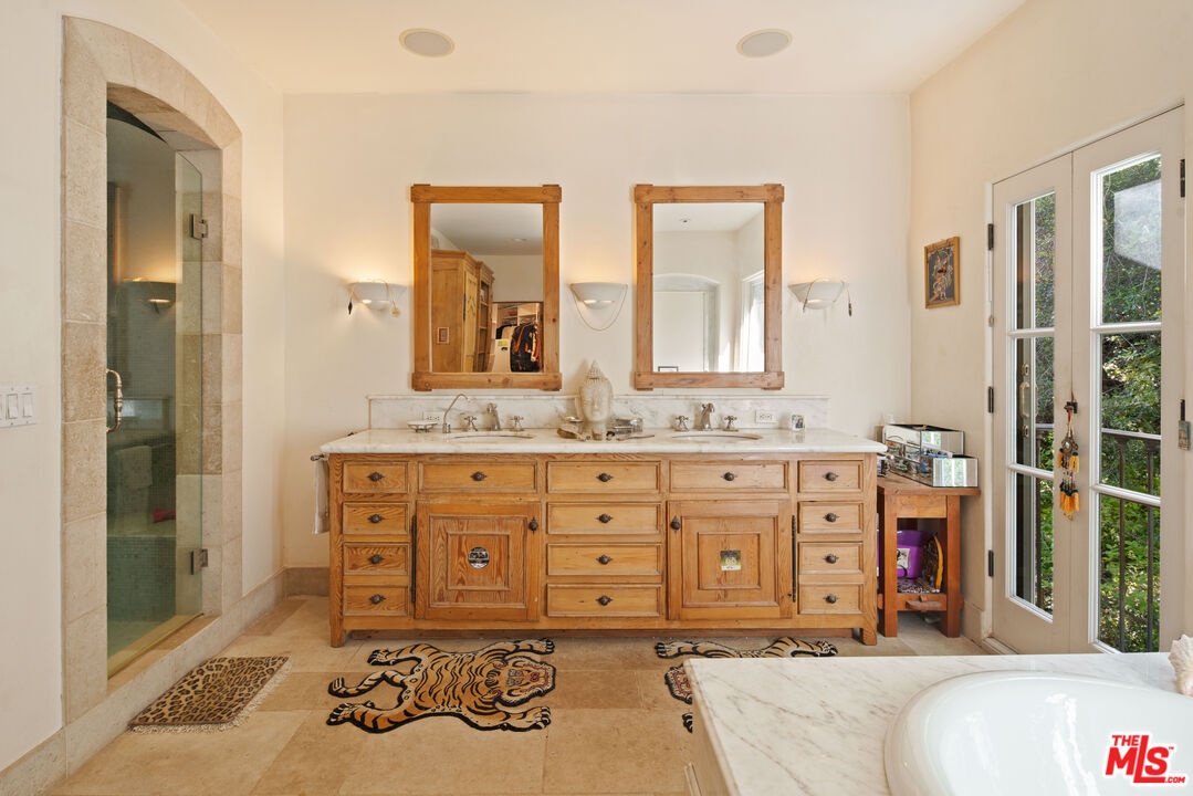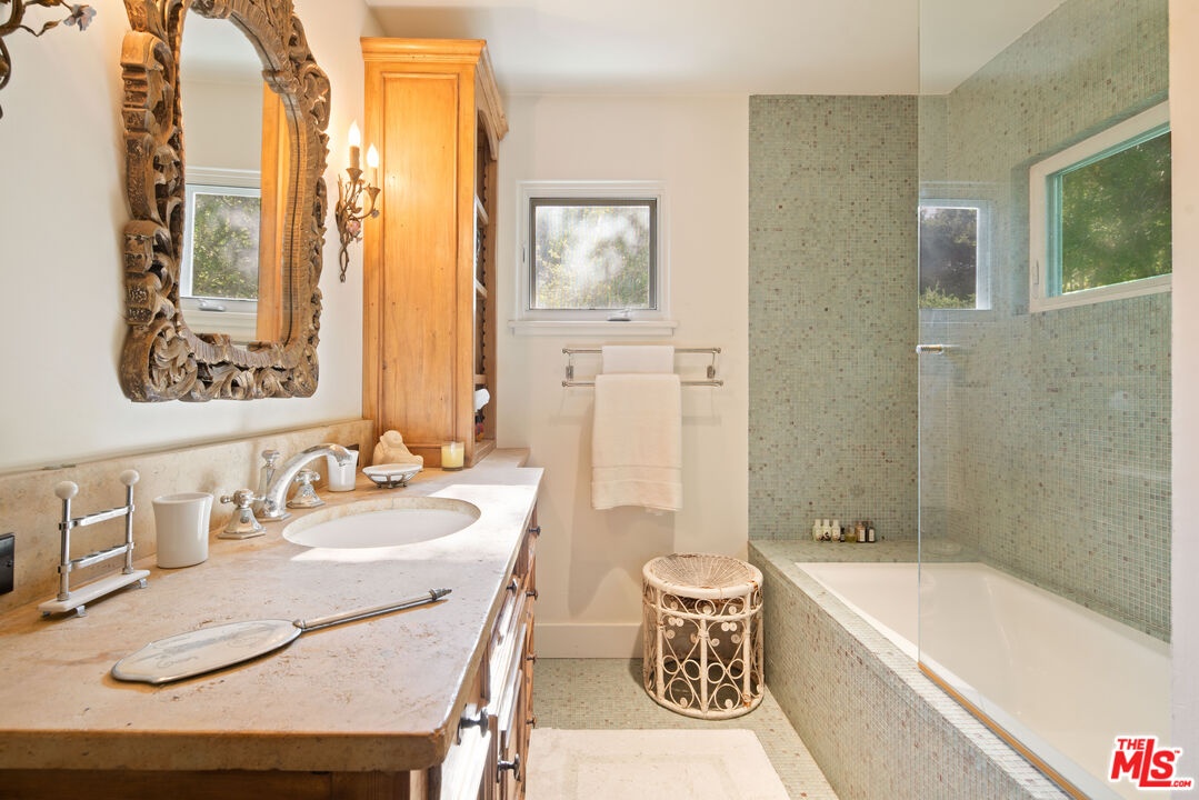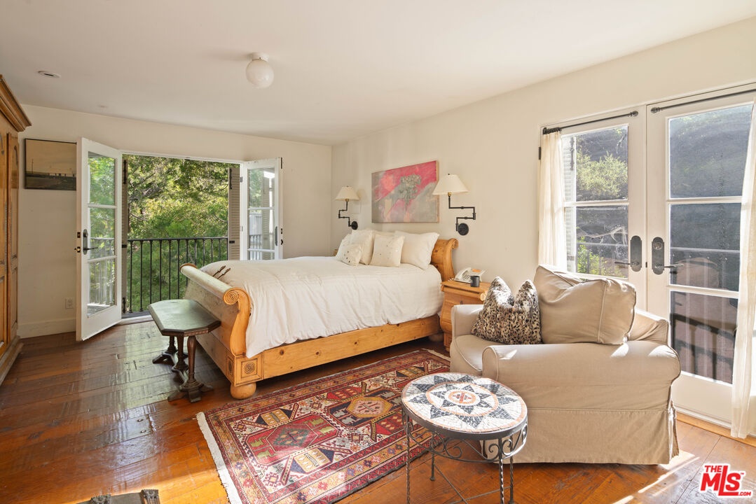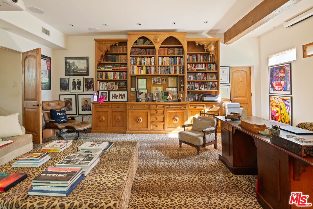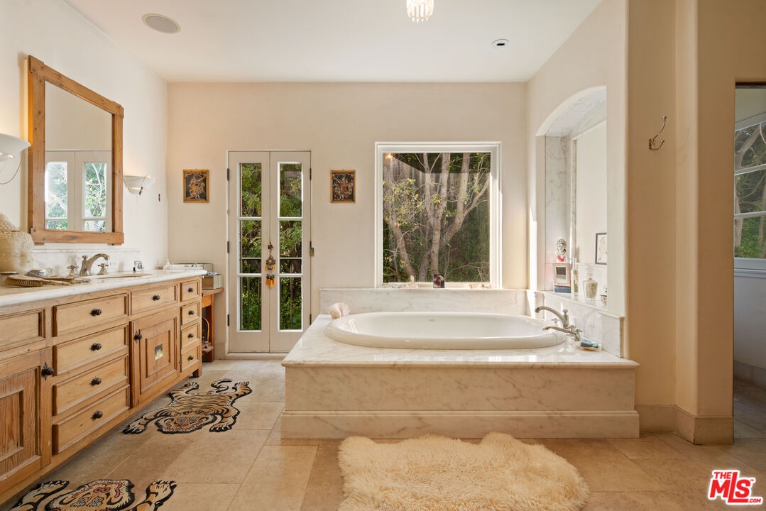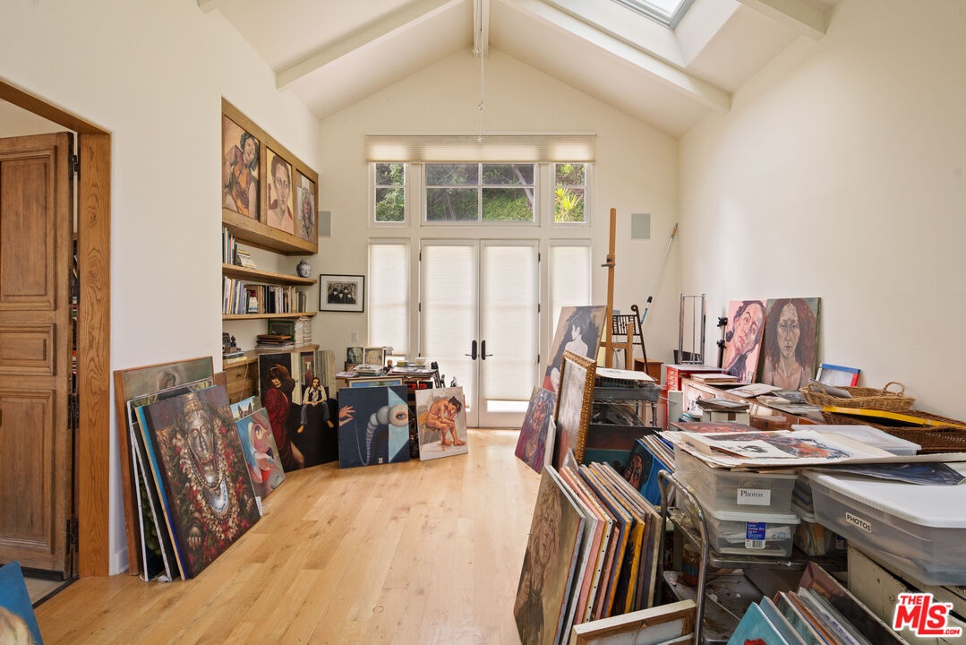 Expansive Estate in BHPO with Art Studio and Pool. Nestled on a semi-private drive in the foothills of Beverly Hills Post Office, enter through the gate to a stunning courtyard complete with a waterfall, pool, firepit and generous space to dine and entertain under open sky. The custom iron door opens to a soaring foyer where the step-down living room is generous and light-filled, anchored by a double-sided fireplace shared with the chef's kitchen. The kitchen features a large island, cozy breakfast nook, and French doors that open to a serene canyon garden. Off the kitchen, a private maid's quarters with a full ensuite bath adds rare practicality. The living room flows into a generous screening room which leads to a skylit art studio with bonus basement storage. A separate den/office and laundry room complete the downstairs. Upstairs, two guest suites share a connected bath, while the primary suite is its own world: a large terrace overlooking the pool, luxurious bath, massive closet, and a private meditation room. A home built for epic gatherings where a sweeping floorplan flows from indoors to out, with surround sound speakers in every room and outside that take your hosting to the next level. A canyon retreat of extraordinary character and privacy, entirely one of a kind.