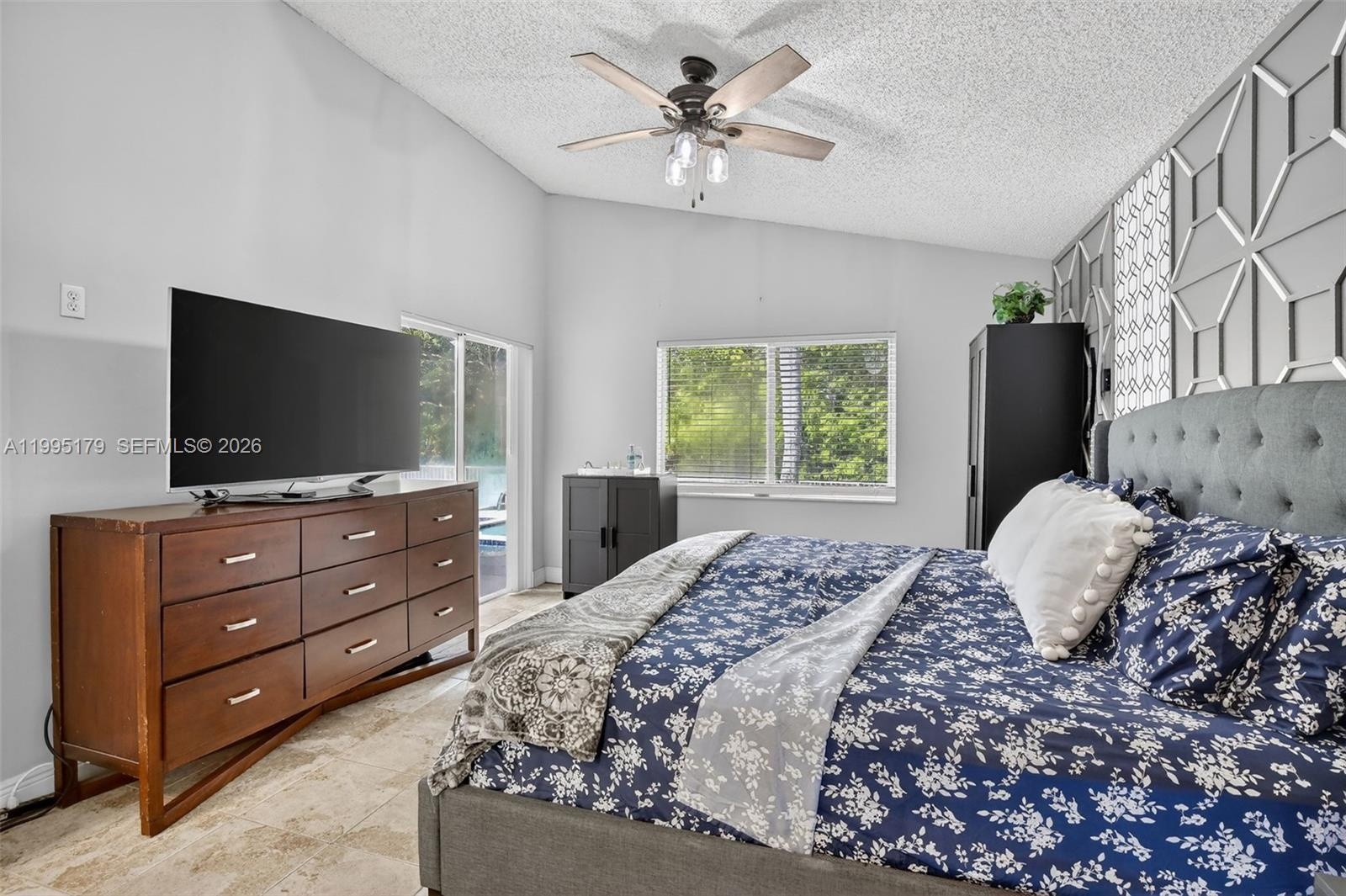 This beautifully maintained residence features a contemporary open floor plan with vaulted ceilings and elegant finishes throughout. The home includes travertine flooring in the bedrooms, a fully remodeled kitchen with Taj Mahal quartzite countertops, a Beluga herringbone marble backsplash, stainless steel Whirlpool appliances (2020), and under-cabinet lighting.