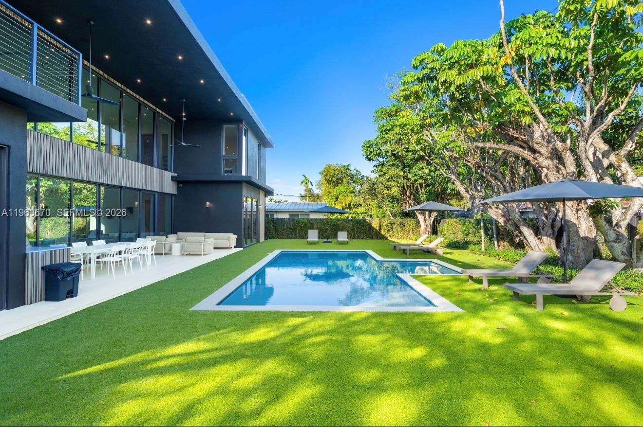 and an abundance of natural light. Outside, there's a generous backyard with a stunning pool
