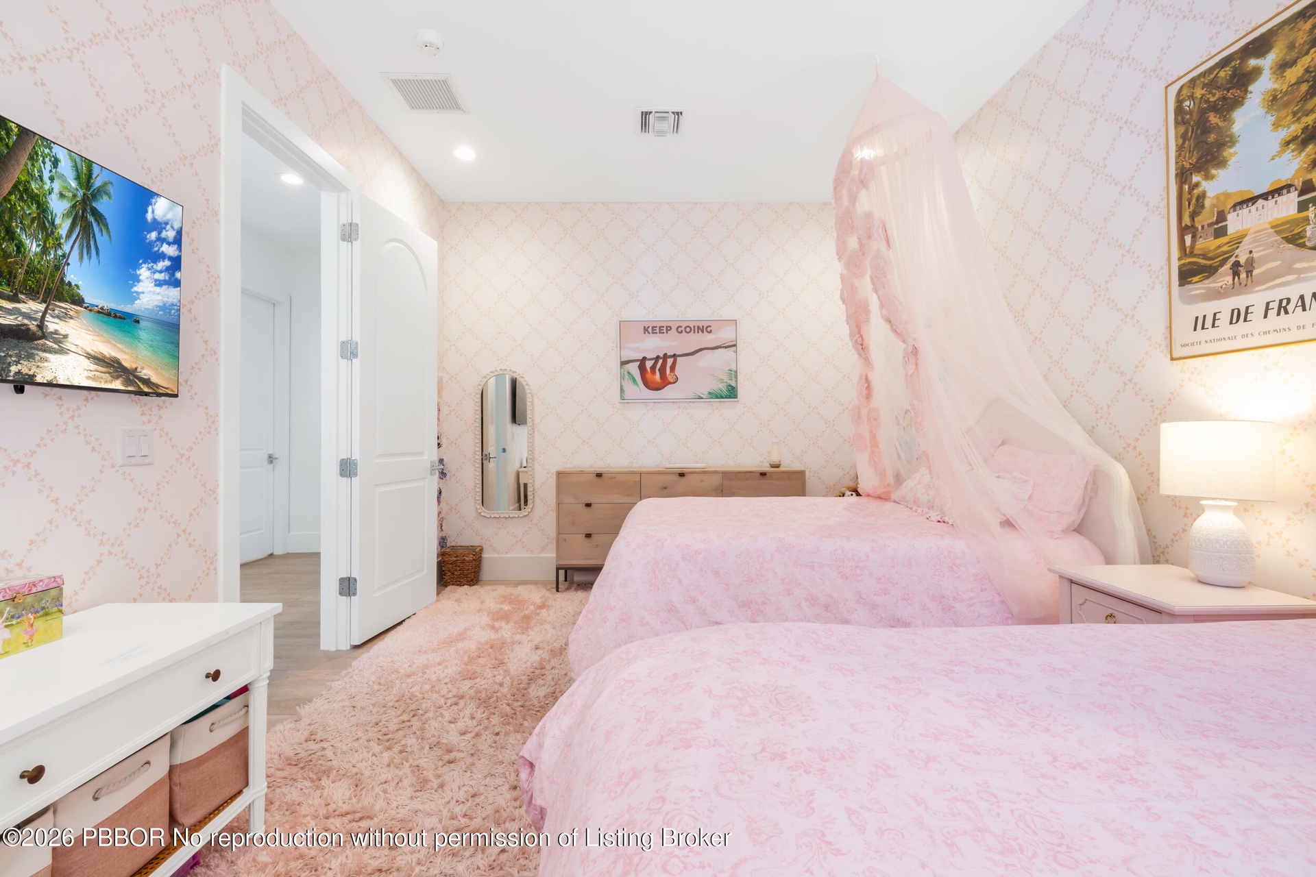 The lower level offers two bedrooms sharing a Jack-and-Jill bathroom, a third en-suite bedroom, and a private office tucked just off the family room. The VIP suite downstairs functions as a luxurious poolside retreat, complete with a cabana bath offering direct pool access and serene views of the tropical outdoor oasis.