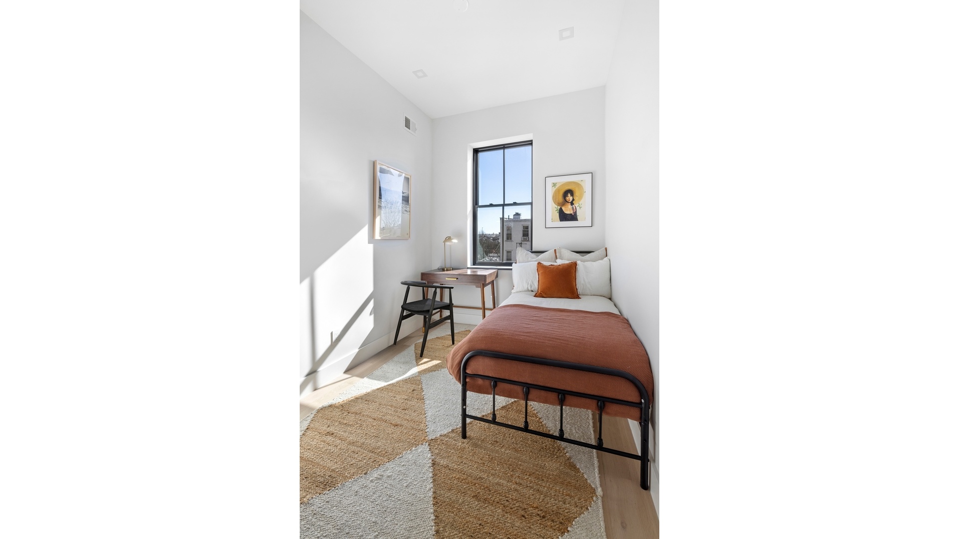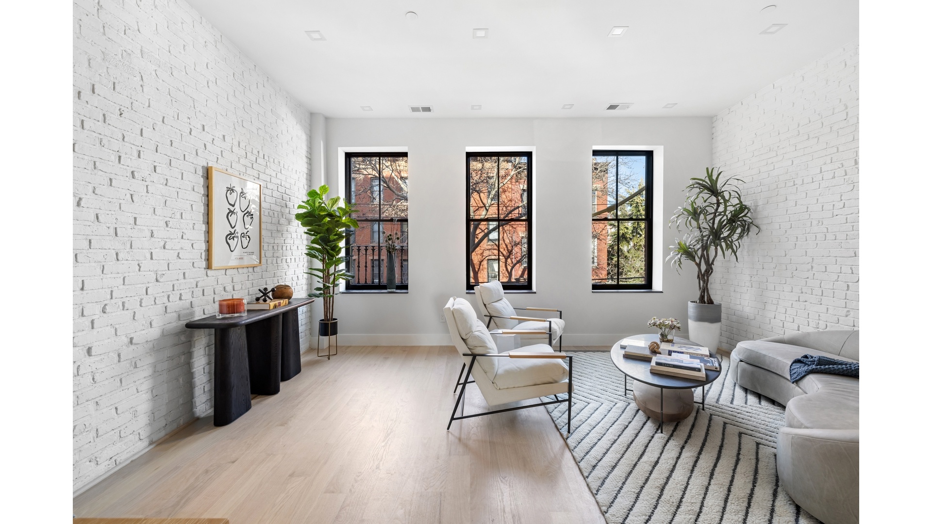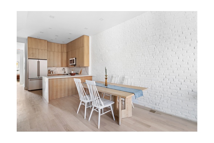 Unit Two's layout prioritizes natural light, with each room bathed in sunlight throughout the day thanks to the home's oversized windows. These also offer lovely open views of both sky and the tranquil tree-lined street. The main great room features a clean white palette, with high ceilings, exposed original brick walls and hardwood floors. The spacious living room flows into an ample, open dining area. Home cooks will revel in the airy kitchen, with the GE Caf Series appliance package, white Caesarstone countertops, and beautifully custom-crafted wood cabinetry.