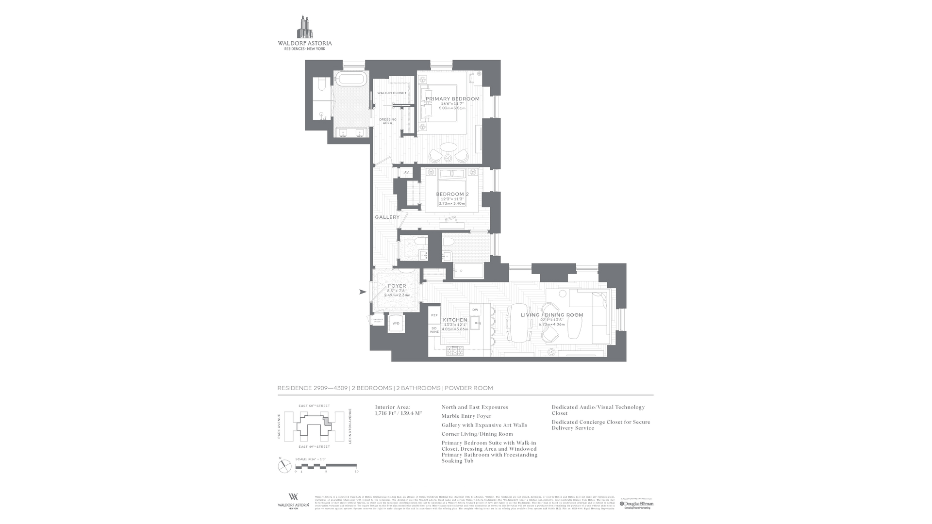 Own a piece of the legacy at Waldorf Astoria Residences New York. Residence 4309 is a 1,716 SF, corner two-bed, two-and-a-half-bath, with north and east exposures.