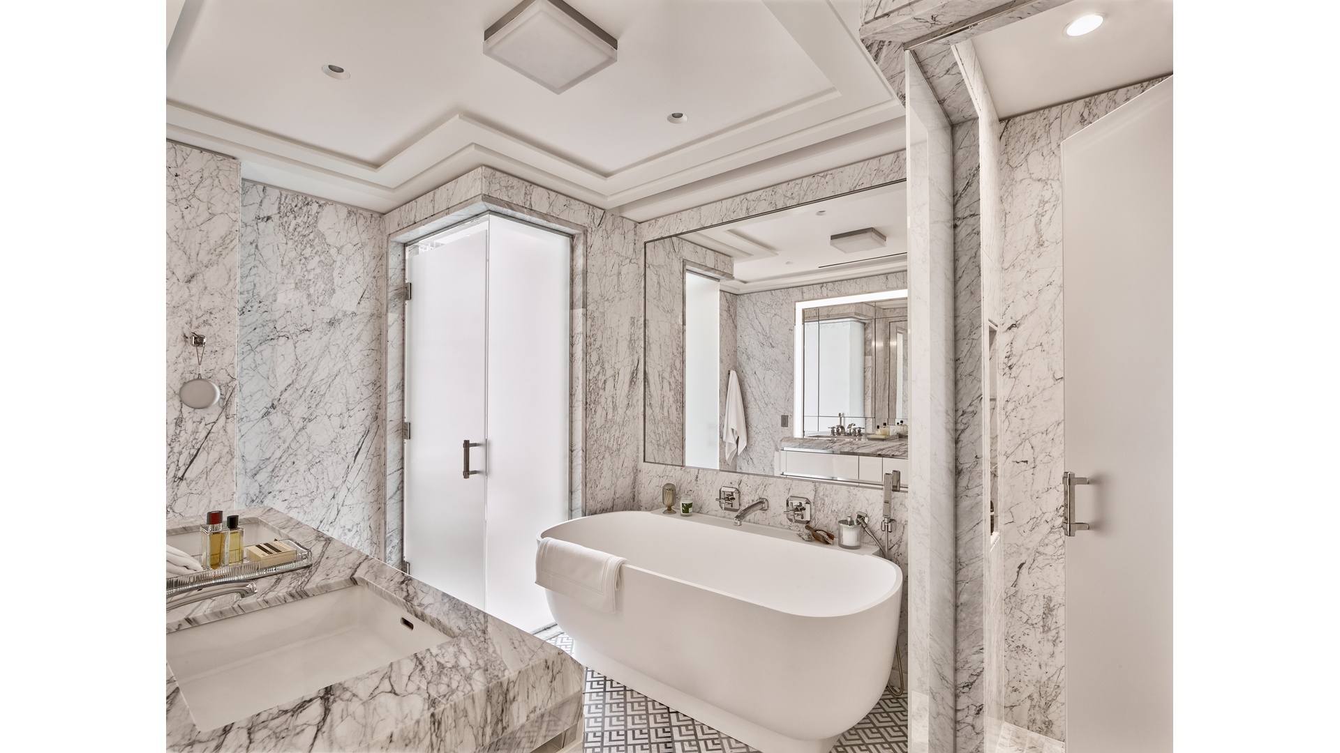 The primary bedroom has a walk-in closet and dressing area. The windowed five-fixtured bathroom features floor-to-ceiling honed white Bianca Carrara marble slab walls and radiant heated custom designed mosaic marble tile floor. A custom double vanity with polished Luna Gray marble countertop, elegant stainless-steel legs, and integrated lighting provides exceptional storage complementing the cabinet with integrated lighting, mirror and concealed electric outlet. The freestanding custom designed deep soaking tub offers a thoughtful shelf and sits below a large custom wall mirror featuring fixtures and fittings that are custom forged in polished nickel, exclusively for Waldorf Astoria Residences.