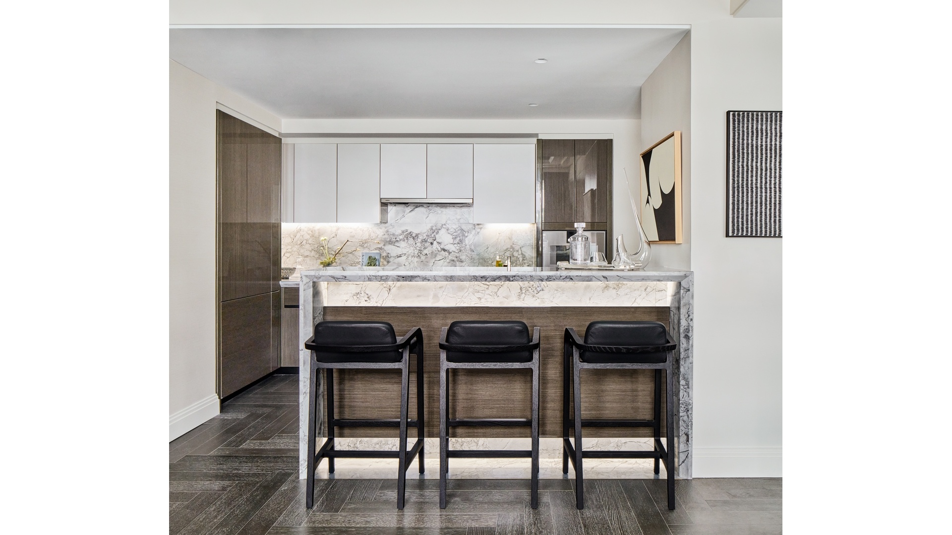 The open kitchen features wood and lacquer cabinetry custom-designed by Deniot and fabricated by Molteni&C, cleverly concealing a top-of-the-line appliance suite by Gaggenau that includes a five- burner gas cooktop with oven and fully vented range hood, separate refrigerator and freezer, wine refrigerator, speed oven and dishwasher, Polished Quartzite Arabescato backsplash and countertops with beveled edges are enhanced by polished nickel fixtures.