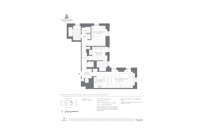Own a piece of the legacy at Waldorf Astoria Residences New York. Residence 4309 is a 1,716 SF, corner two-bed, two-and-a-half-bath, with north and east exposures.