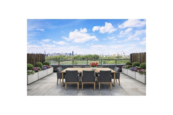 The apartment boasts a remarkable layout that includes a private outdoor space and an oversized terrace, perfect for enjoying serene moments with open views of the surrounding area. The kitchen is equipped with high-end Subzero and Miele appliances, catering to both culinary enthusiasts and everyday cooking needs. Designer limestone and Italian porcelain baths add luxury to the space, while Brazilian walnut floors provide warmth and timeless beauty.